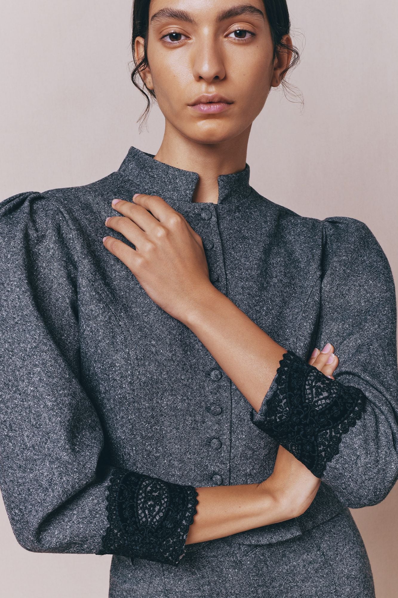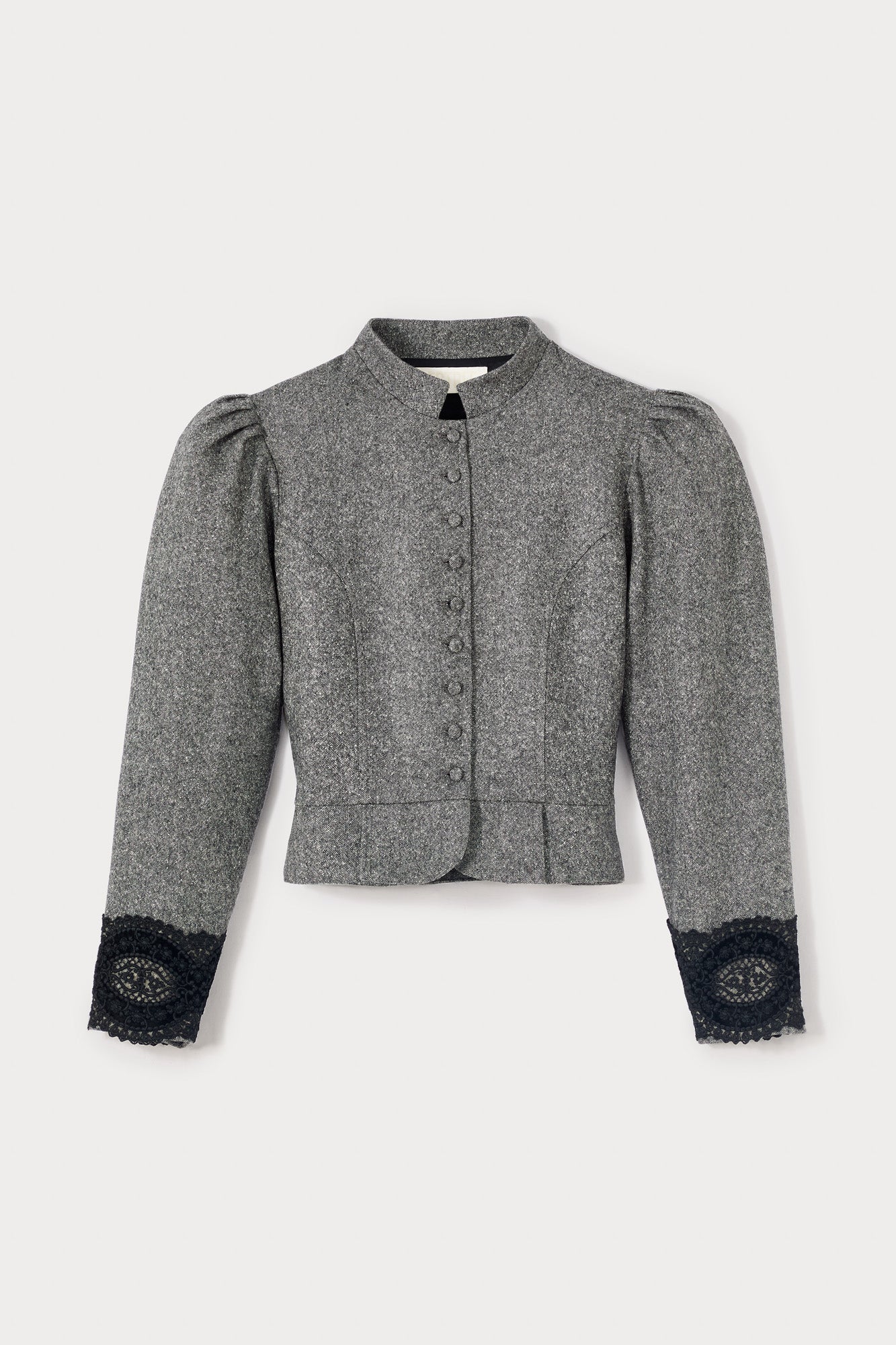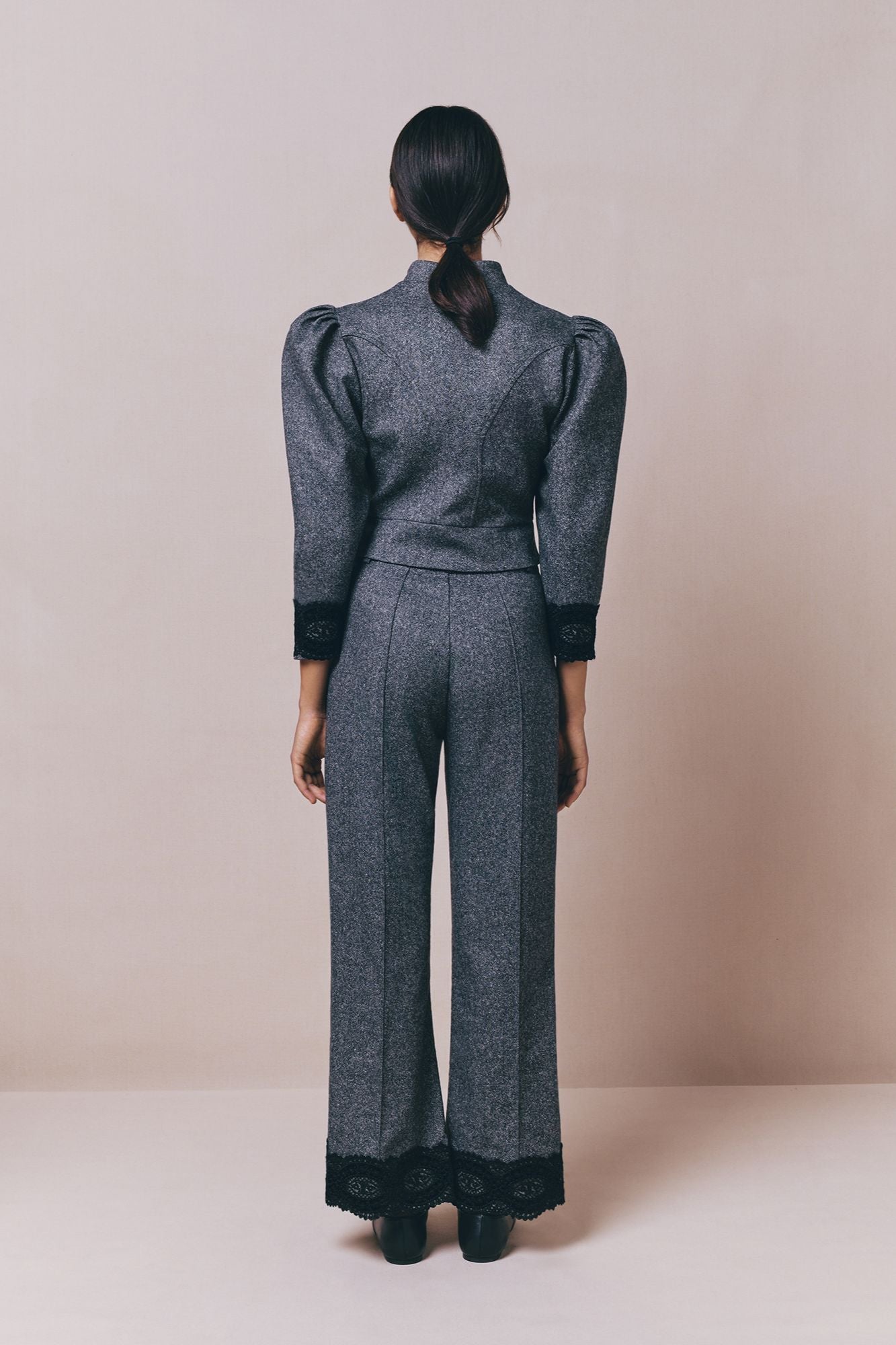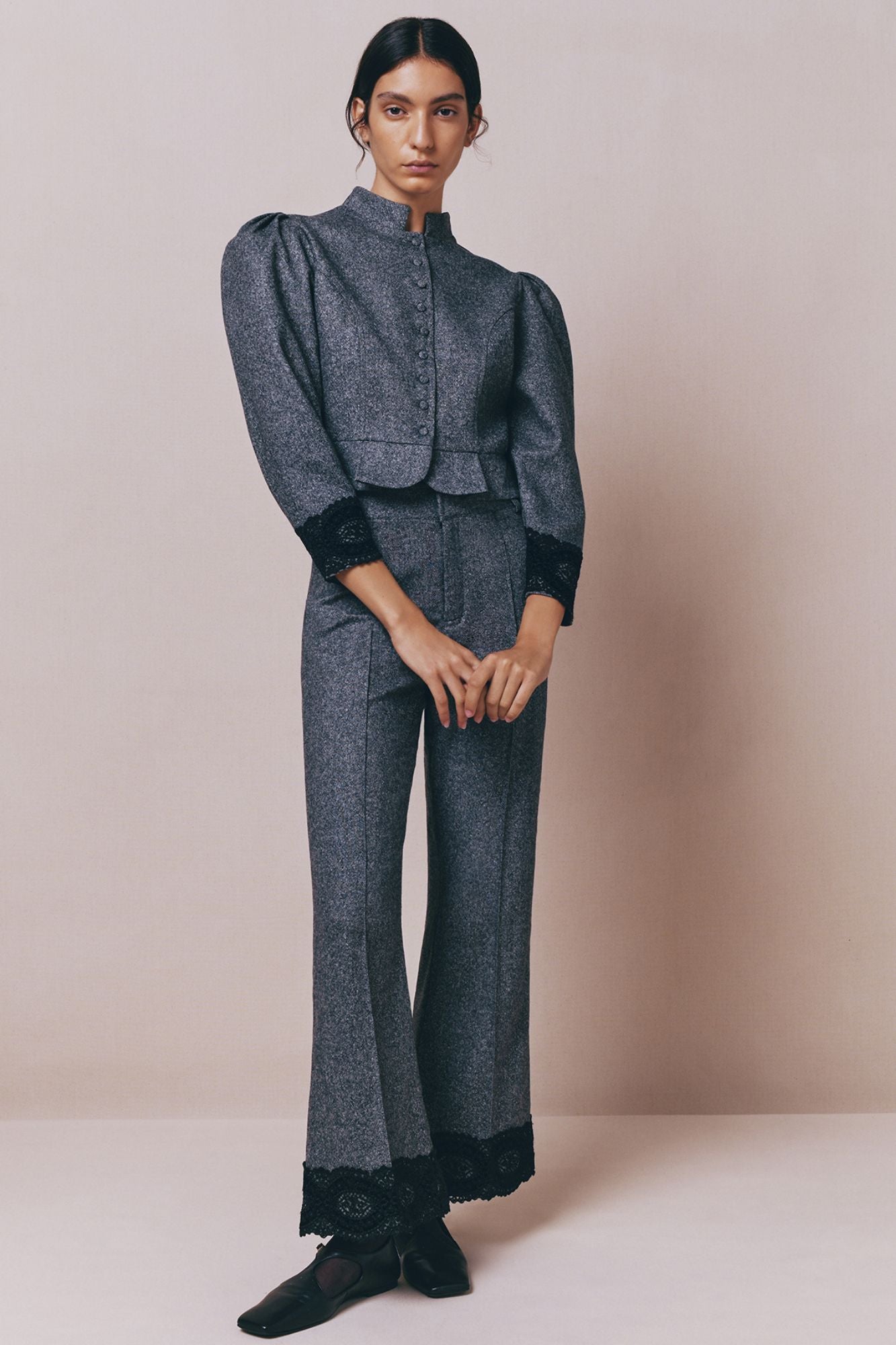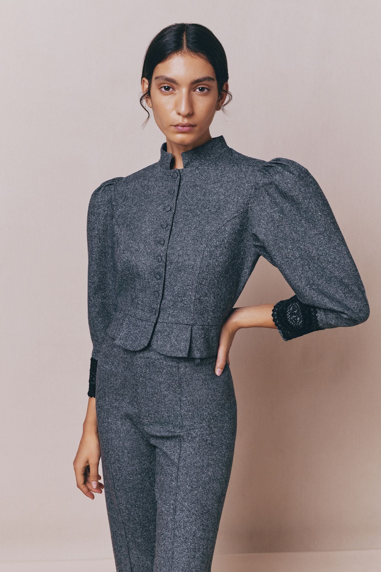 Refined jacket in grey flannel, featuring puff sleeves and delicate lace cuffs for a touch of femininity. A structured silhouette that blends elegance with modern tailoring.