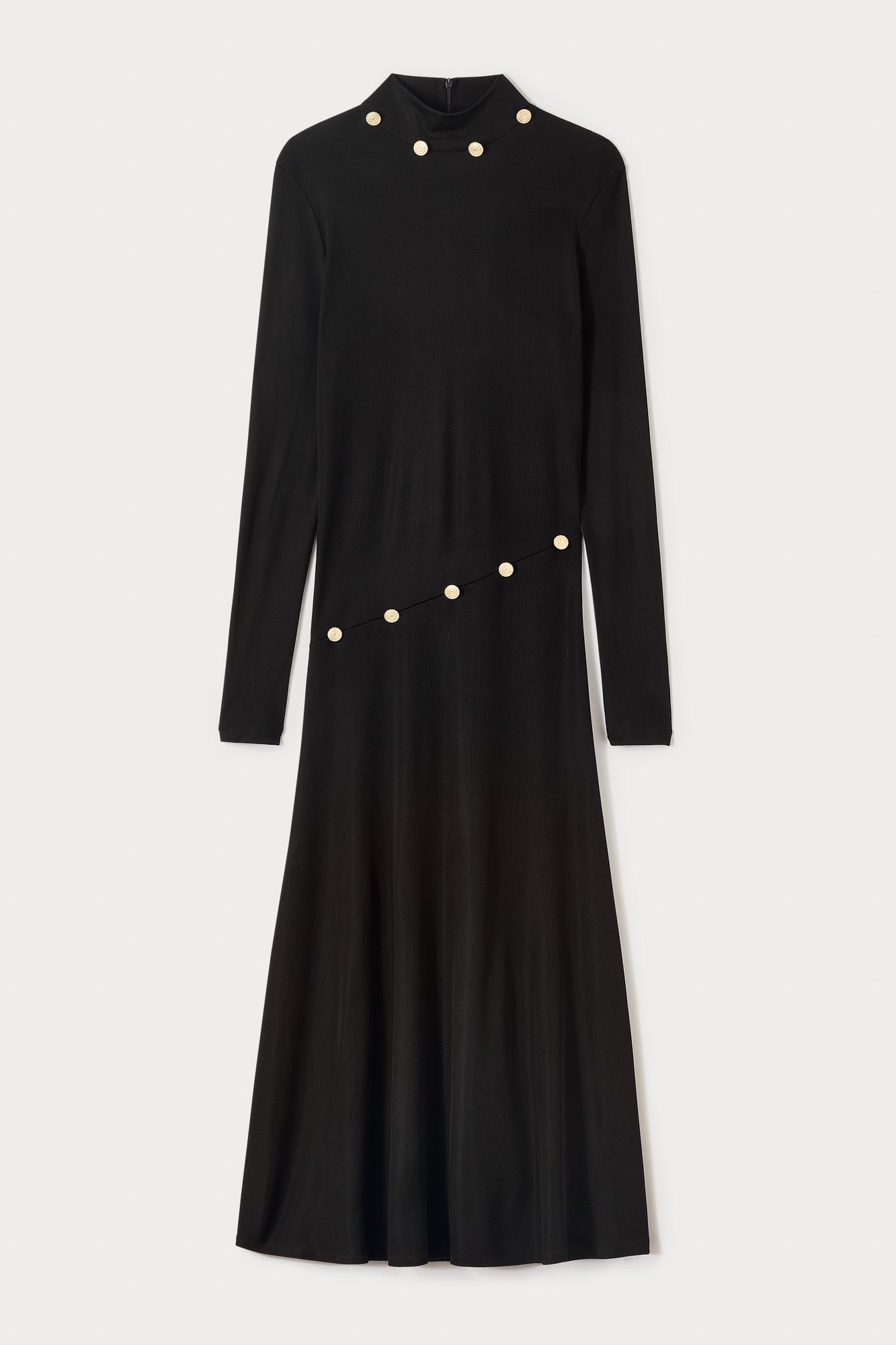 This refined black long-sleeve dress combines modern elegance with timeless details, featuring a high neckline and decorative buttons for a sophisticated finish.