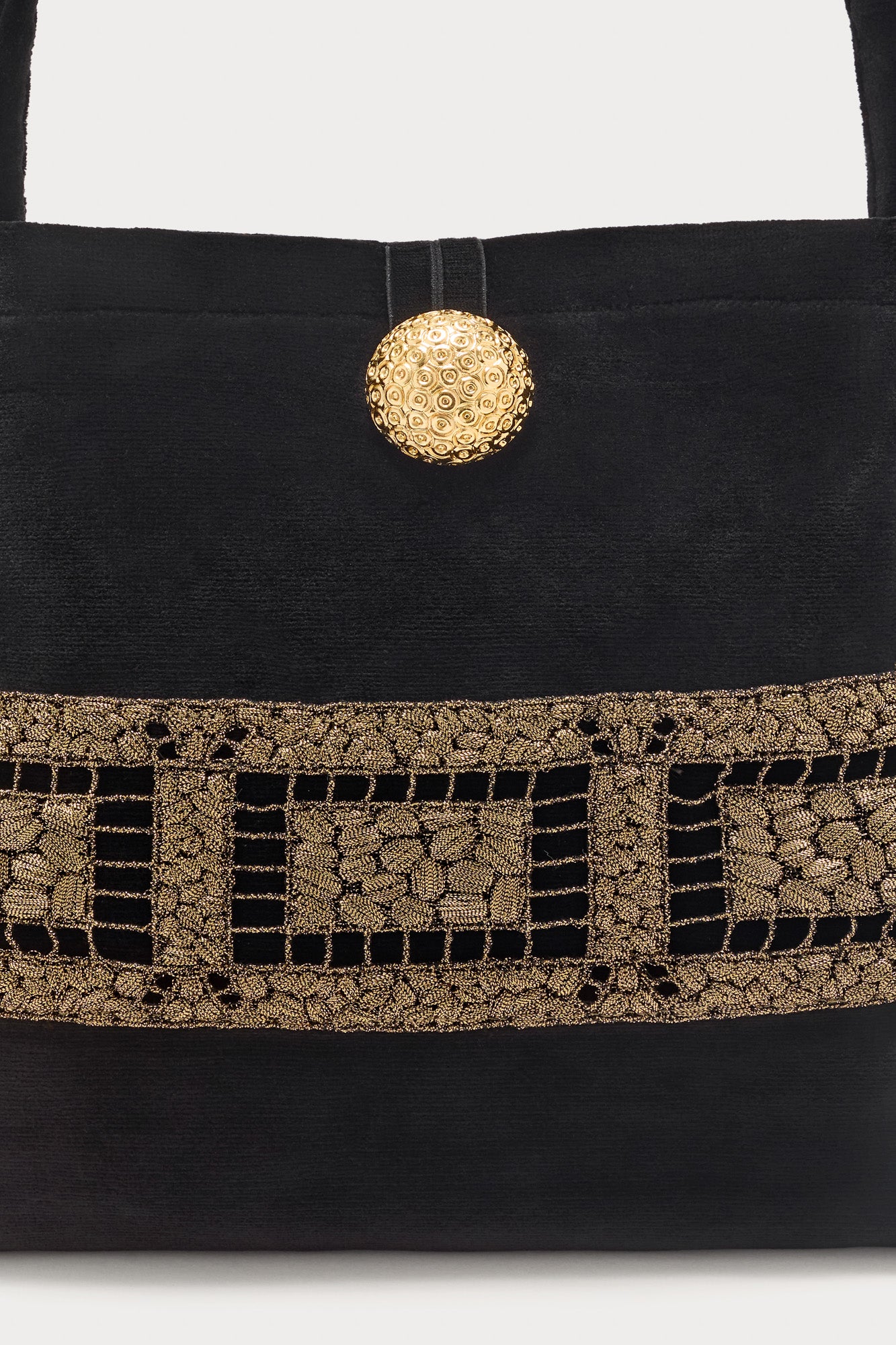 Elegant black velvet bag featuring intricate golden embroidery and a sculptural silhouette. Crafted from a refined blend of cotton and polyamide, it combines softness and structure. The decorative button closure adds a touch of sophistication, making it the perfect evening companion to elevate any outfit.