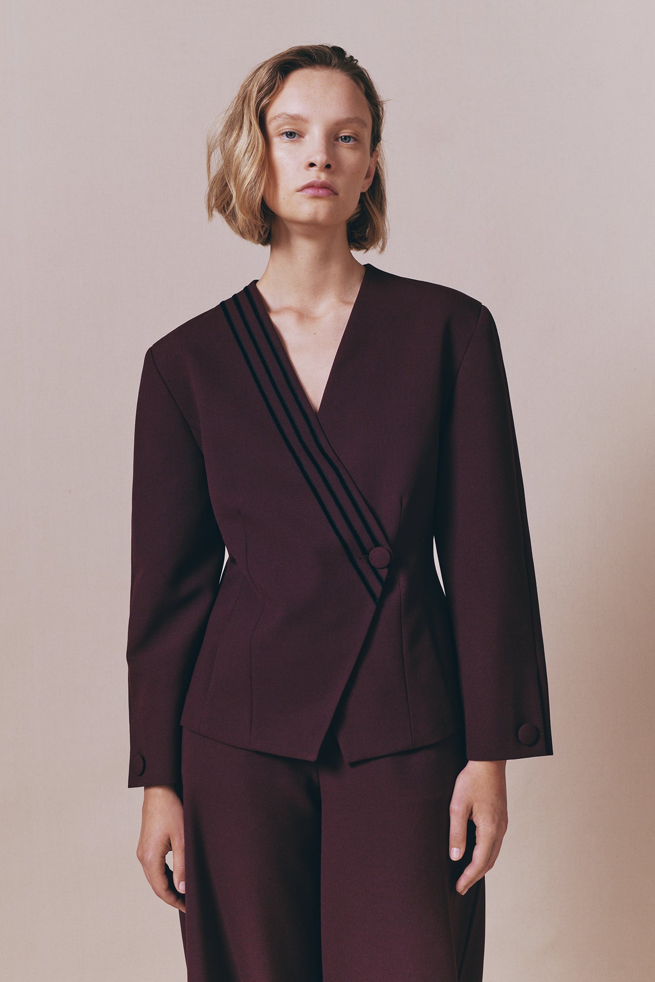 Structured tailored jacket designed with a sharp V-neckline and a double-breasted silhouette that enhances the waist for a refined, feminine shape.