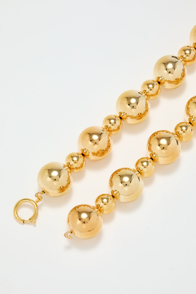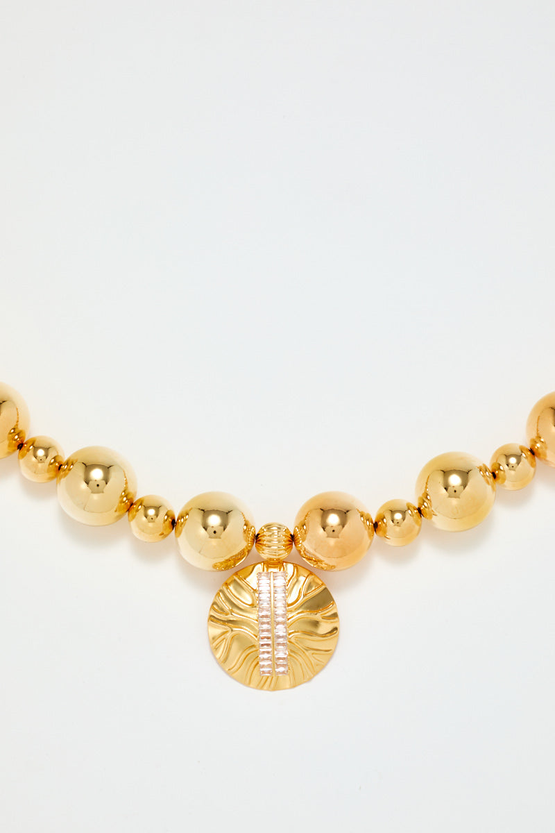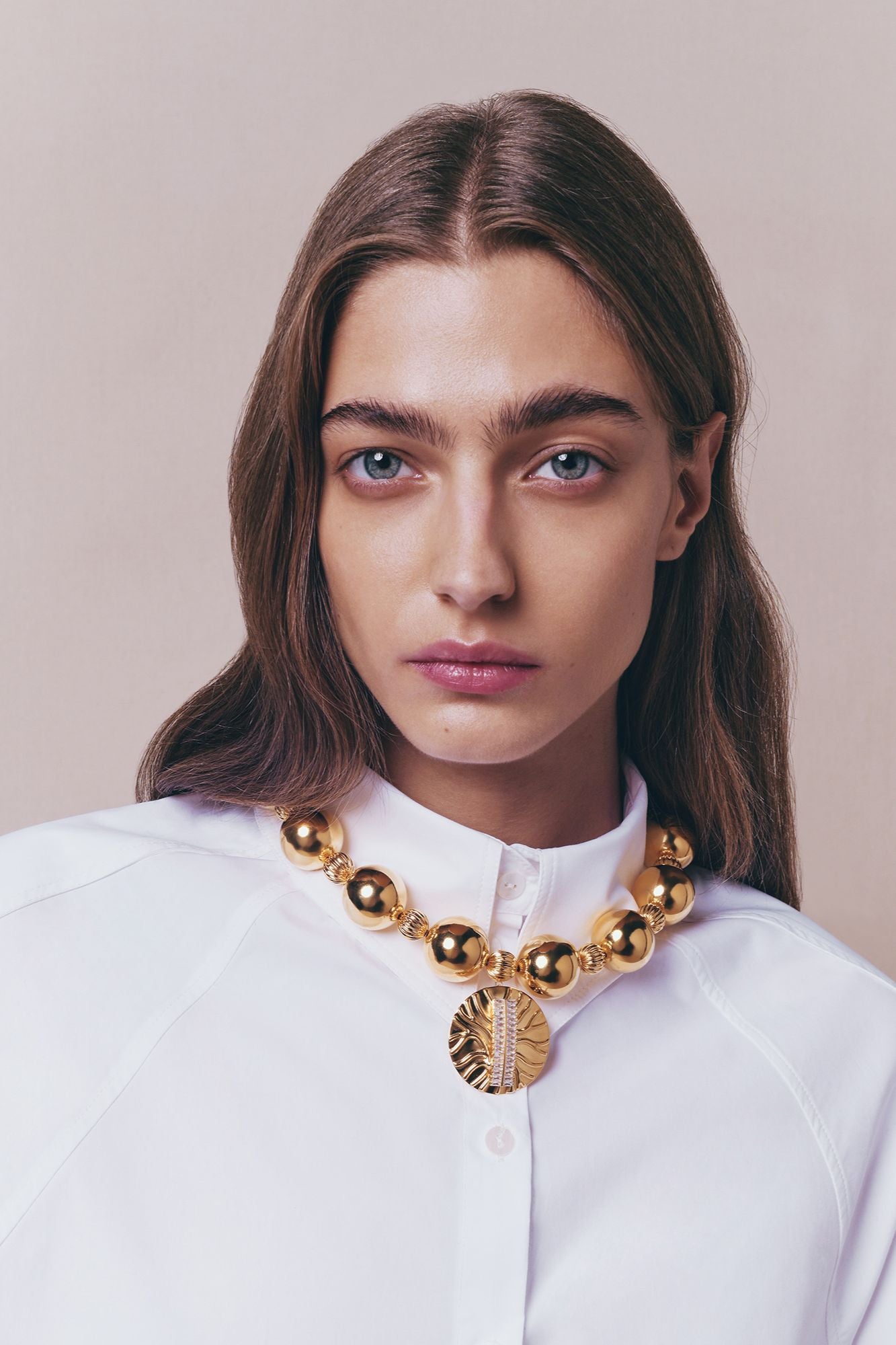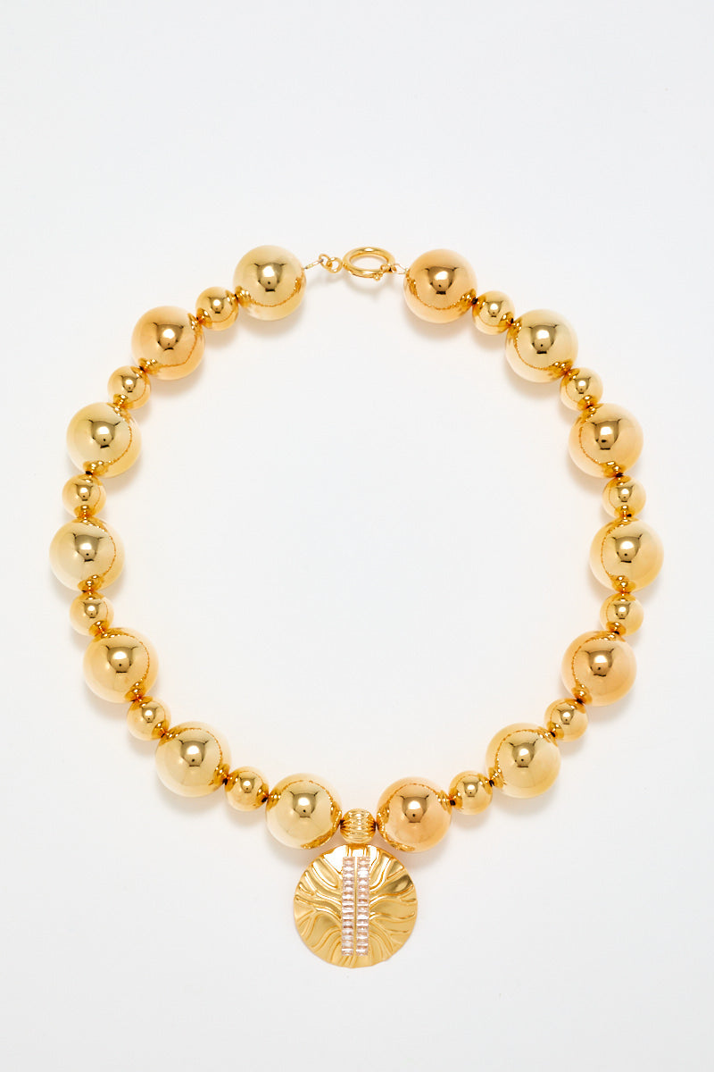 Handcrafted in our Parisian Atelier, the Elizabeth Rib Gold necklace features a composition of polished gold-plated brass beads in sculptural volumes, punctuated by a signature ribbed medallion. At its center, a vertical line of crystal embellishment adds light and structure — a bold yet refined piece that plays with texture and shine.