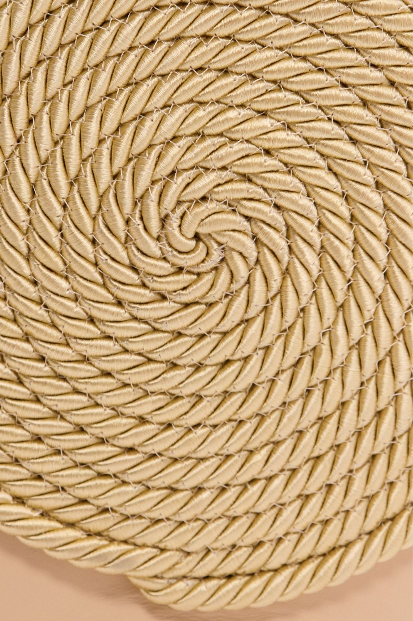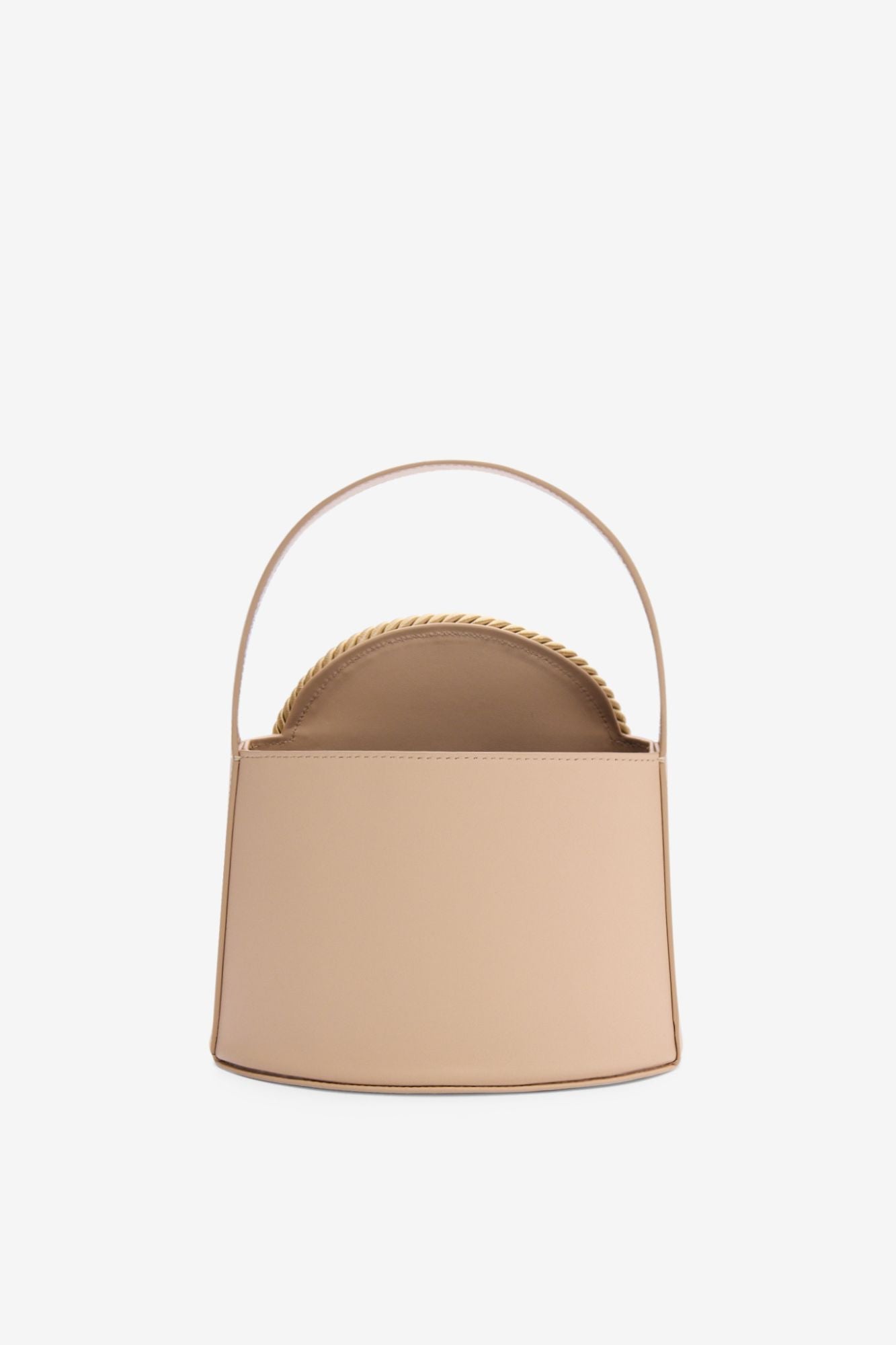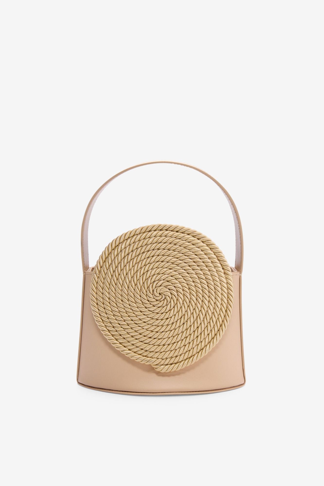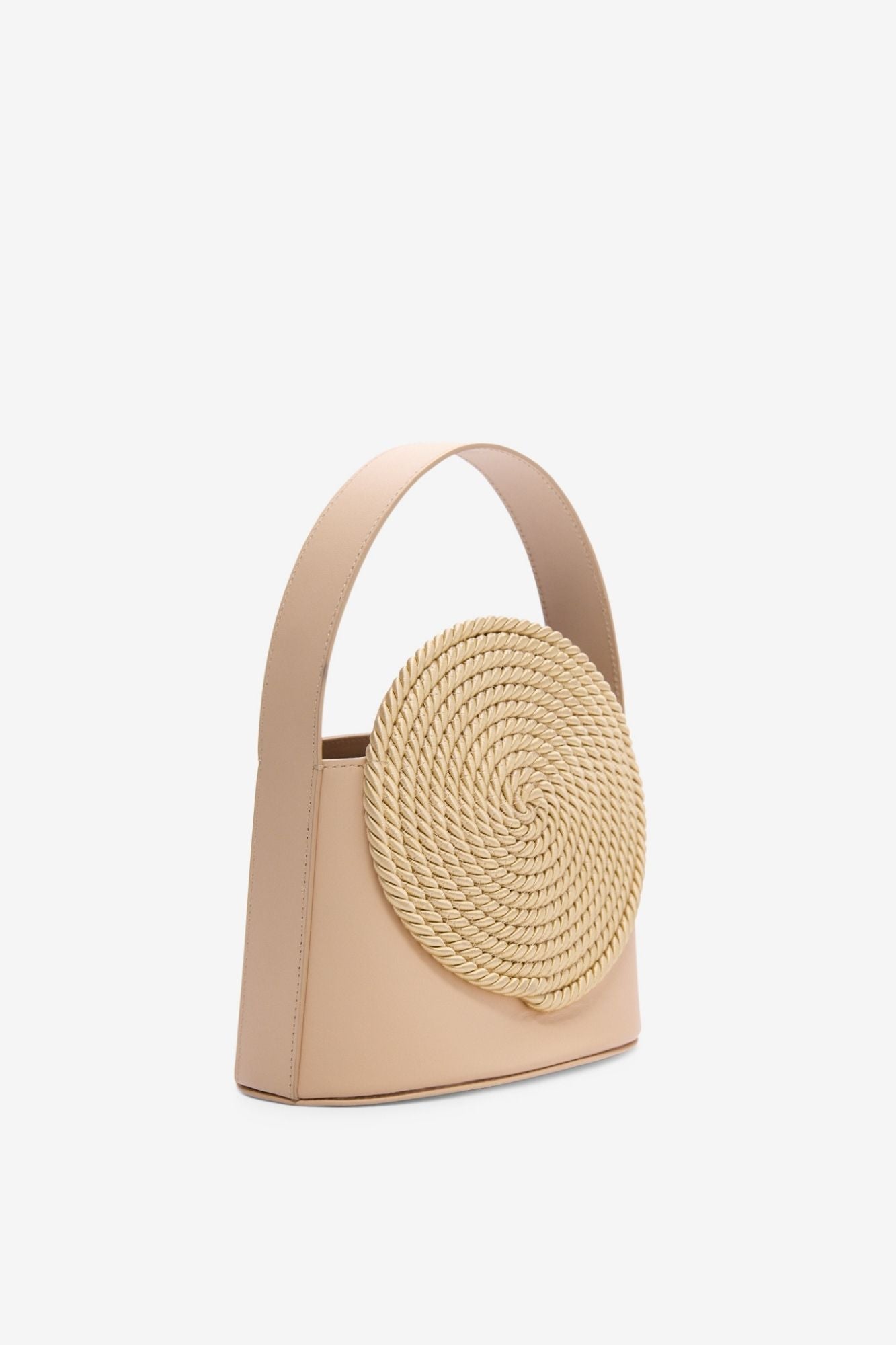 Crossbody bag balancing structure and fluidity. A sculptural silhouette punctuated by a tonal passementerie circle.