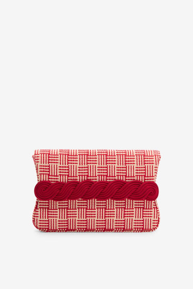 The Gerrit clutch is crafted in textured natural and red colored straw, combines natural-inspired texture with refined craftsmanship. Its soft rectangular silhouette is elevated by a sculptural braided passementerie detail that wraps the front, creating a subtle statement while maintaining effortless elegance.