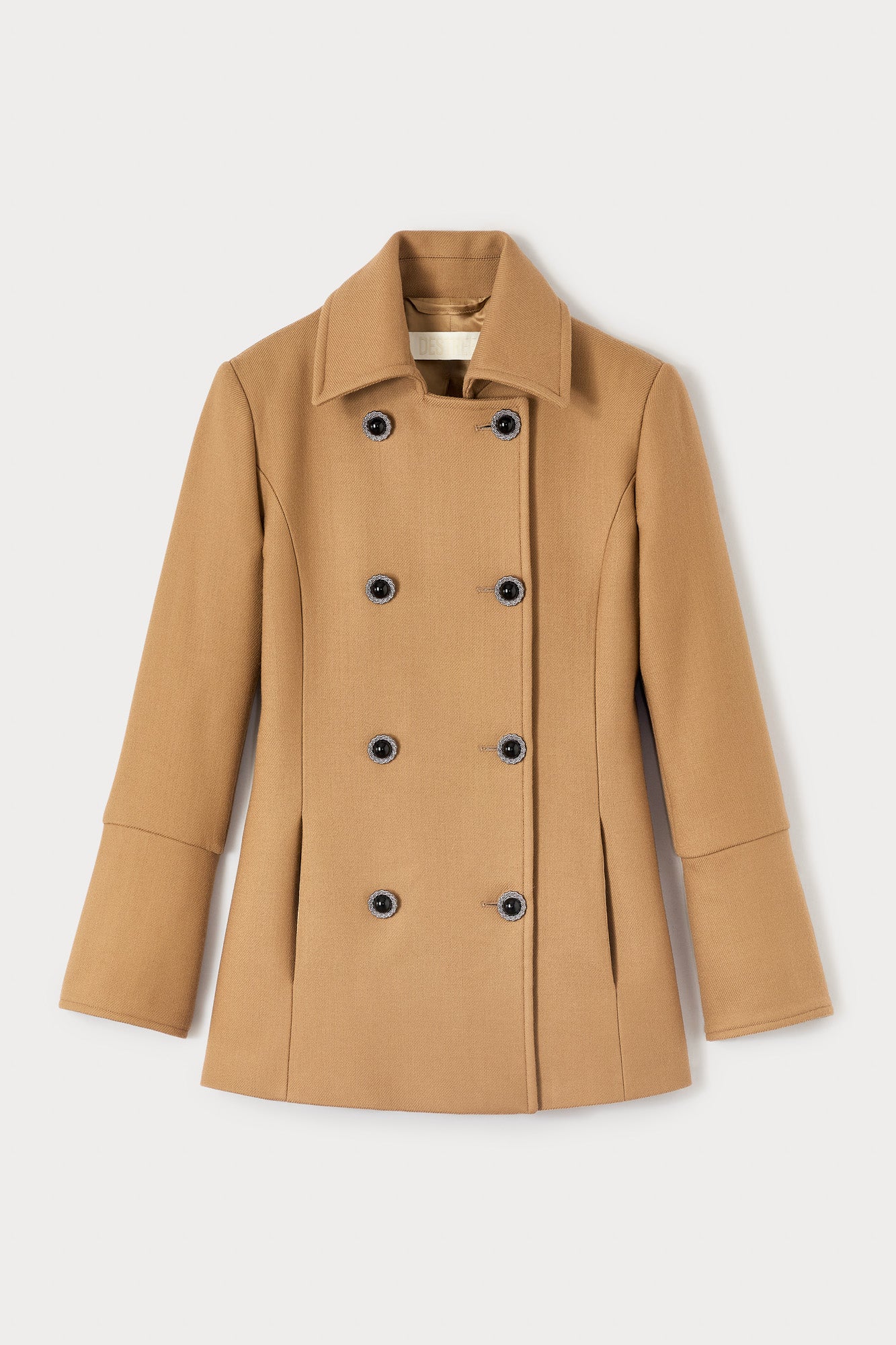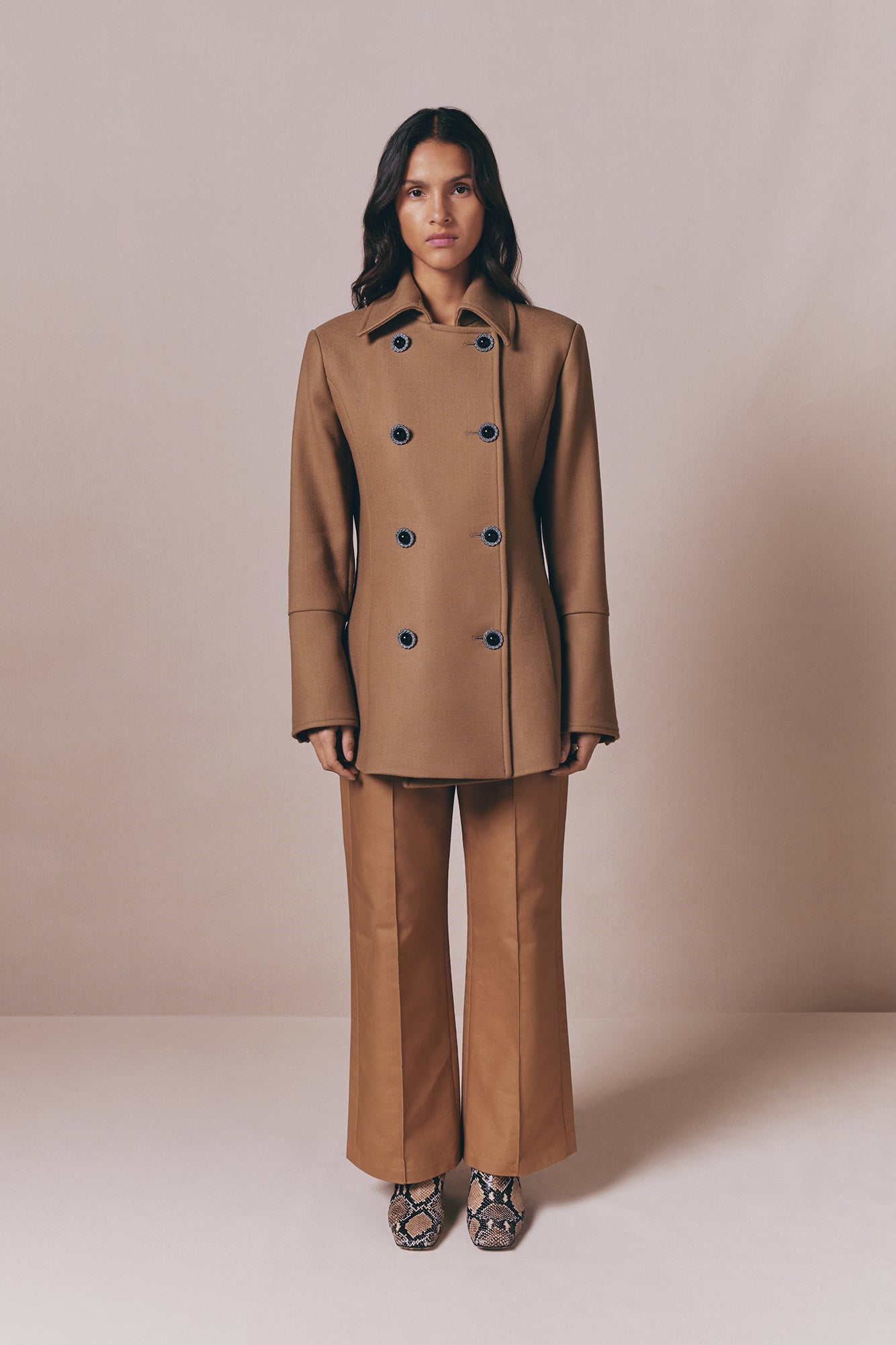Refined camel coat crafted in structured virgin wool, featuring a timeless double-breasted design and sharp tailoring for a polished silhouette.
