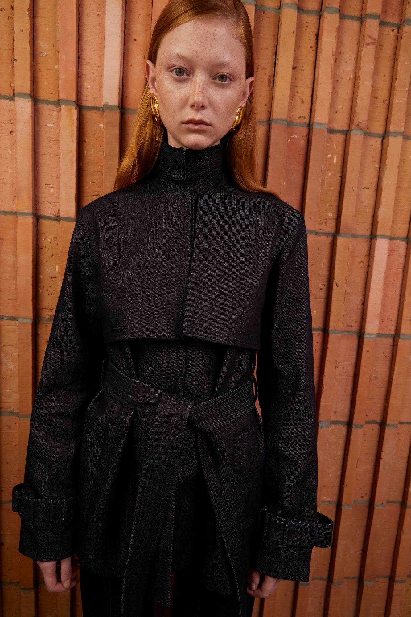- Sophisticated short denim trench coat with a contemporary silhouette.