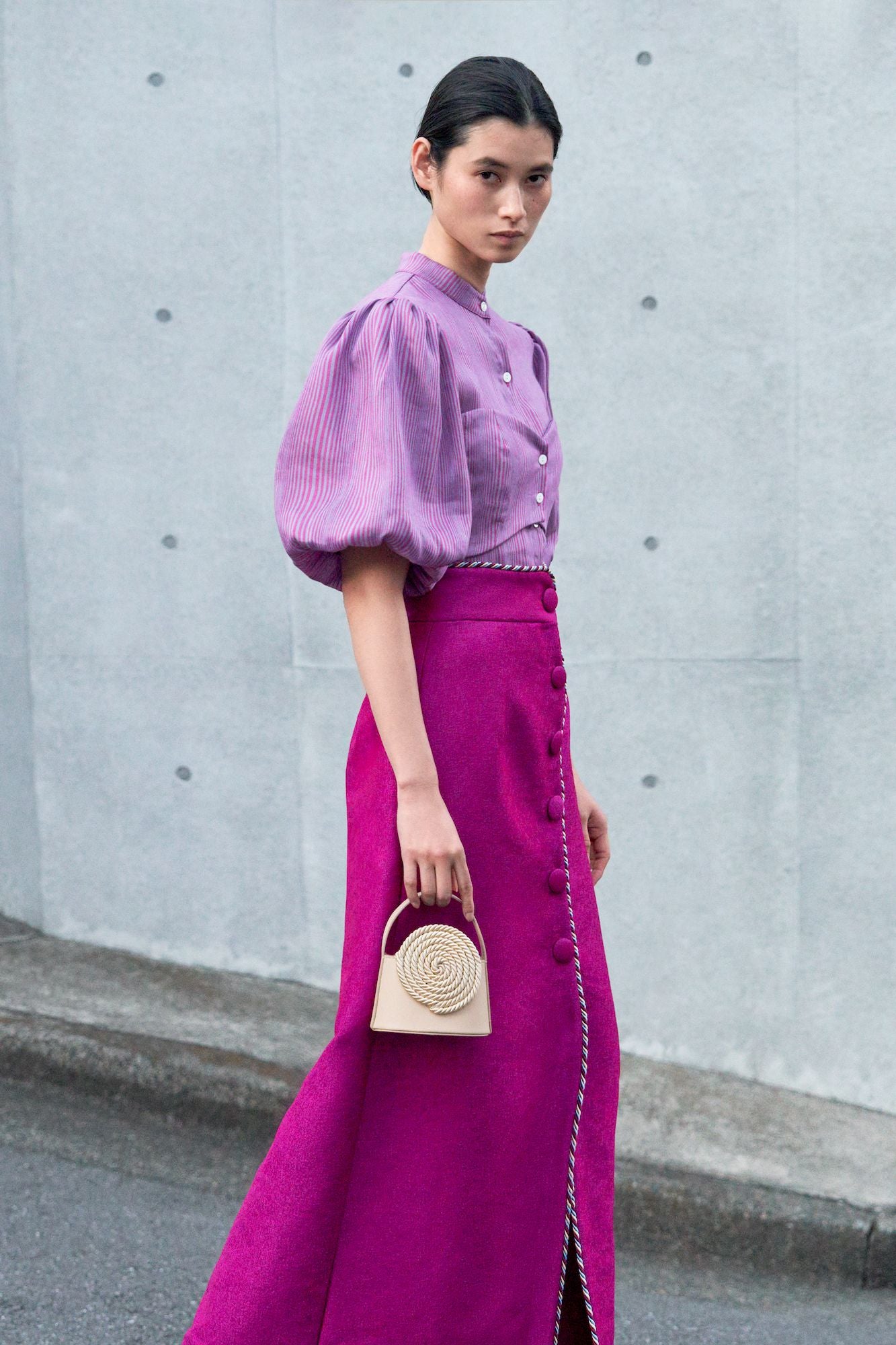 Fuchsia skirt, featuring elegant covered button
