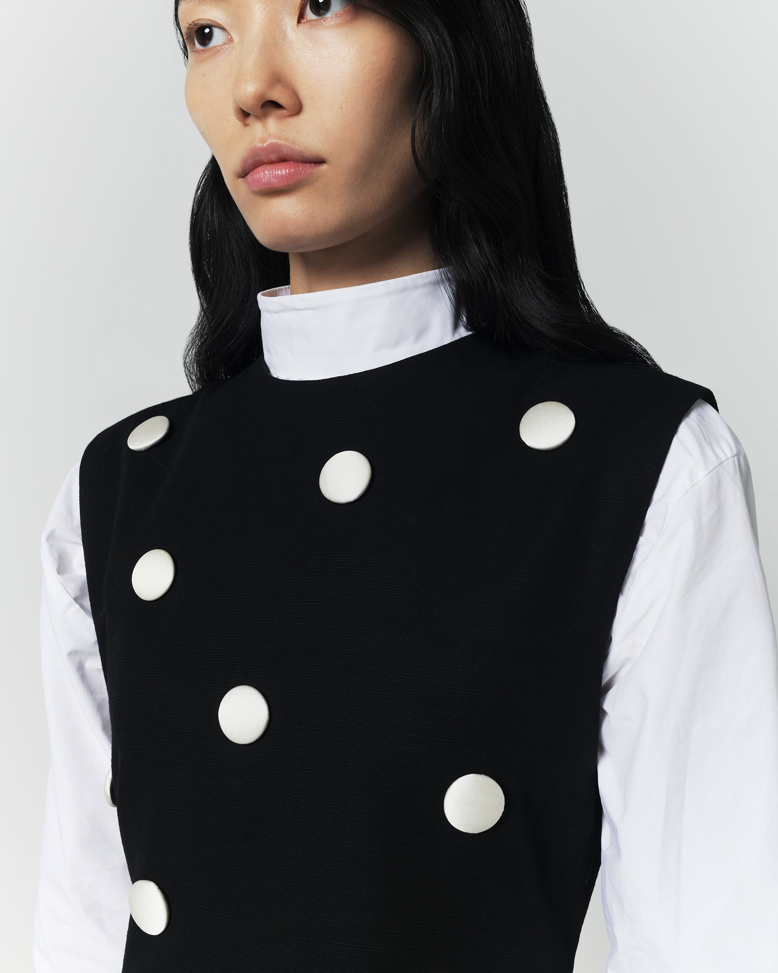This sleeveless dress, crafted from 100% cotton, features a clean straight silhouette enhanced with contrasting dot appliqués for a refined graphic touch. Its understated neckline and minimalist lines create a timeless, versatile elegance suitable for everyday wear or more dressed-up moments.