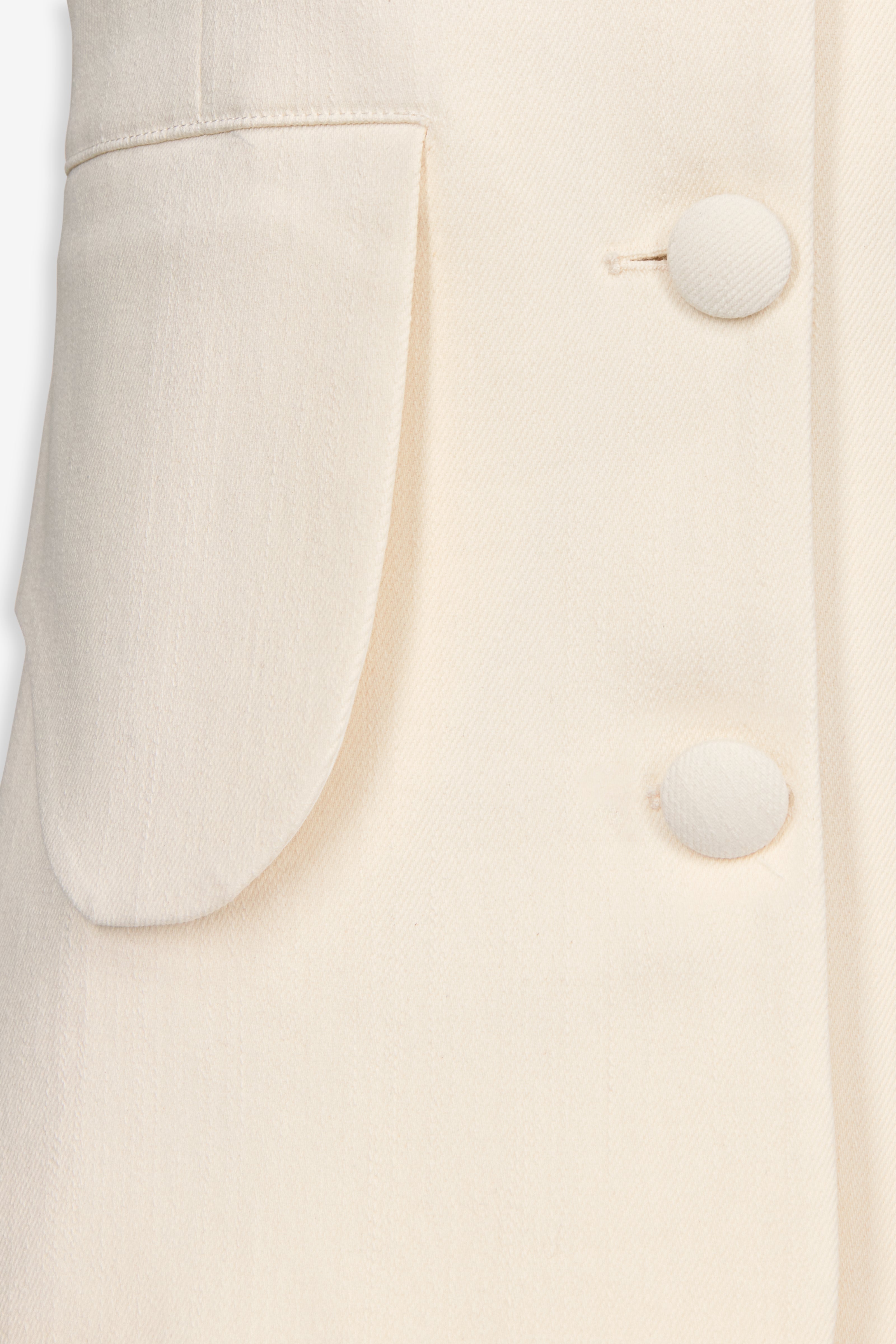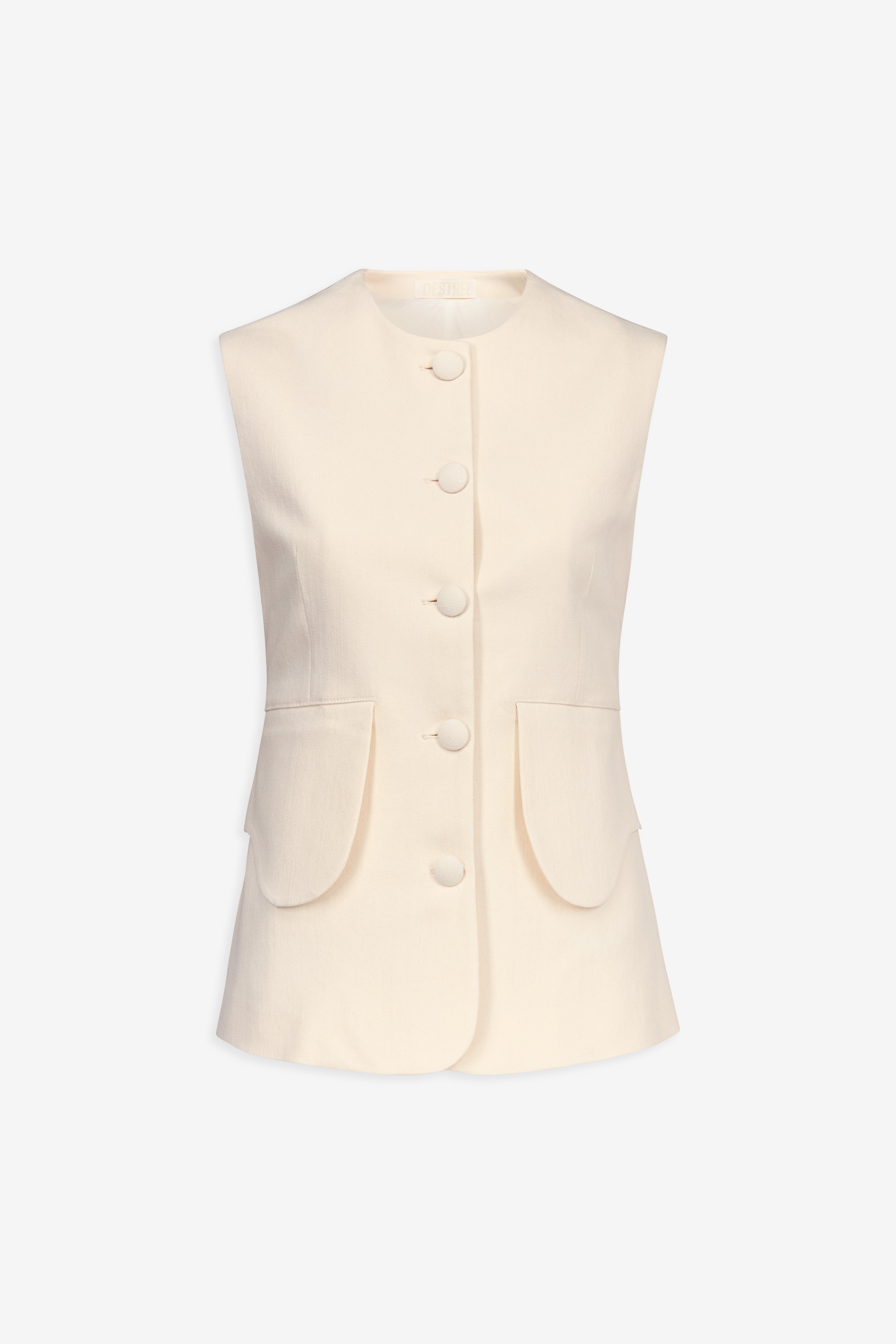 The Sleeveless Buttoned Top is crafted in a soft cream-toned fabric, defined by a clean, tailored silhouette. Its structured cut is softened by rounded patch pockets and tonal covered buttons, offering a refined yet effortless look.