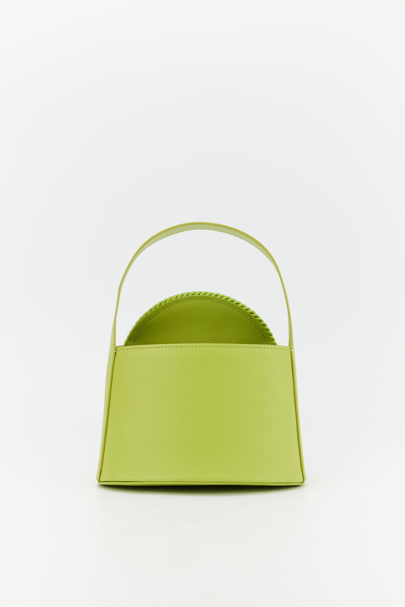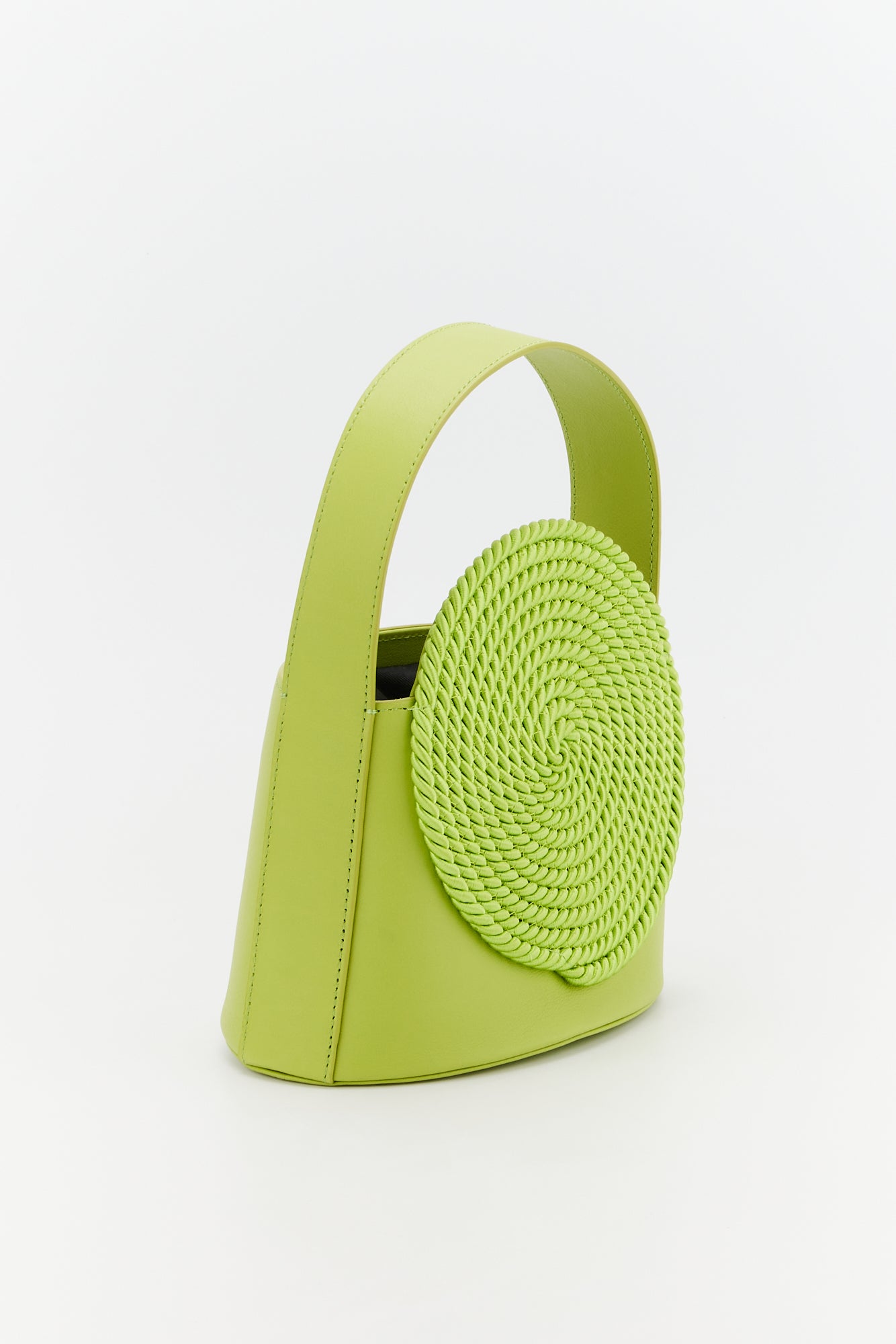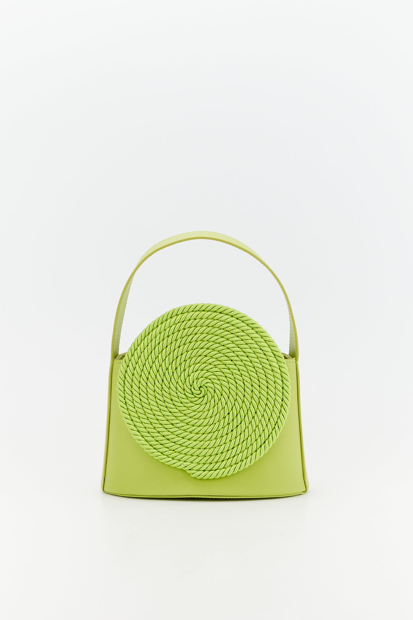 Crossbody bag balancing structure and fluidity. A sculptural silhouette punctuated by a tonal passementerie circle.