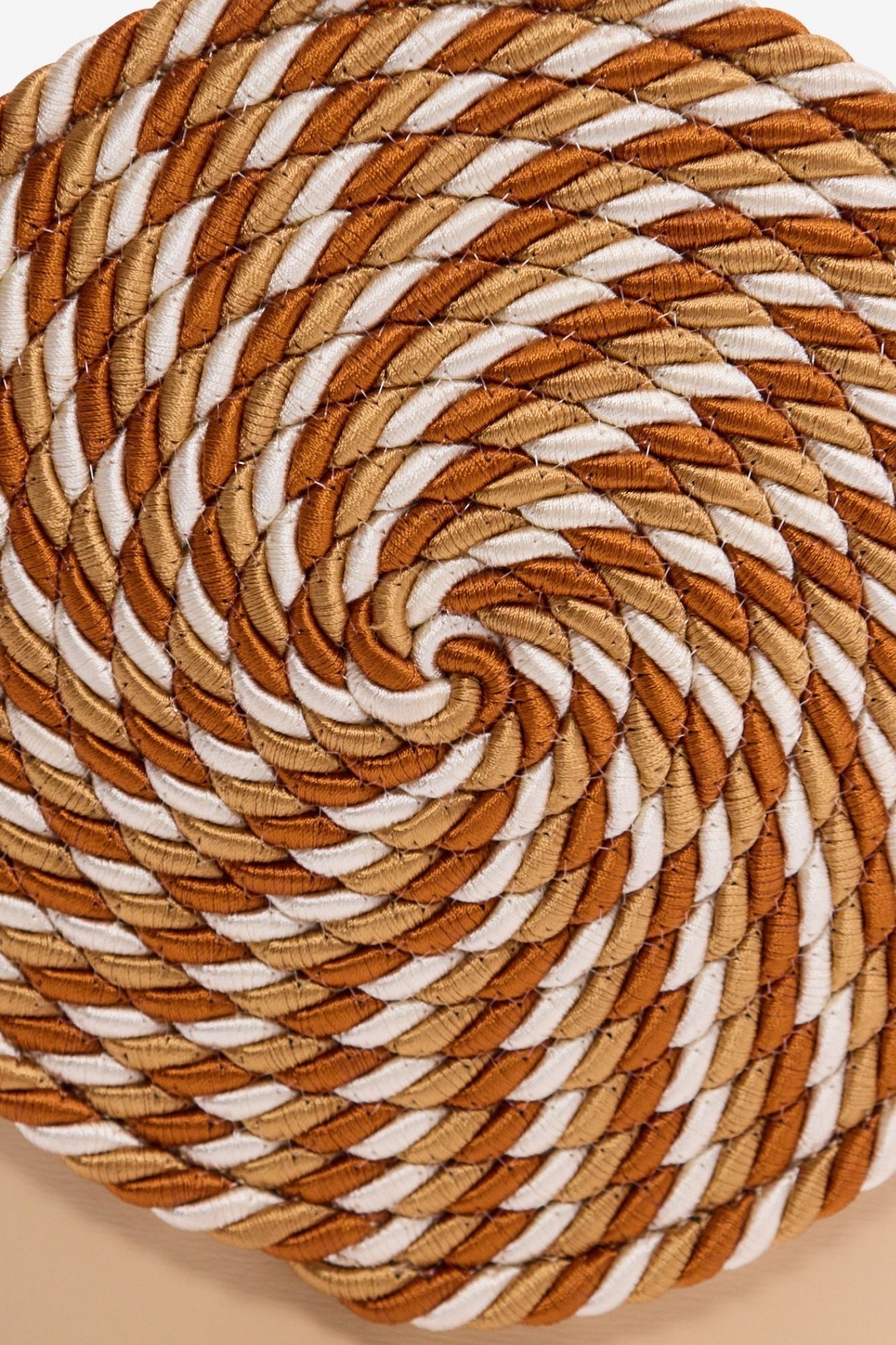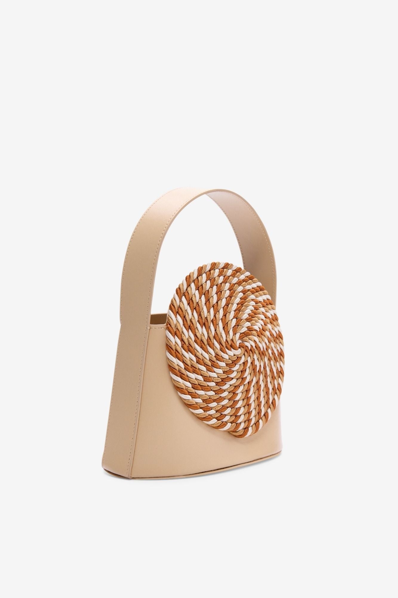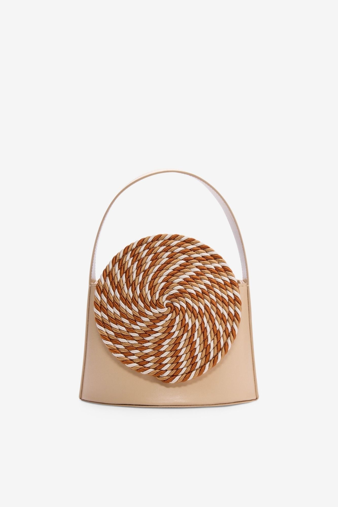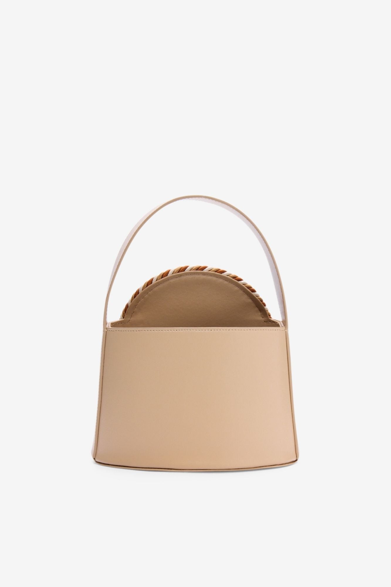 Crossbody bag balancing structure and fluidity. A sculptural silhouette punctuated by a tonal passementerie circle.