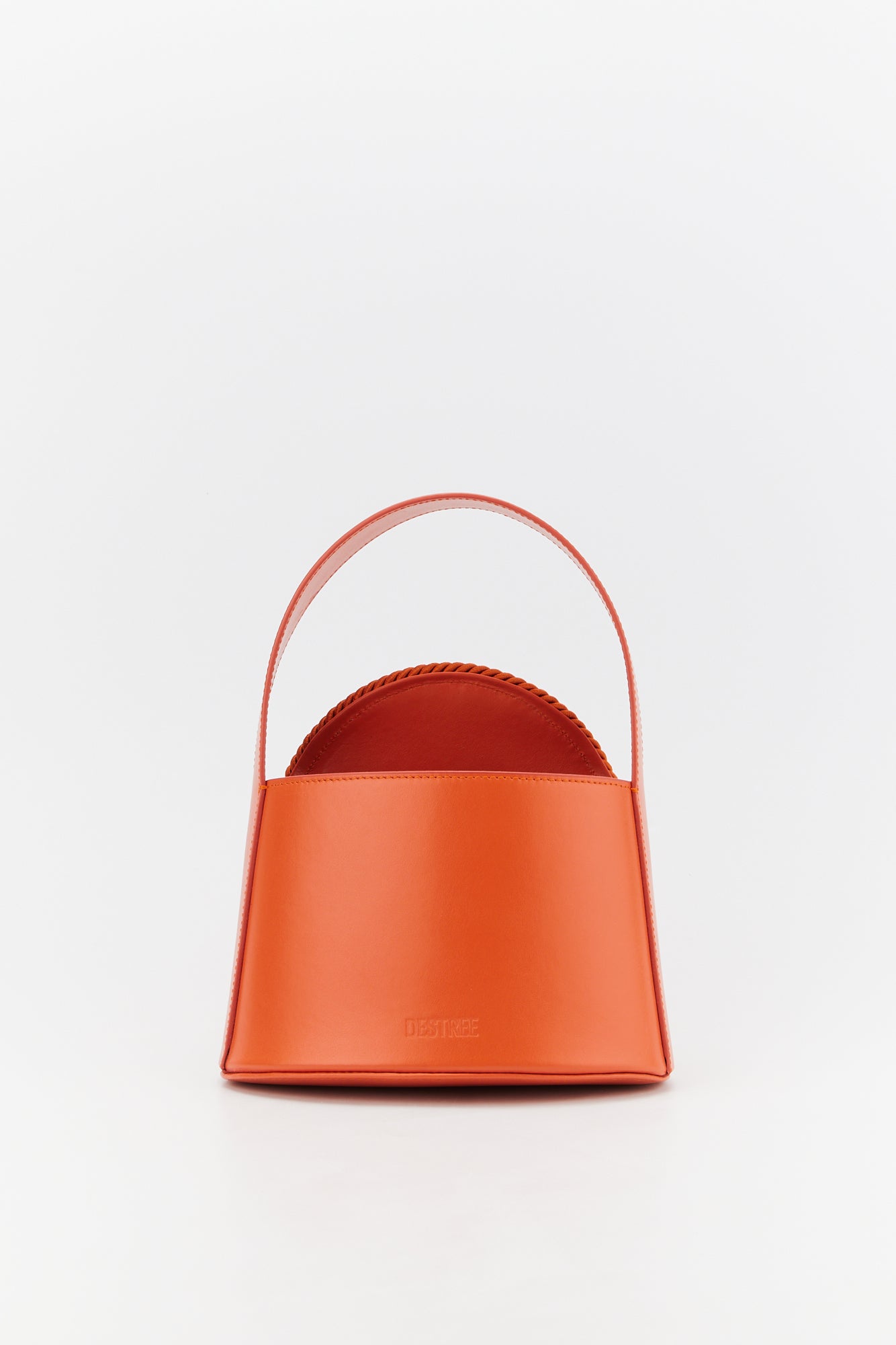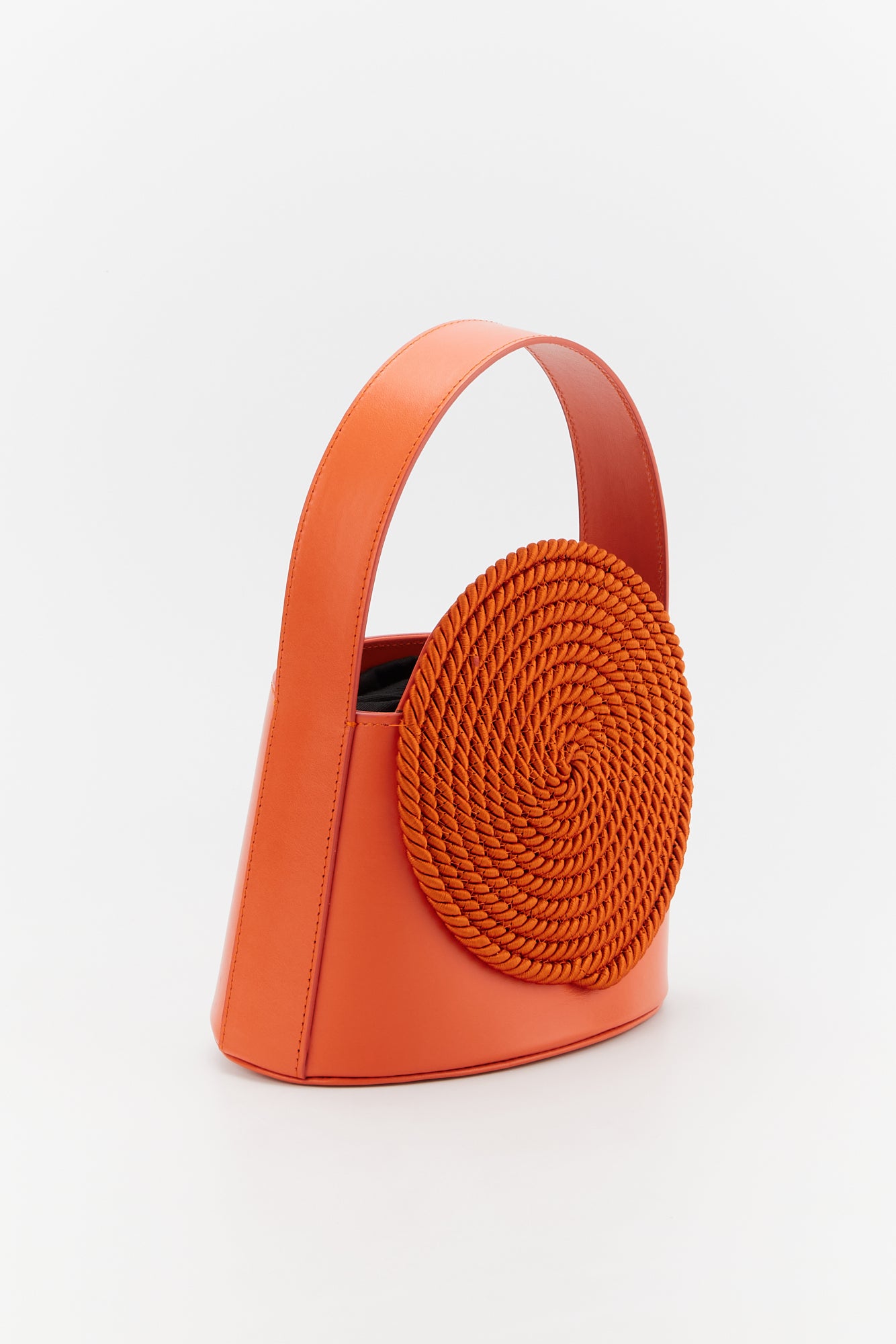 Crossbody bag balancing structure and fluidity. A sculptural silhouette punctuated by a tonal passementerie circle.