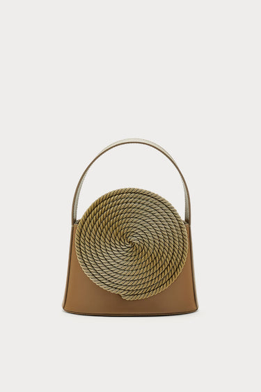 Crossbody bag balancing structure and fluidity. A sculptural silhouette punctuated by a tonal passementerie circle.