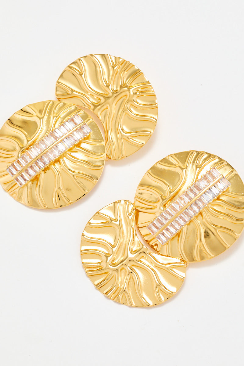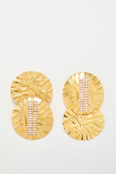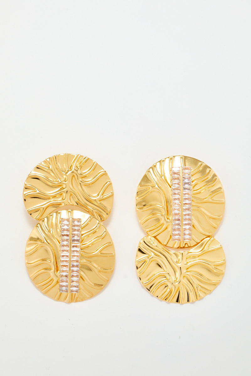 Handcrafted in our Parisian Atelier, the Sonia Double Rib Gold earrings feature a striking silhouette of two stacked ribbed medallions in 100% gold-plated brass. Graphic, reflective, and structured with a central vertical line of crystals, this piece is a bold tribute to sculptural form and contrast.