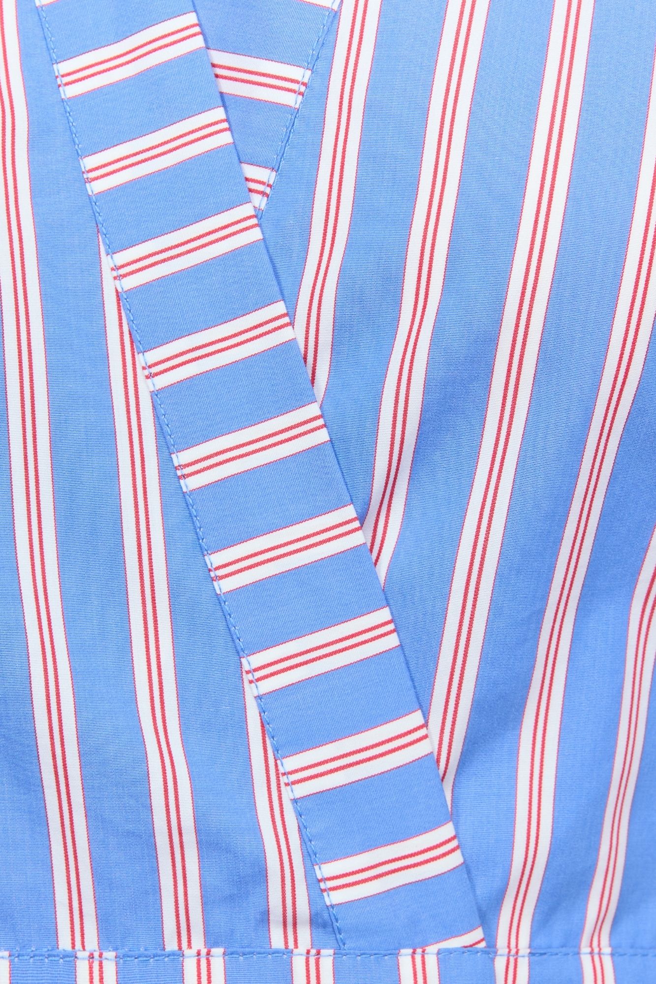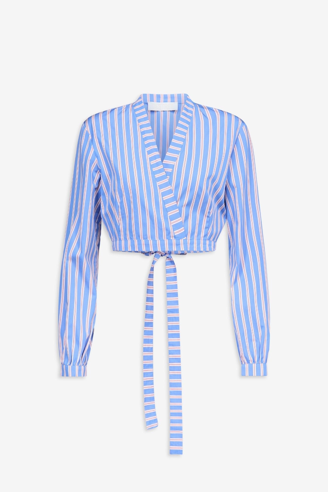 The striped cropped top is crafted in crisp cotton poplin, featuring fine blue and white vertical stripes that create a fresh and graphic summer look. Its wrap-style silhouette is enhanced by a cropped cut, long sleeves, and structured cuffs, offering a refined balance between lightness and tailoring. Both modern and effortless, it is designed for versatile warm-weather styling.