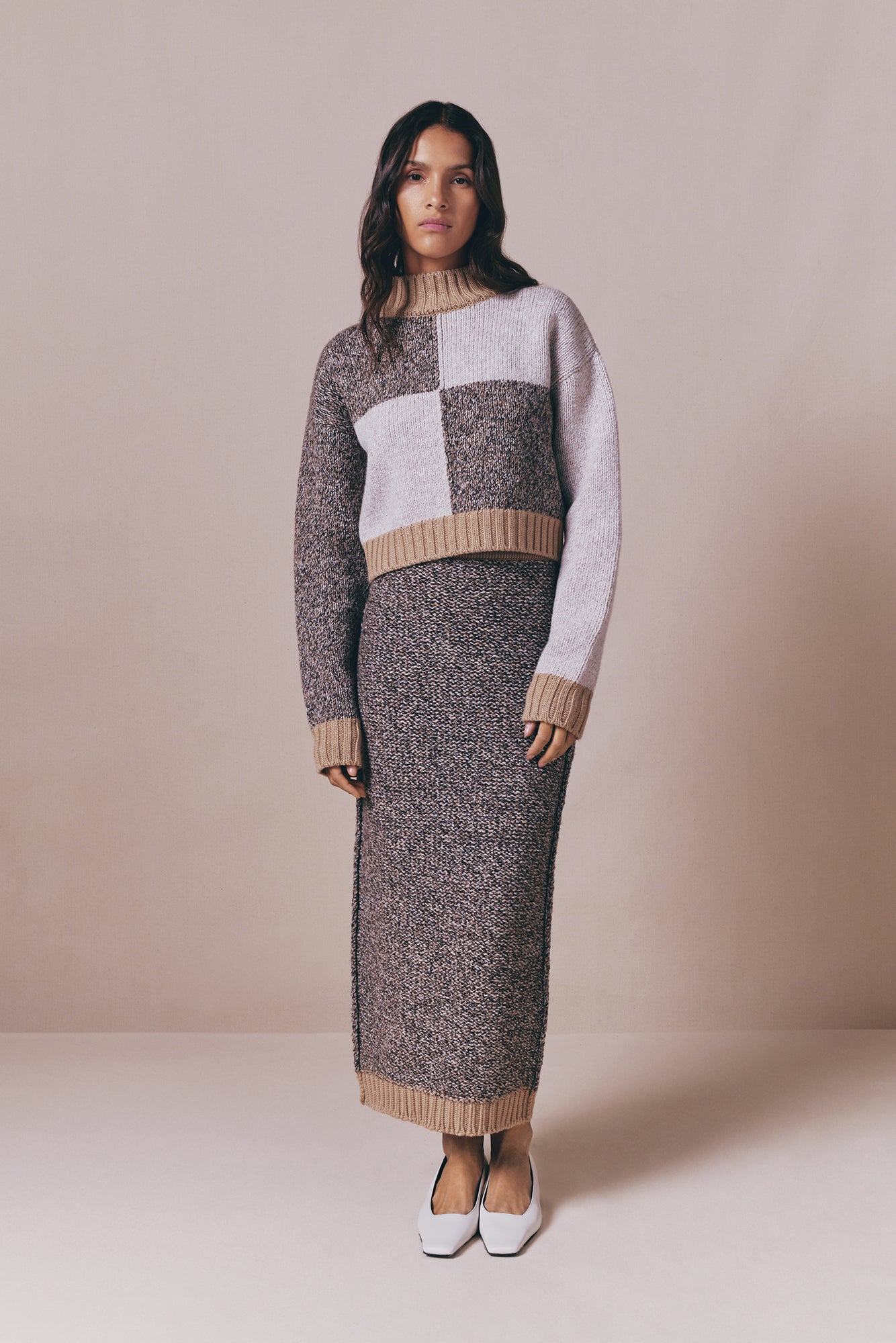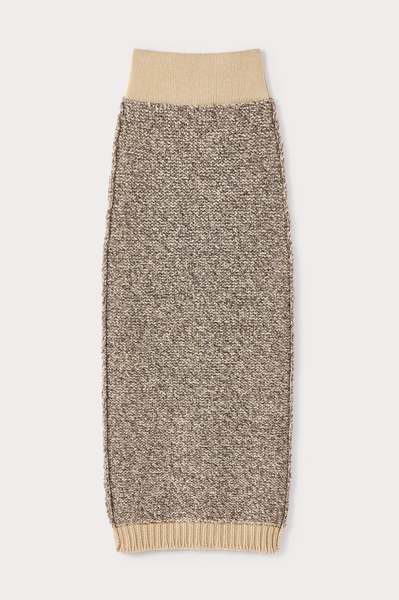 Sophisticated midi skirt crafted in a textured knit, designed for both comfort and elegance. Its ribbed waistband and hem create a refined silhouette that pairs perfectly with the matching cropped sweater.