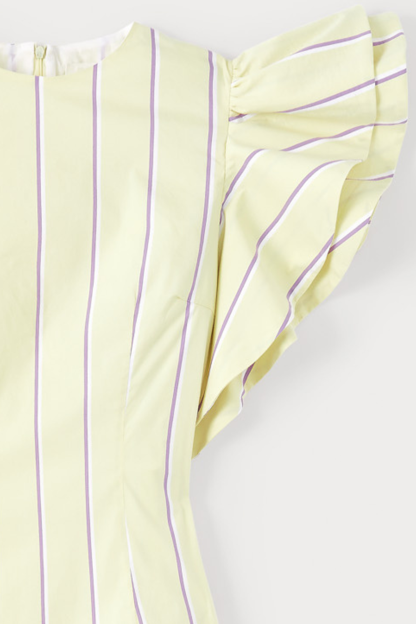 Pale yellow & lilac striped dress with asymmetric ruffle detail