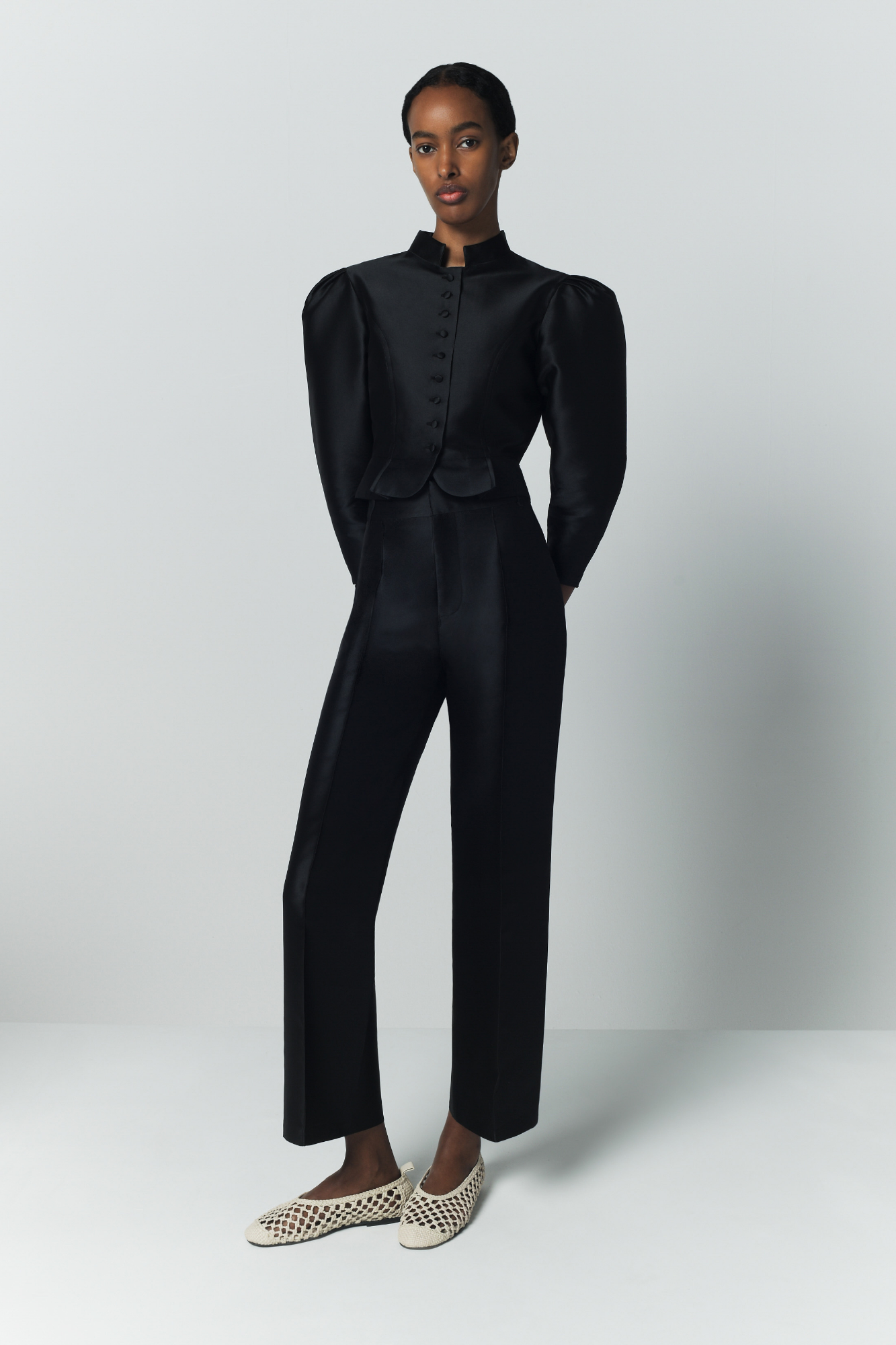 The Amoako jacket is a contemporary reinterpretation of 1950s fashion, showcasing our commitment to modern elegance and artistic inspiration. This cropped jacket features a mandarin collar, voluminous puff sleeves, and a fitted waist, creating a sculptural silhouette that reflects our distinctive aesthetic.