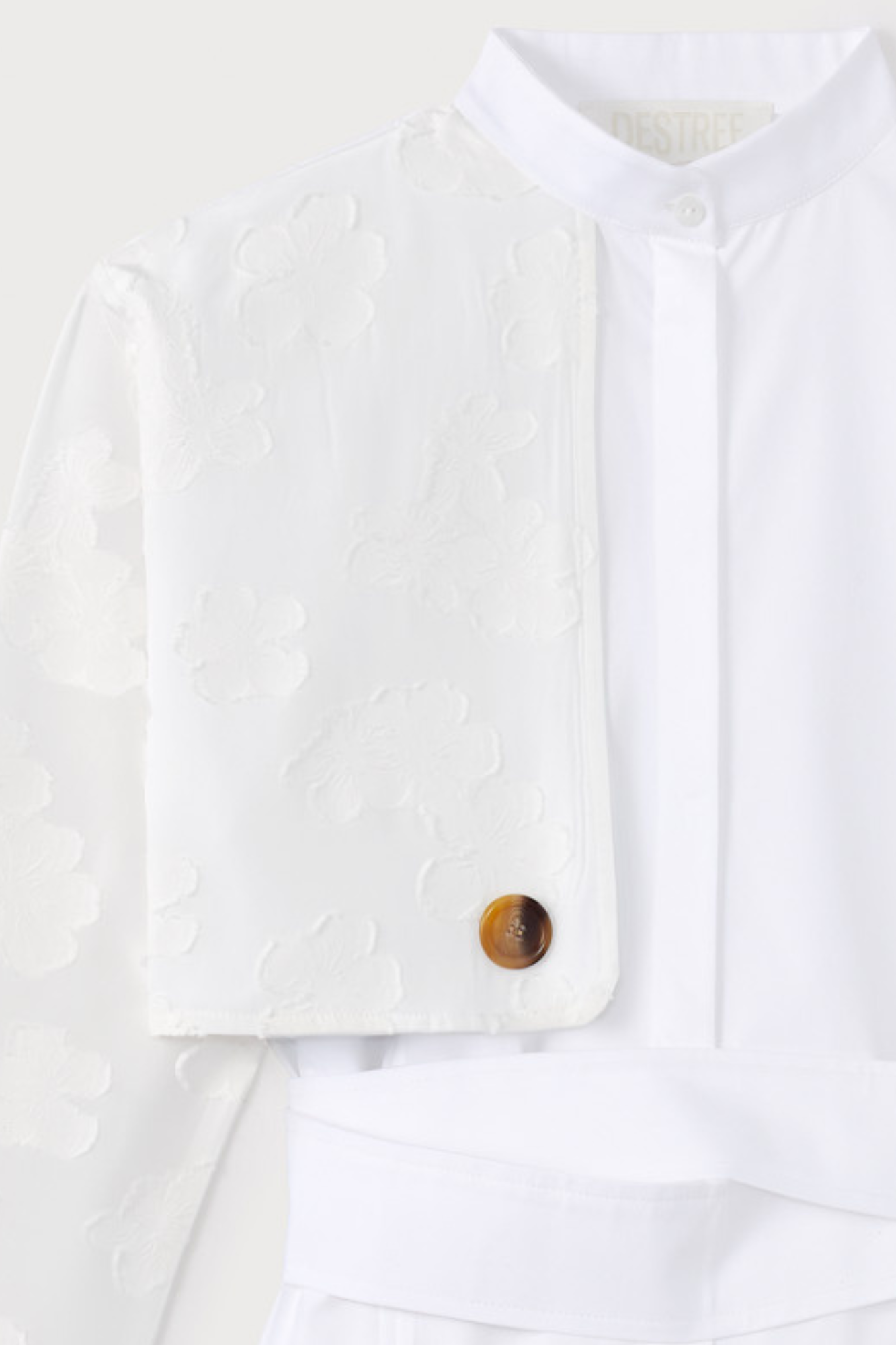This white cotton HANS shirt with floral sleeve detailing offers a sophisticated twist on a classic cut, seamlessly blending with a multitude of wardrobe essentials.