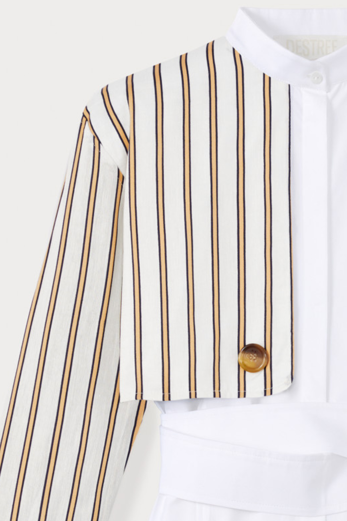 A structured cotton shirt with an avant-garde asymmetrical design, featuring a contrasting striped panel and sleeve. The architectural silhouette is enhanced by a wrapped waist detail for a sculptural effect.