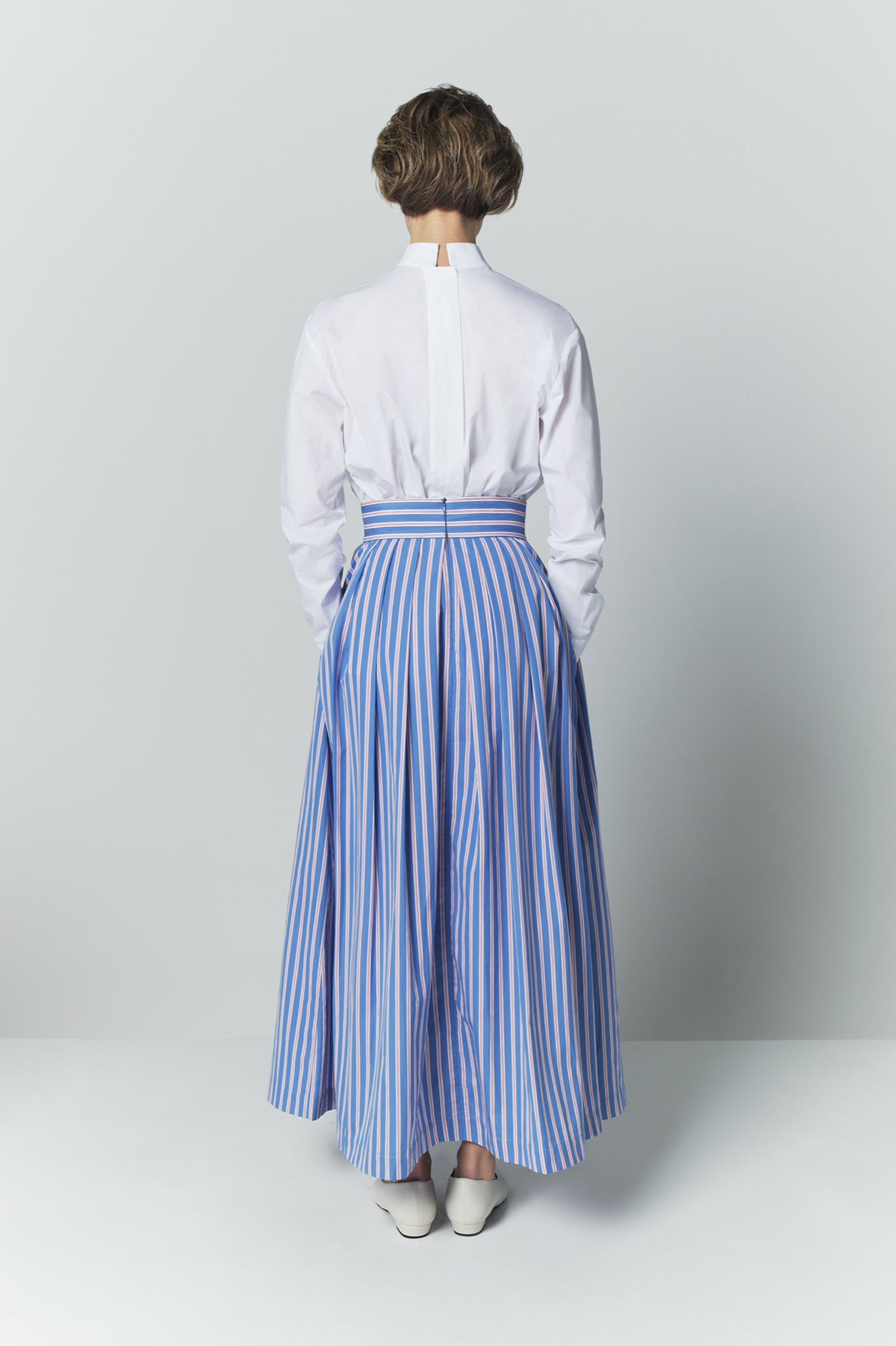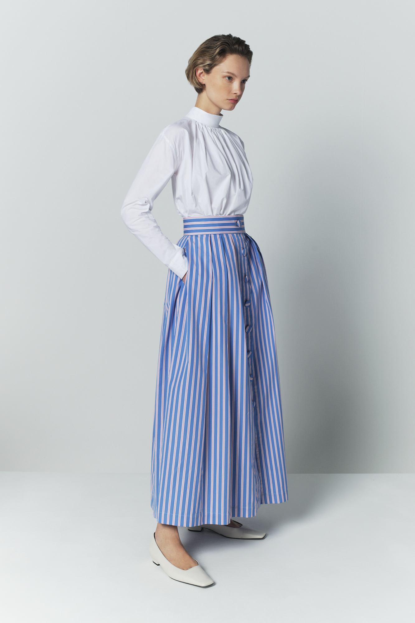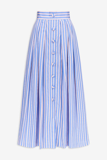 The Irving Popelin Stripes skirt is crafted in crisp cotton poplin, featuring fine blue and white vertical stripes that elongate its fluid silhouette. Its high-waisted cut and full-length button-front closure create a clean, structured line, while the flowing volume adds elegant movement. Both fresh and refined, it offers a modern summer statement.
