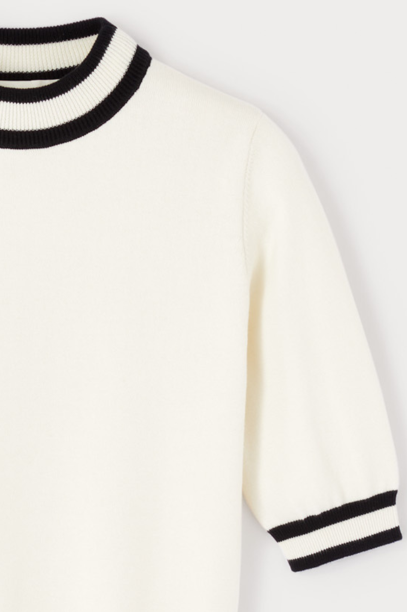 A refined interpretation of the classic varsity knit, this short-sleeve sweater combines timeless collegiate elements with modern sophistication. Crafted in soft ivory knit, it features striking black contrast trim at the crew neckline and cuffs. The slightly cropped silhouette and structured fit create a contemporary proportion that pairs effortlessly with high-waisted pieces.