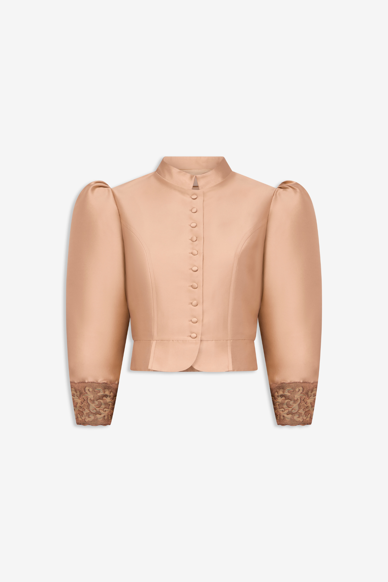 The Amoako Lace jacket is crafted in a luminous blend of polyester and silk, offering a smooth, structured finish with a refined sheen. Its sculptural silhouette is defined by a fitted waist, mandarin collar, and tonal covered buttons, while voluminous puff sleeves add architectural presence. Delicate lace cuffs introduce a subtle contrast and a feminine touch, enhancing the balance between elegance and modern tailoring. Fully lined for comfort, it embodies a polished and distinctive statement piece.