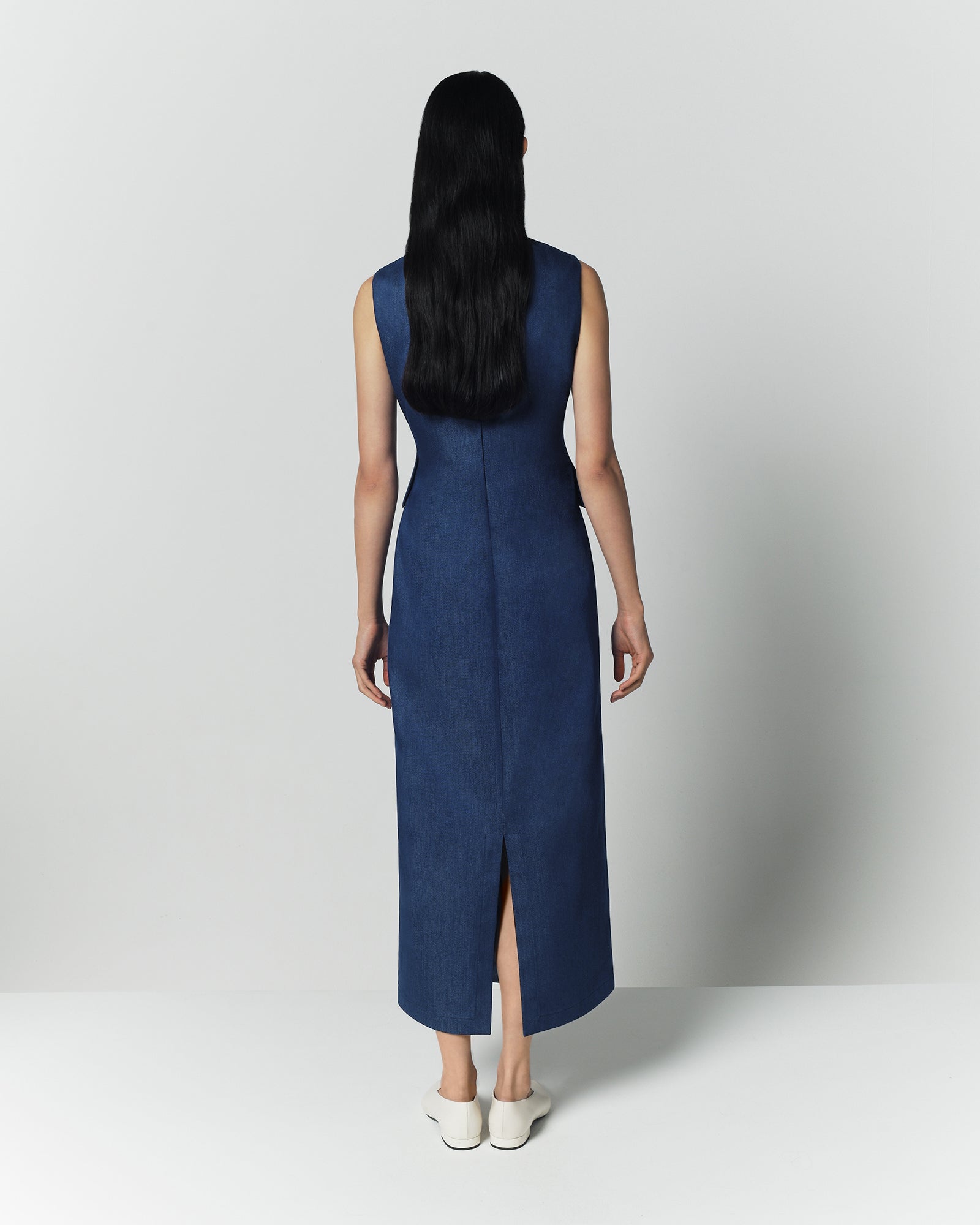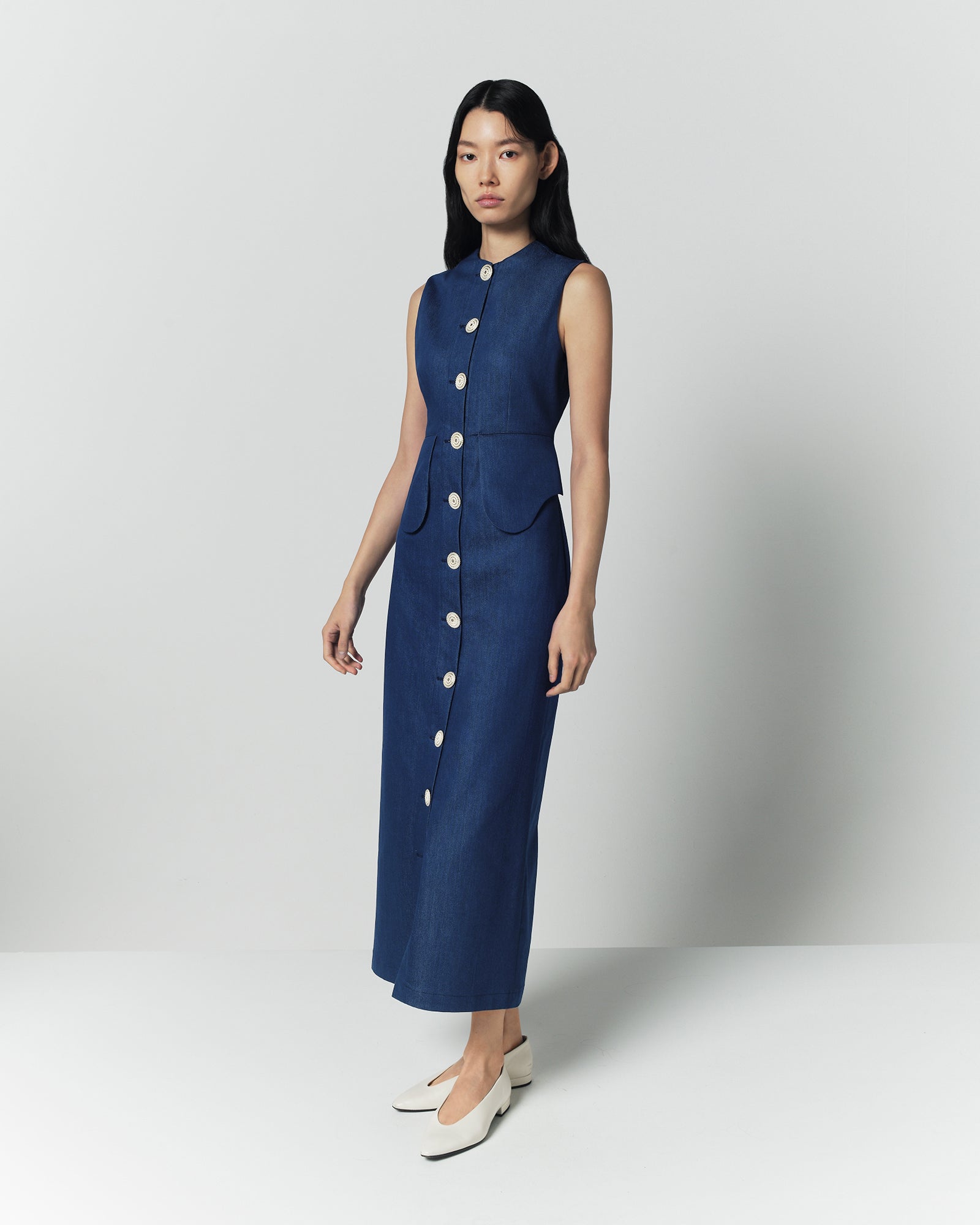 A sophisticated interpretation of utility wear, this sleeveless midi dress blends structure with modern ease. Crafted in blue denim made of 75% cotton, 24% polyester, and 1% elastane, it features a clean round neckline and a full-length button-front closure. Curved pockets at the waist introduce an architectural touch while preserving the dress’s refined silhouette. Every detail is considered, from the distinctive buttons to the subtle waist definition.