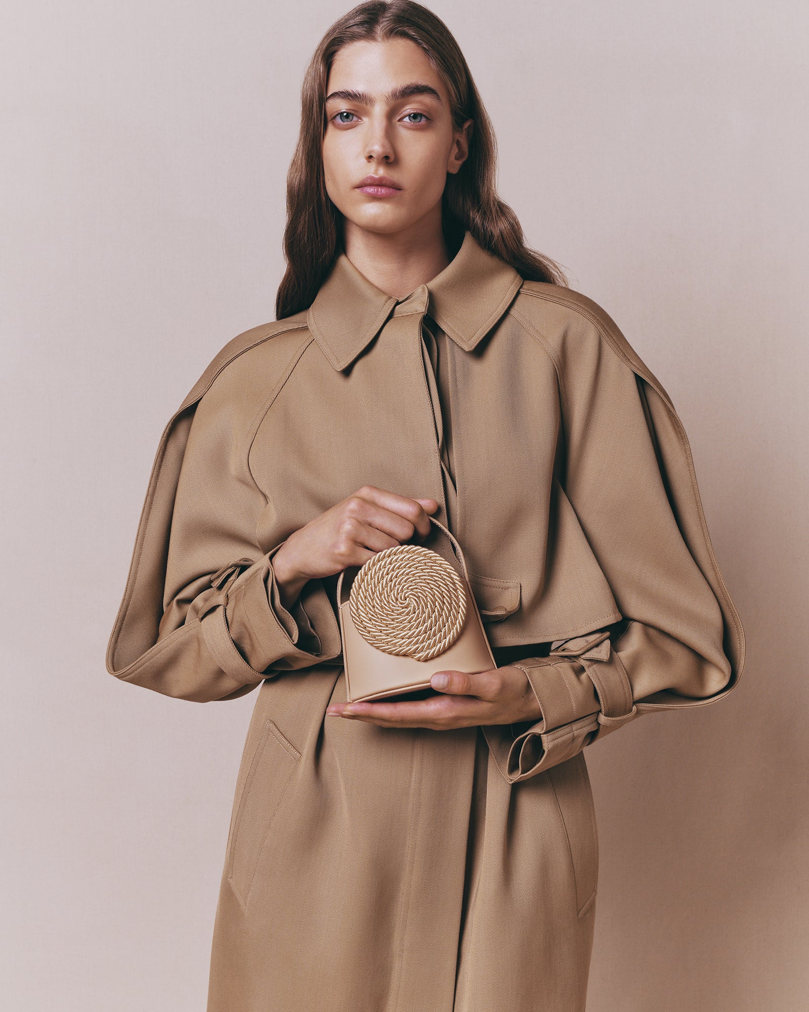 A mini take on the Gunther Passementerie bag, crafted in Spain. Its structured silhouette features a black cotton drawstring pocket and a chain for crossbody wear. The tone-on-tone passementerie detail adds a distinctive, geometric touch inspired by French craftsmanship.