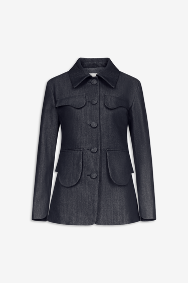 The utility jacket is crafted in structured dark blue denim, offering a refined balance between tailored precision and everyday ease. Its fitted silhouette is enhanced by a pointed collar, tonal covered button-front closure, and sculptural curved pockets that bring subtle architectural dimension. Fully lined for comfort, it reflects a modern interpretation of feminine utility dressing.