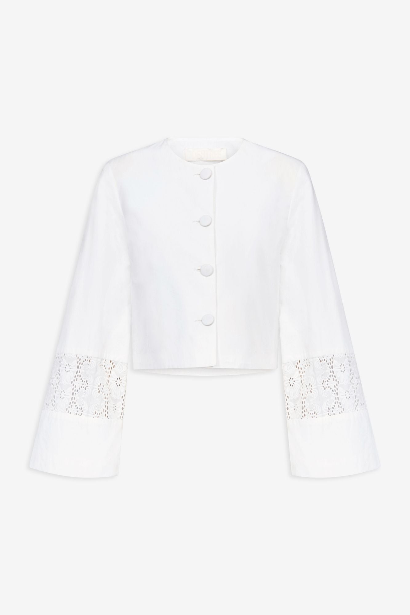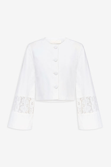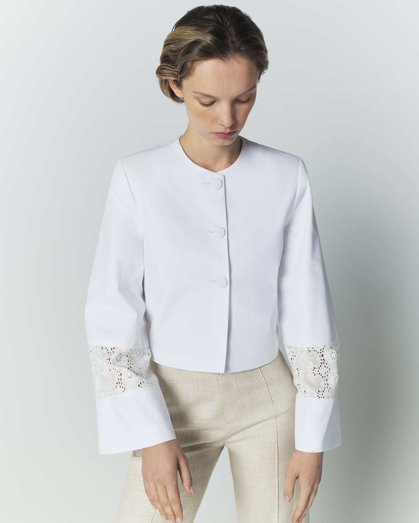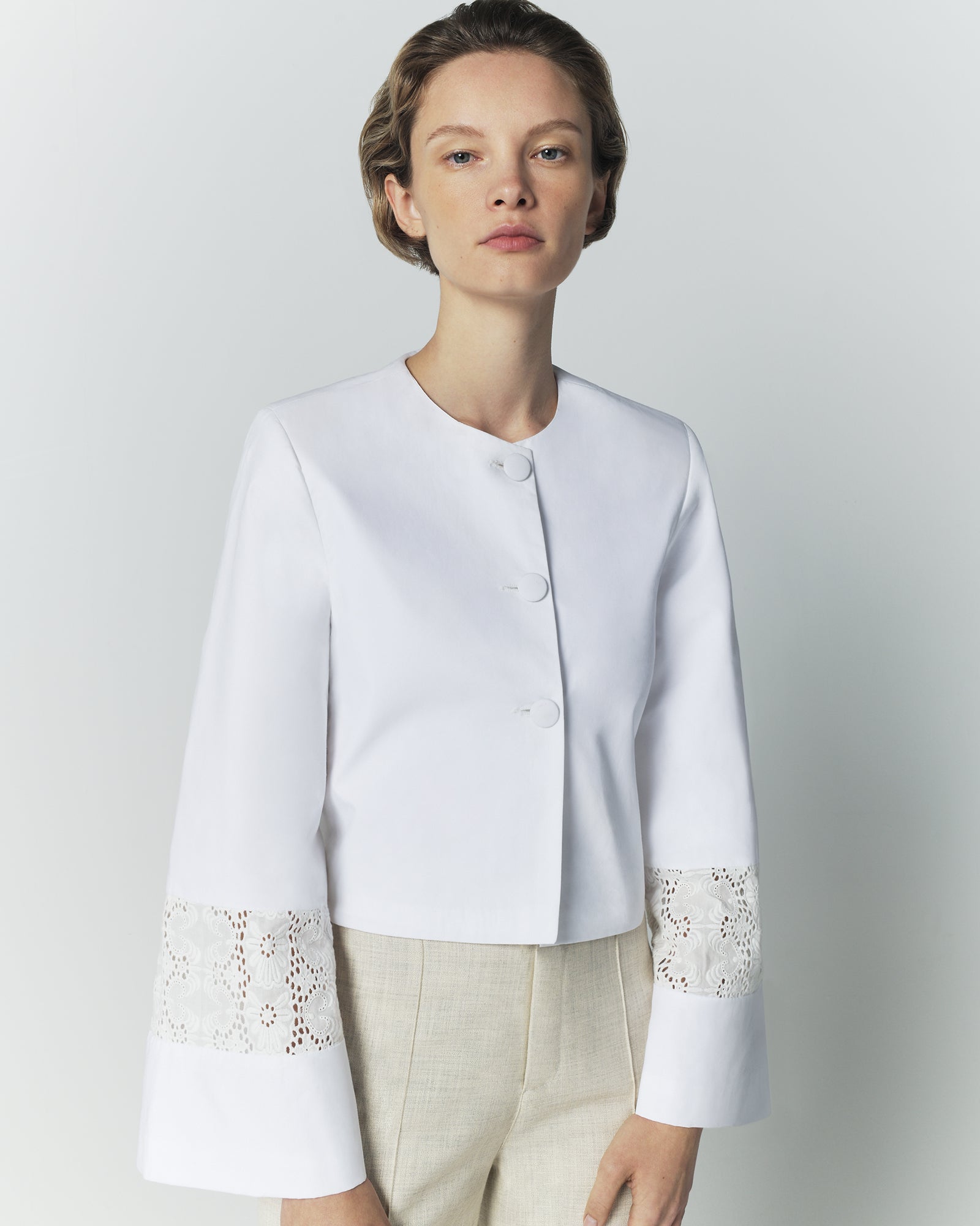 The Ruby Popeline White jacket is crafted in crisp white cotton, offering a refined balance between structure and lightness. Its cropped silhouette is defined by a clean round neckline and tonal covered buttons, while delicate eyelet embroidery at the sleeves adds a subtle decorative detail. Both fresh and elegant, it creates a polished summer statement.