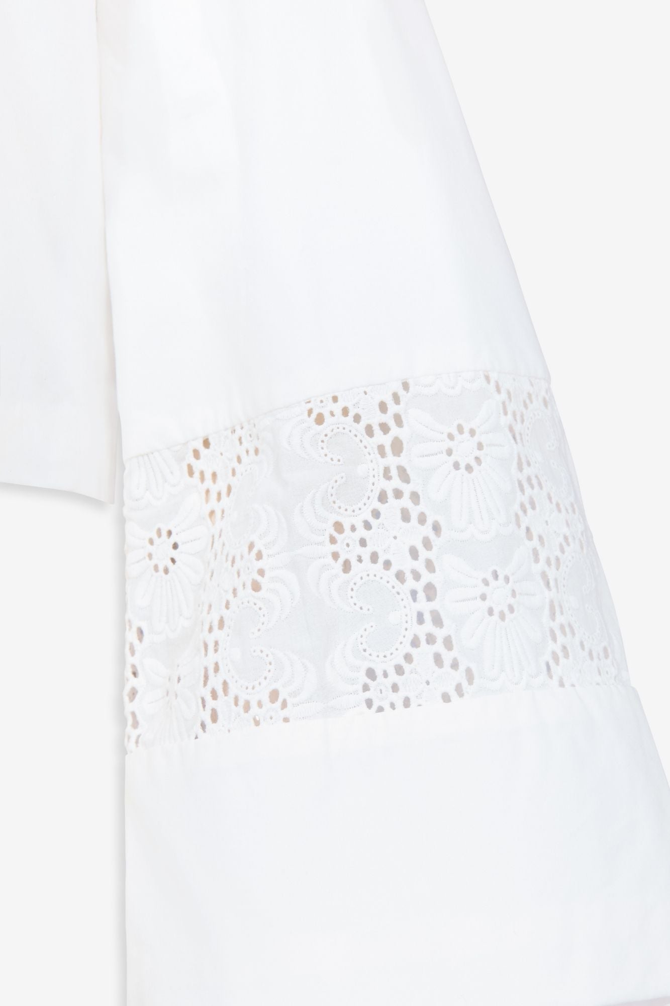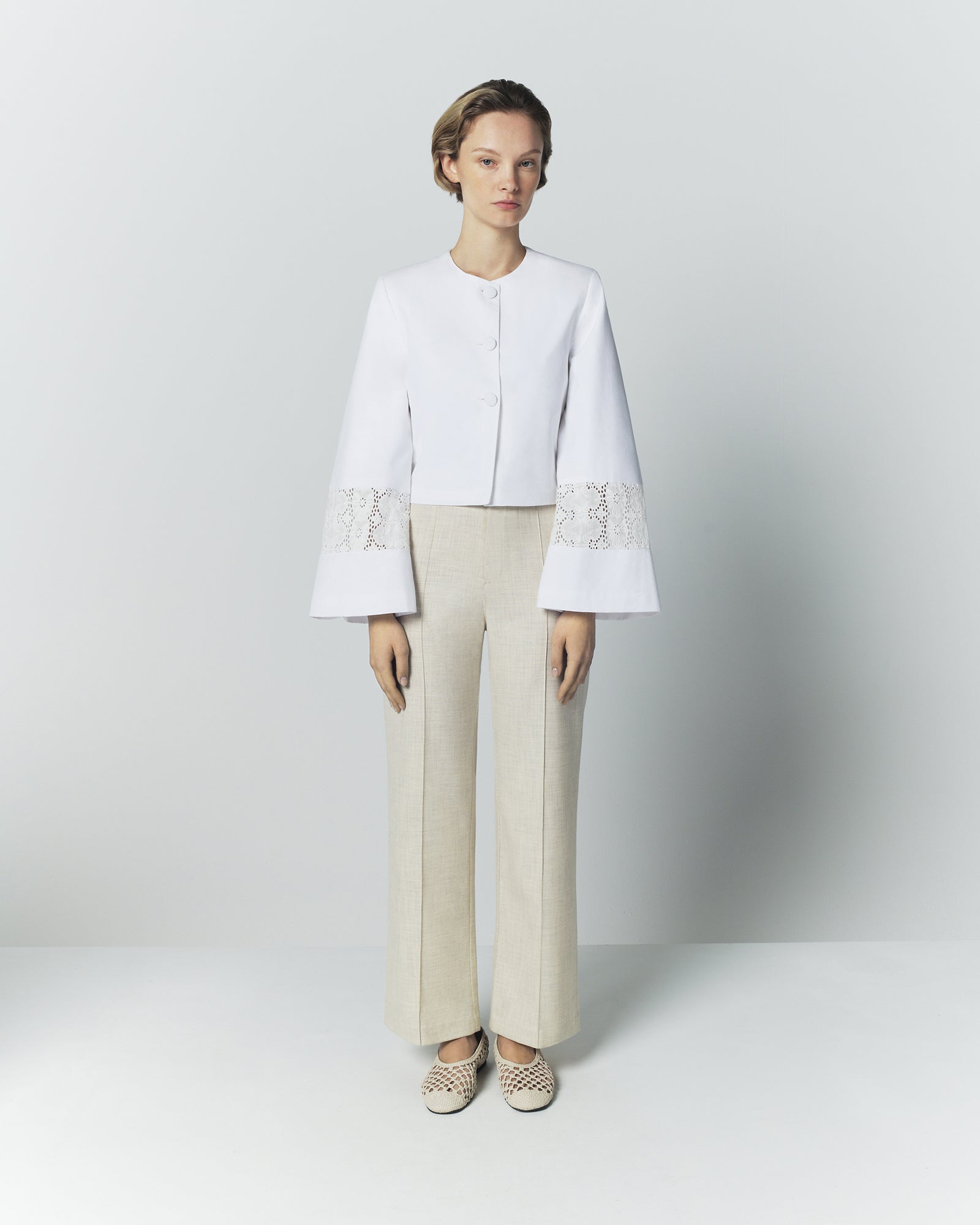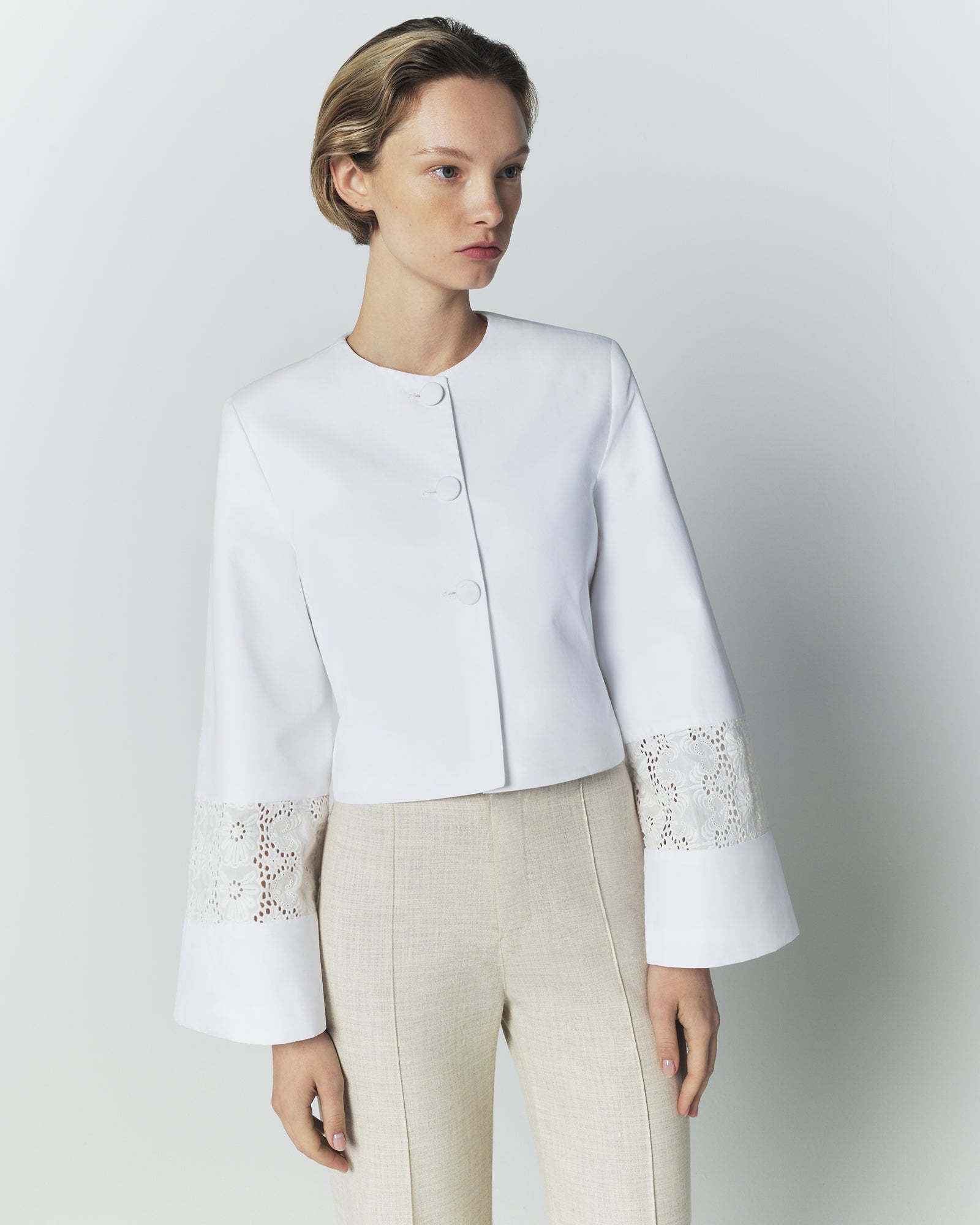 The Ruby Popeline White jacket is crafted in crisp white cotton, offering a refined balance between structure and lightness. Its cropped silhouette is defined by a clean round neckline and tonal covered buttons, while delicate eyelet embroidery at the sleeves adds a subtle decorative detail. Both fresh and elegant, it creates a polished summer statement.