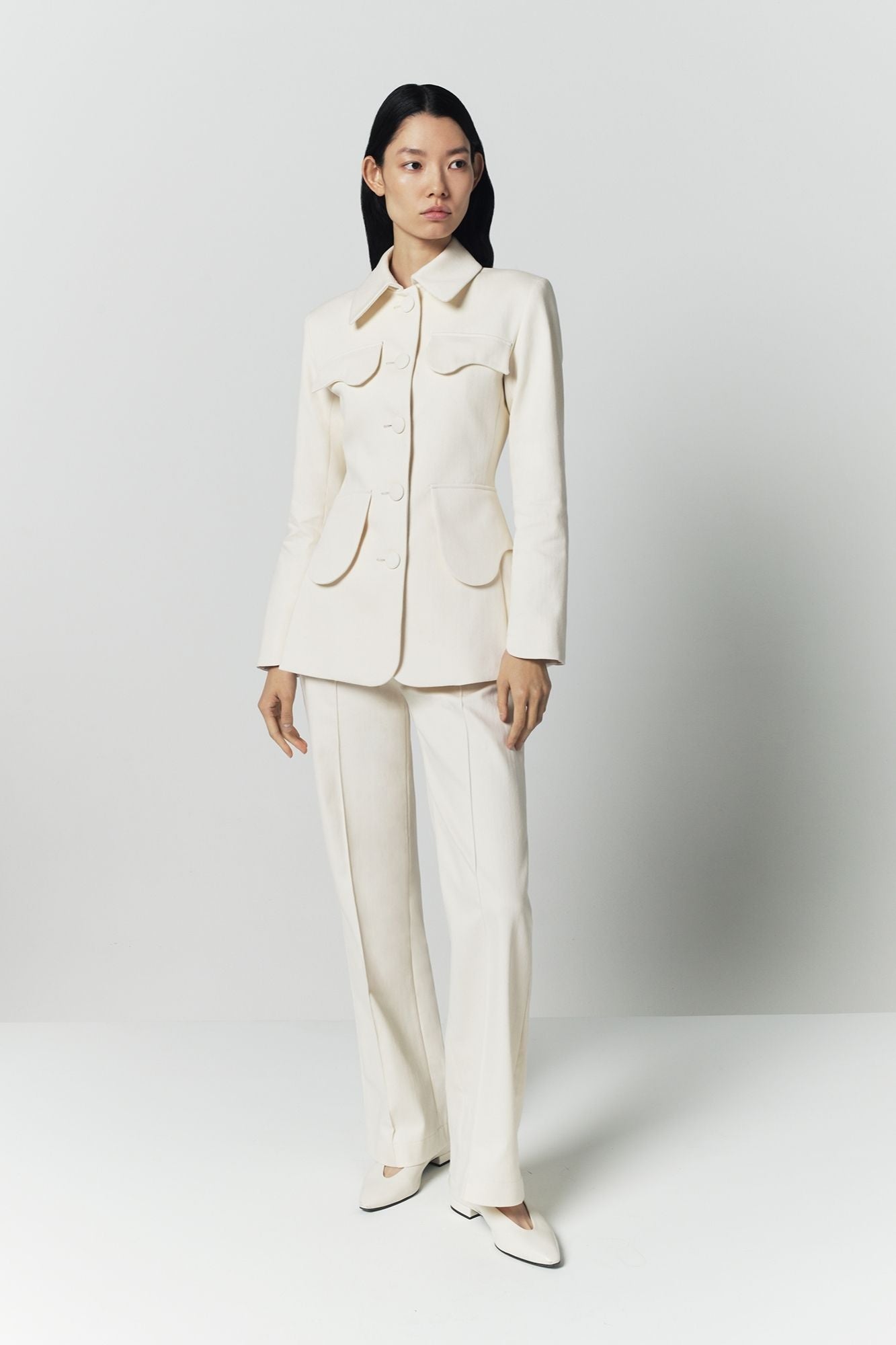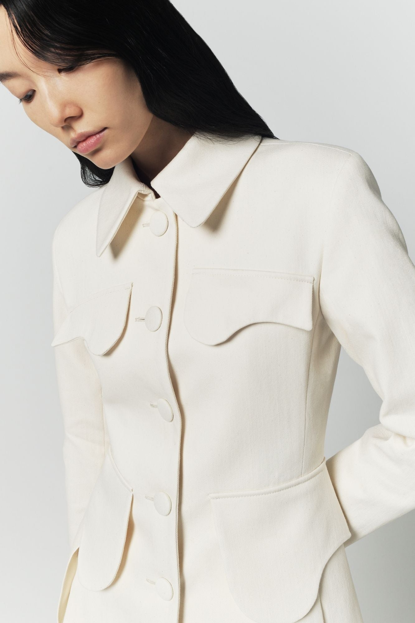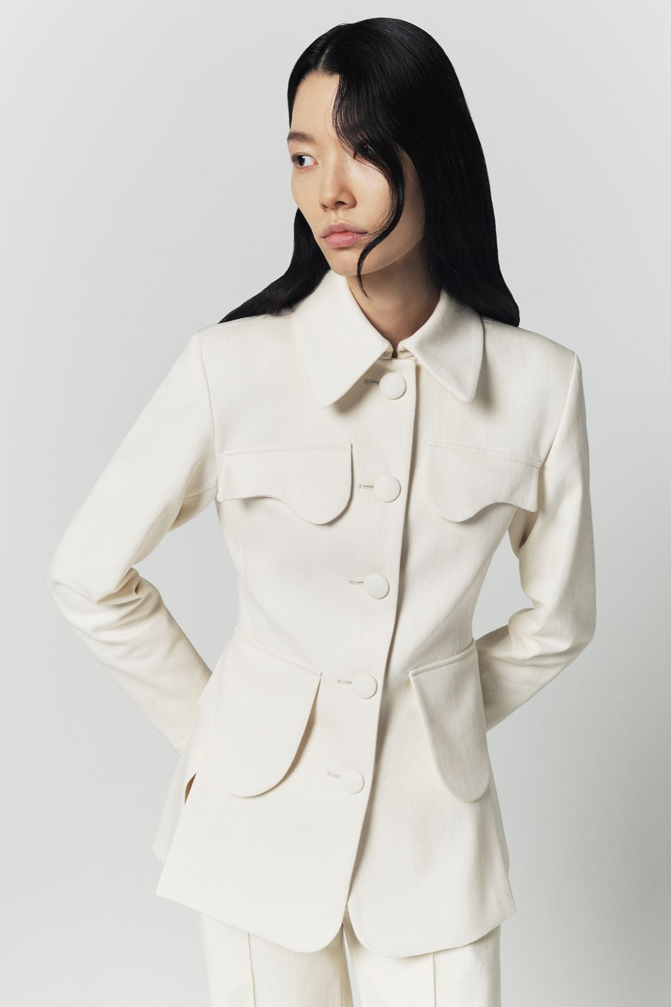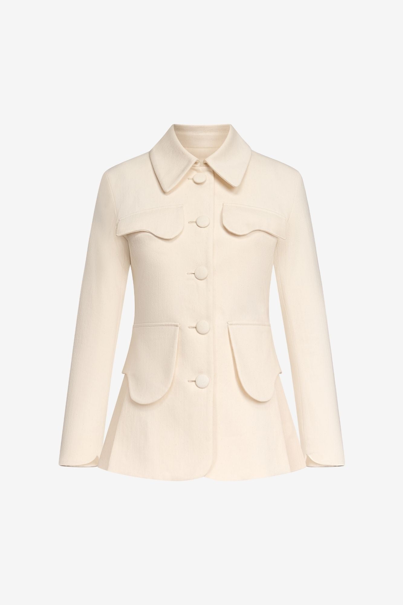 A sophisticated interpretation of the utility jacket, reimagined in black stripe wool for a warm yet refined finish. This piece features a classic pointed collar, a clean button-front closure, and sculptural curved cargo pockets that bring subtle architectural structure. The tailored silhouette and thoughtful detailing—like the tonal covered buttons—lend a polished, feminine edge to this elevated wardrobe essential.