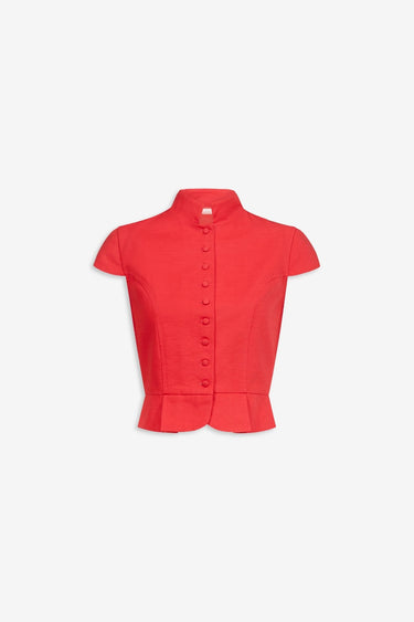 A refined summer take on the Amoako silhouette, this sleeveless top blends structure and lightness. Crafted from 100% cotton, it features a cropped shape with a mandarin collar, covered buttons, and a fitted waist finished with subtle pleated details, offering an elegant warm-weather alternative.