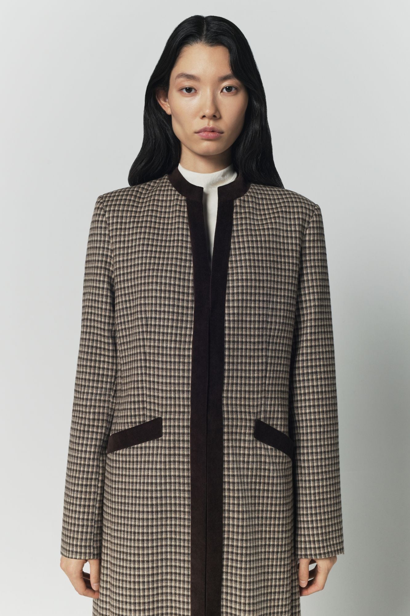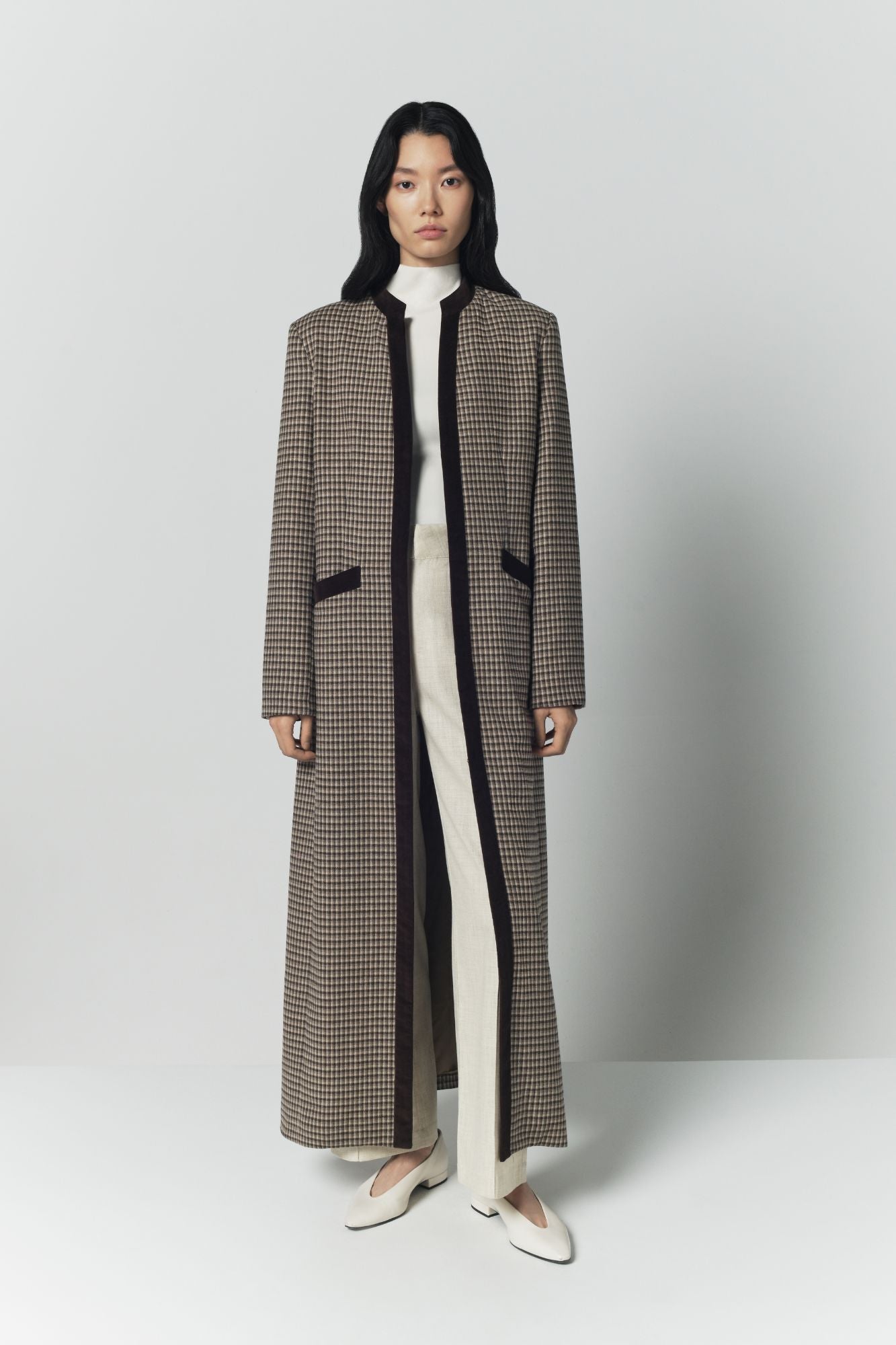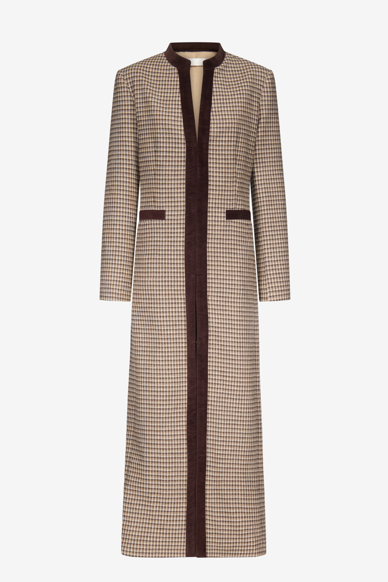 Long checked wool coat featuring a straight, elongated silhouette and contrasting velvet trim along the front.