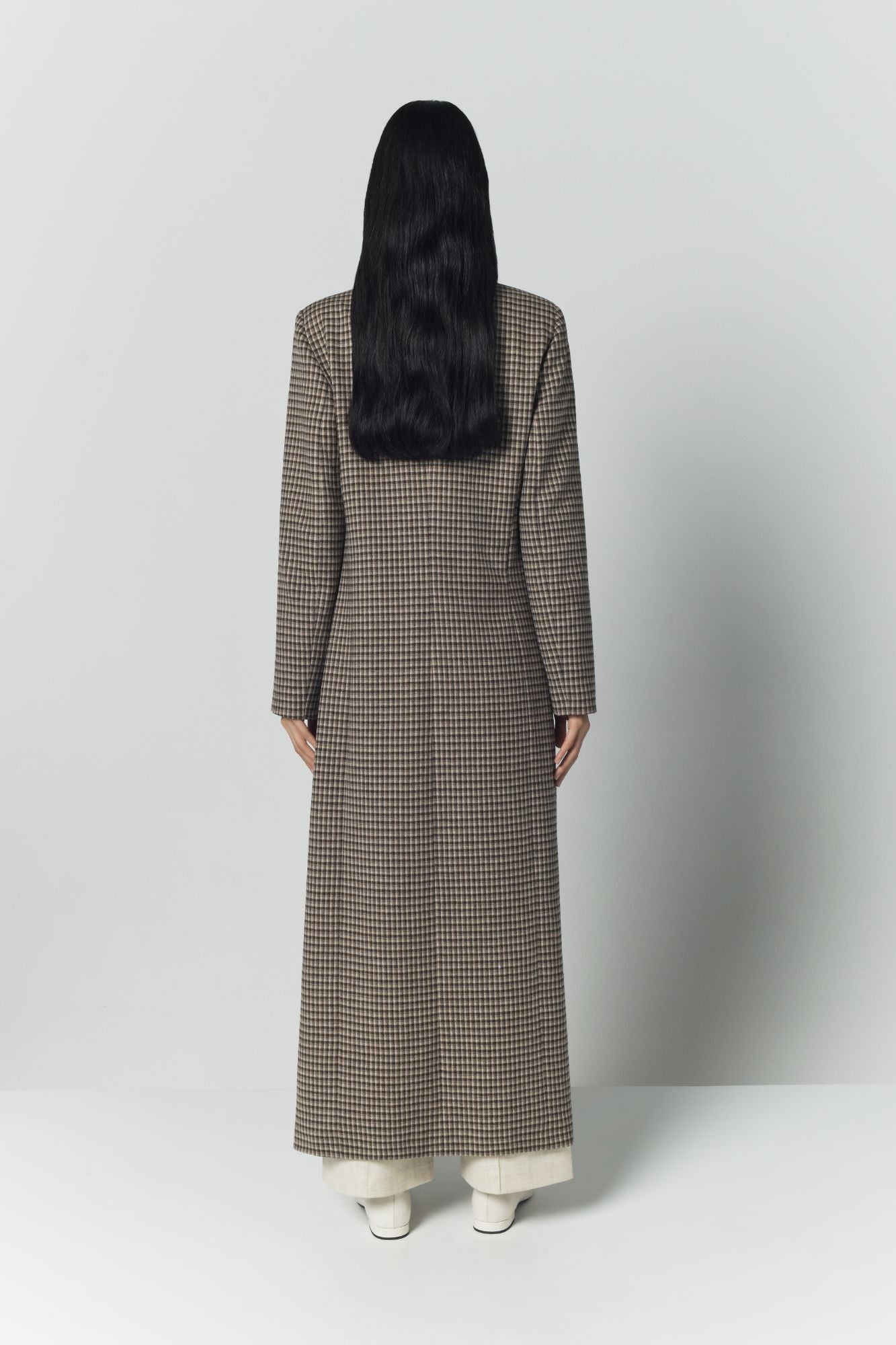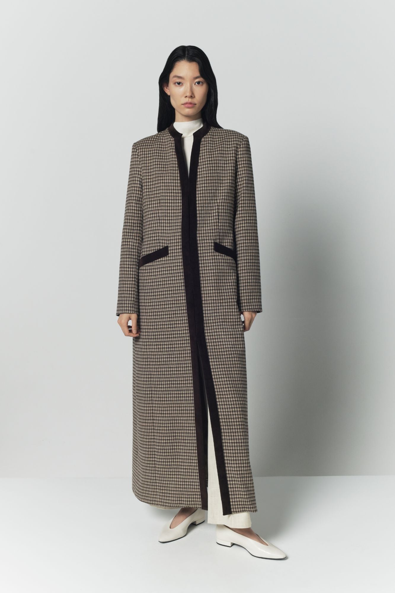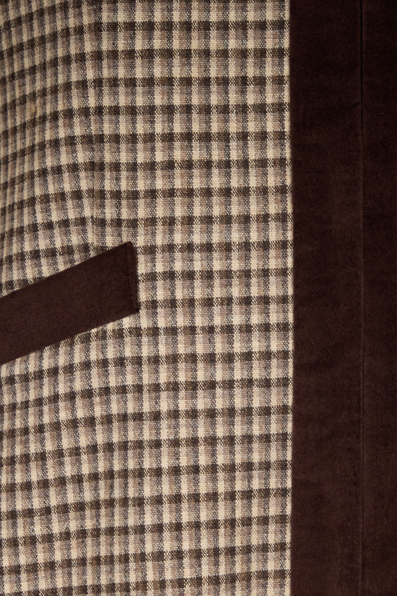 Long checked wool coat featuring a straight, elongated silhouette and contrasting velvet trim along the front.