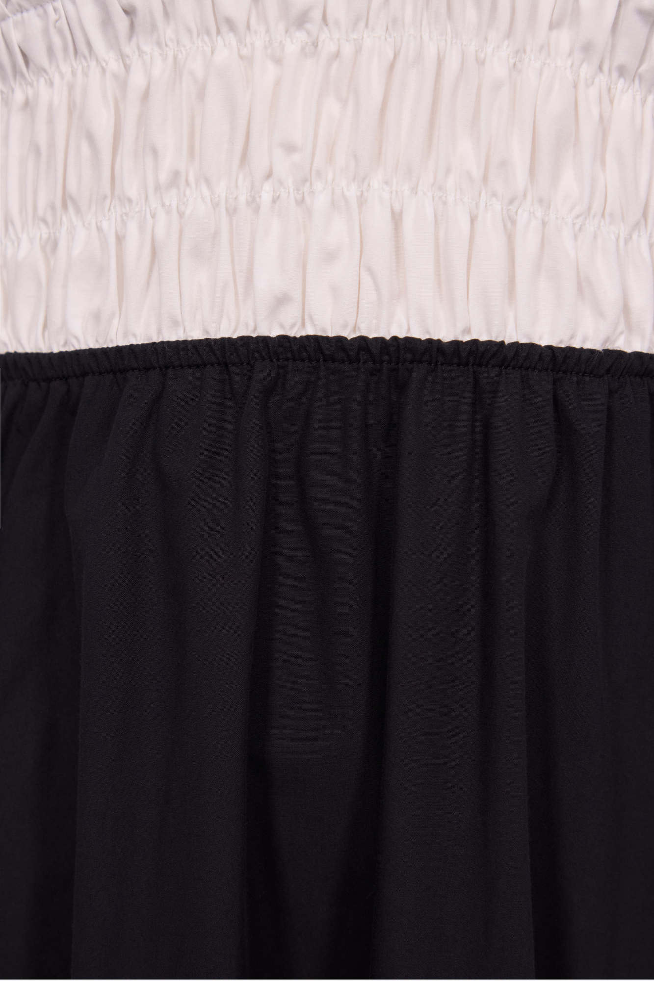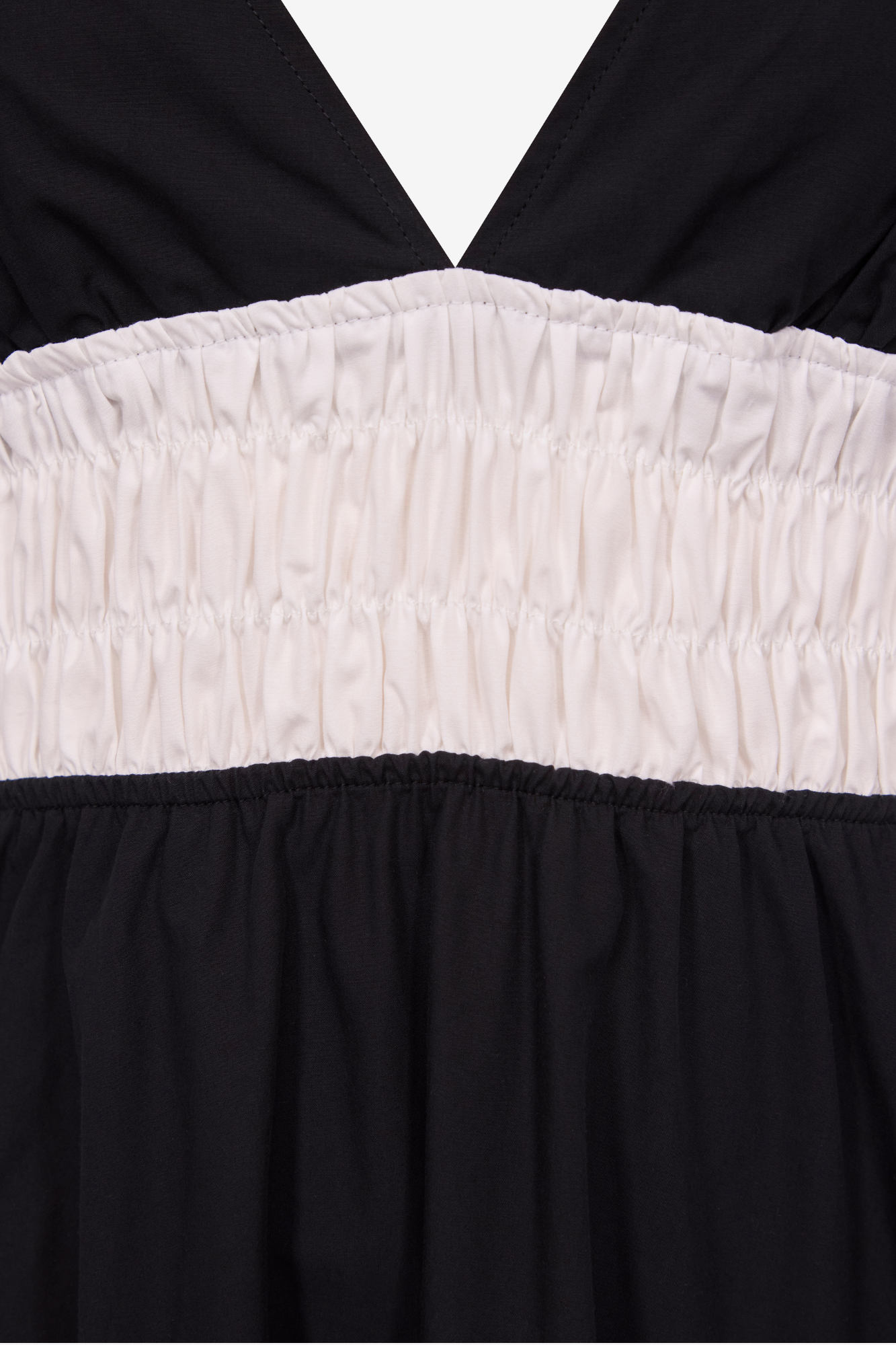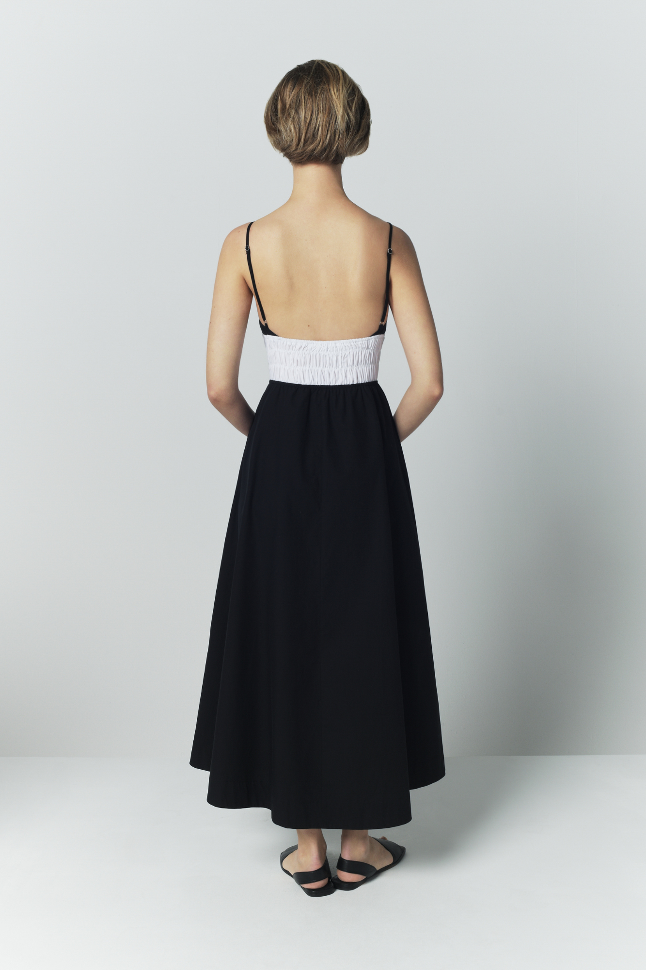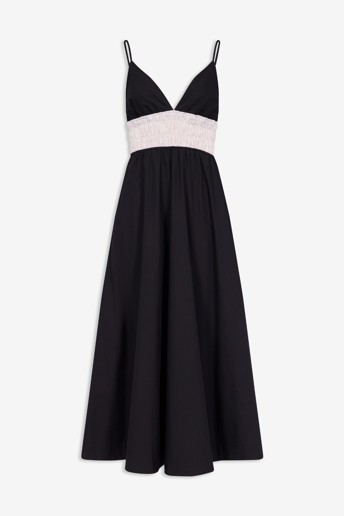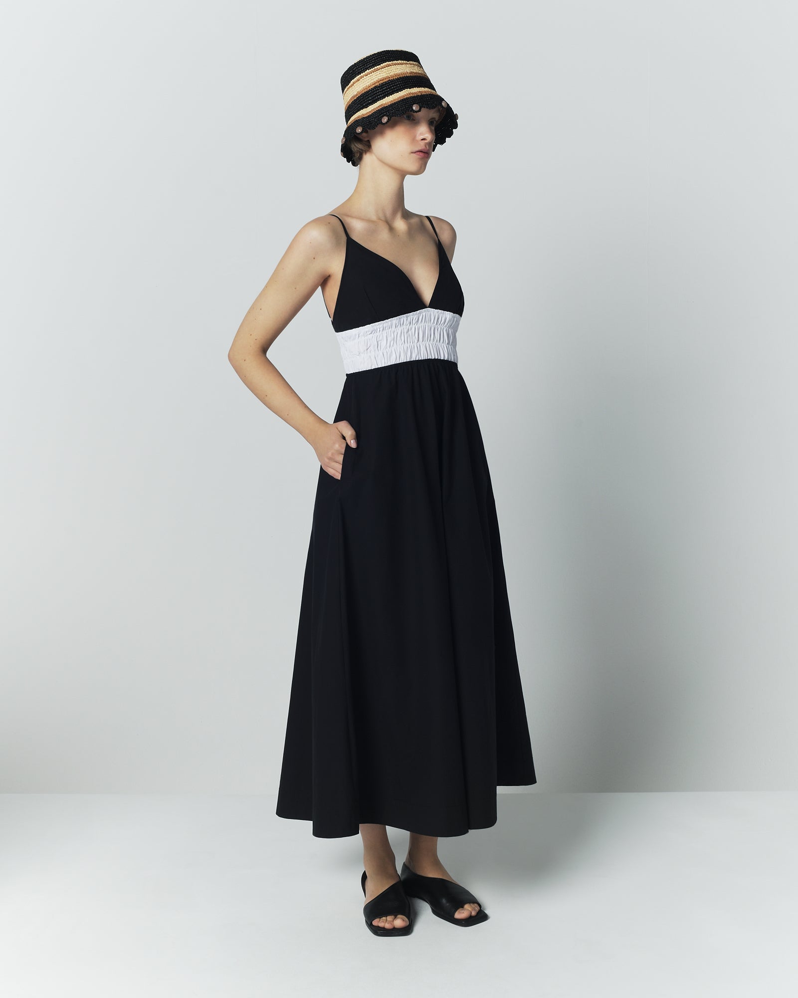 The Lorena Popelin Black dress is crafted in crisp cotton poplin, featuring a fluid, elongated silhouette contrasted by a softly gathered waist panel that defines the shape. Its delicate straps and structured bodice create a refined balance between lightness and support, while the flowing skirt brin…