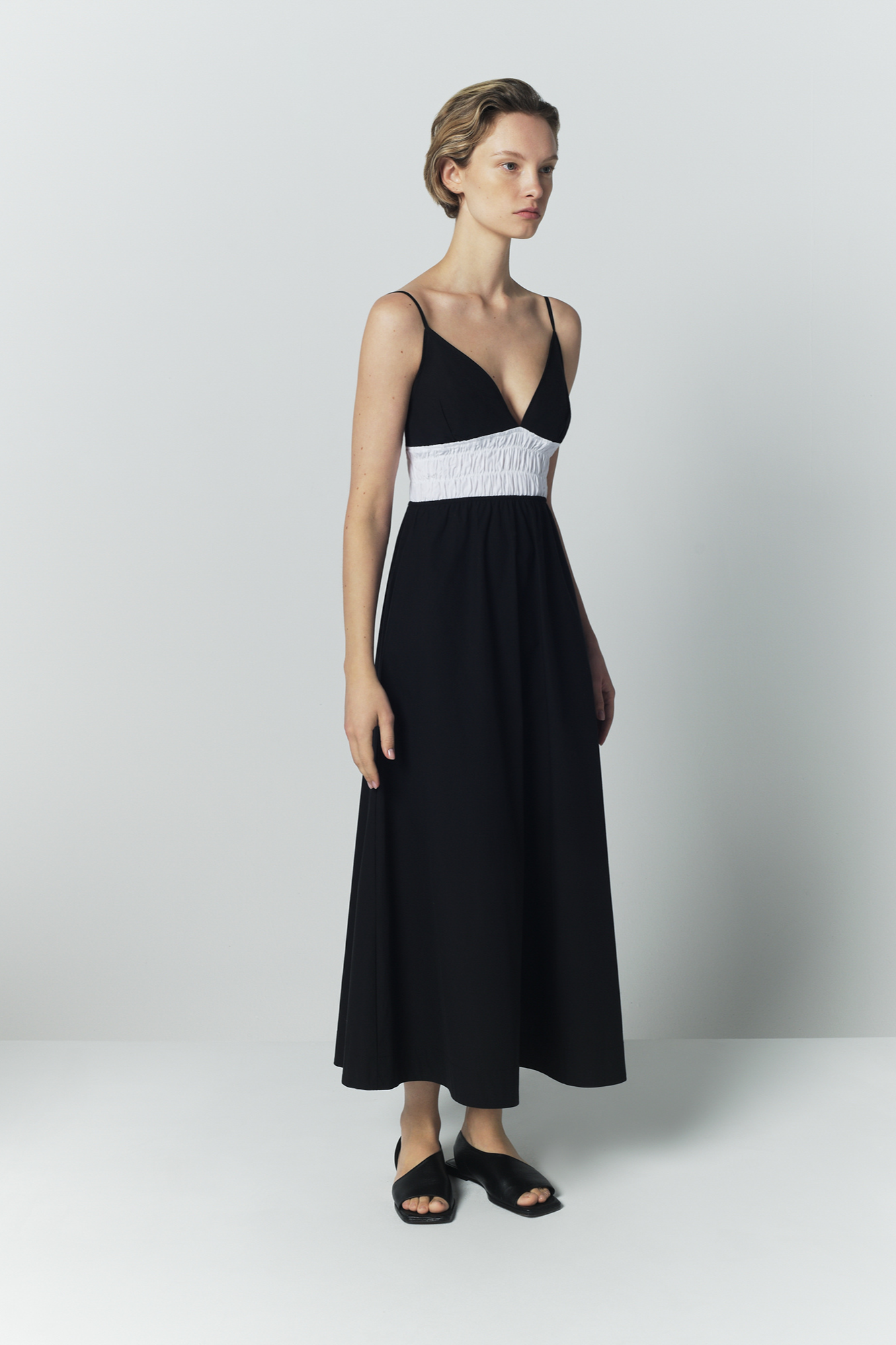 The Lorena Popelin Black dress is crafted in crisp cotton poplin, featuring a fluid, elongated silhouette contrasted by a softly gathered waist panel that defines the shape. Its delicate straps and structured bodice create a refined balance between lightness and support, while the flowing skirt brings elegant movement. Both minimal and feminine, it offers a modern interpretation of summer dressing.