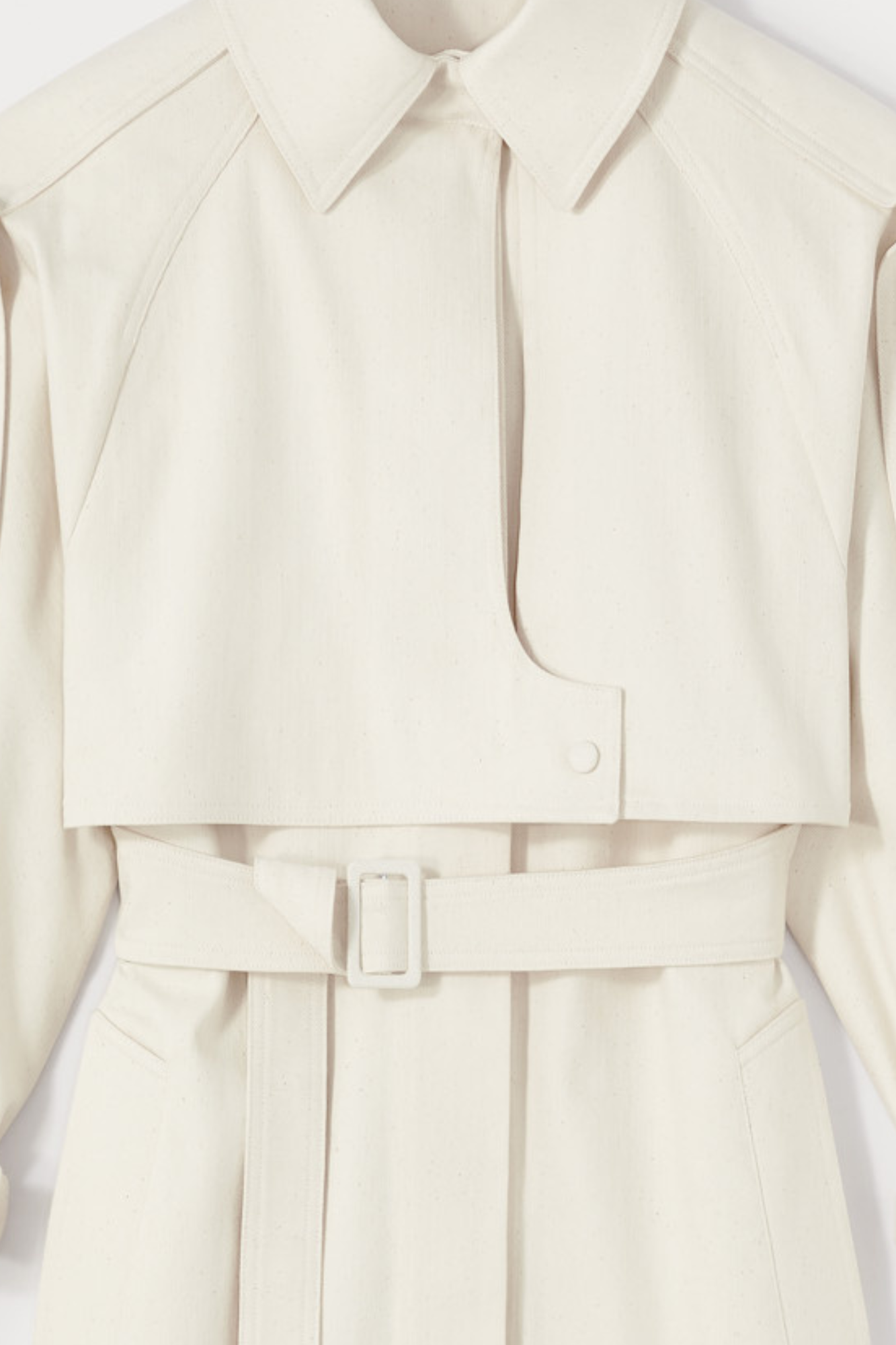 Ce trench-coat revisité présente une version moderne d'une silhouette intemporelle. Confectionné dans un luxueux tissu crème, il présente une superposition architecturale au niveau du corsage, créant un effet superposé court distinctif. Le design est ancré dans des détails bien pensés, notamment un col classique, des bretelles réglables aux poignets et une ceinture assortie qui cintre la taille pour une silhouette raffinée.