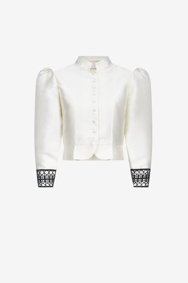 Veste à manches bouffantes en satin blanche avec détails brodés