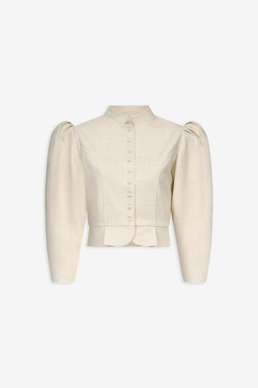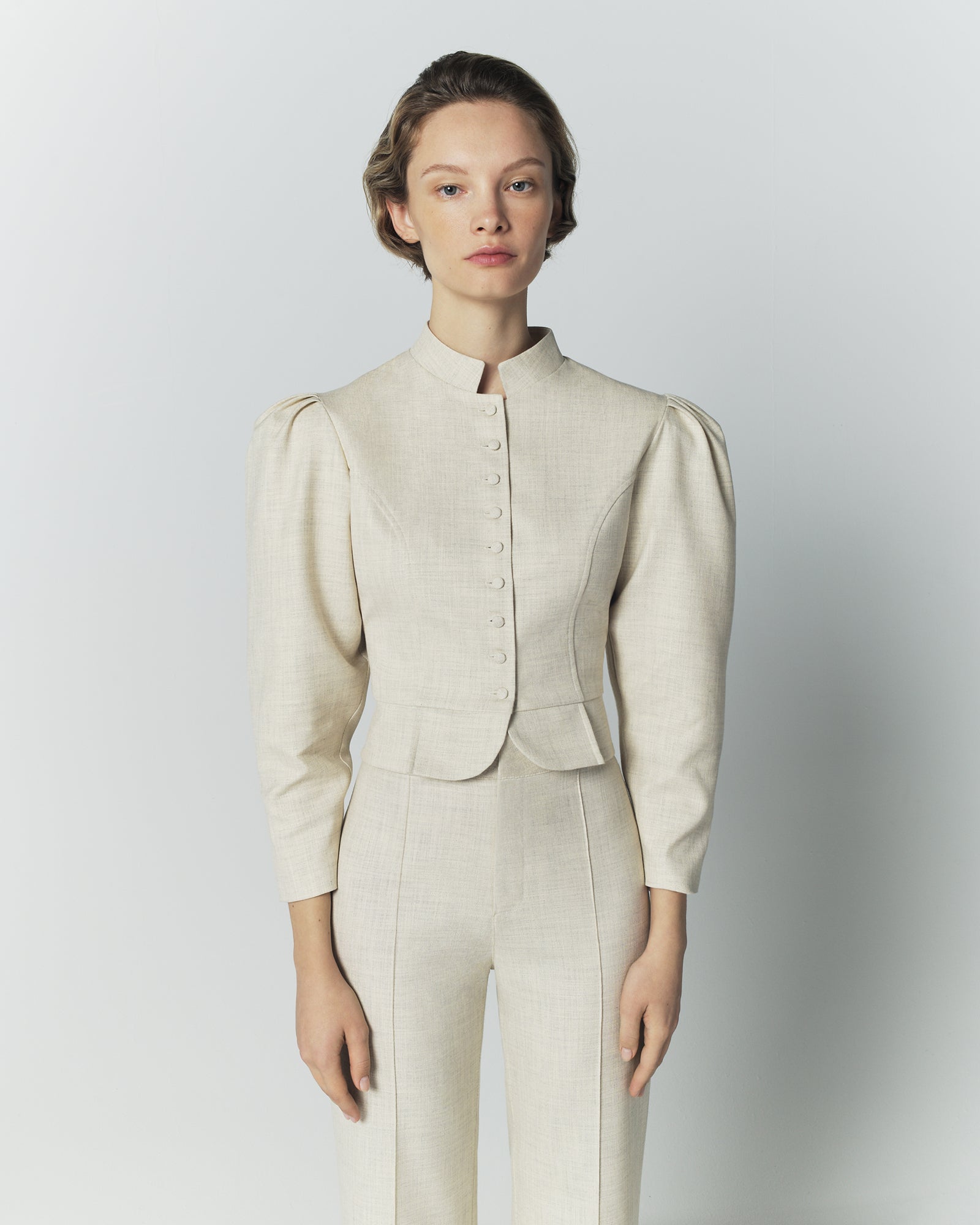 The Amoako jacket is a contemporary reinterpretation of 1950s fashion, blending sculptural structure with modern elegance. Crafted in a refined viscose blend, this cropped jacket features a mandarin collar, voluminous puff sleeves, and a fitted waist that define its architectural silhouette. Both structured and fluid, it reflects the distinctive aesthetic of the Amoako line while offering a polished, contemporary finish.
