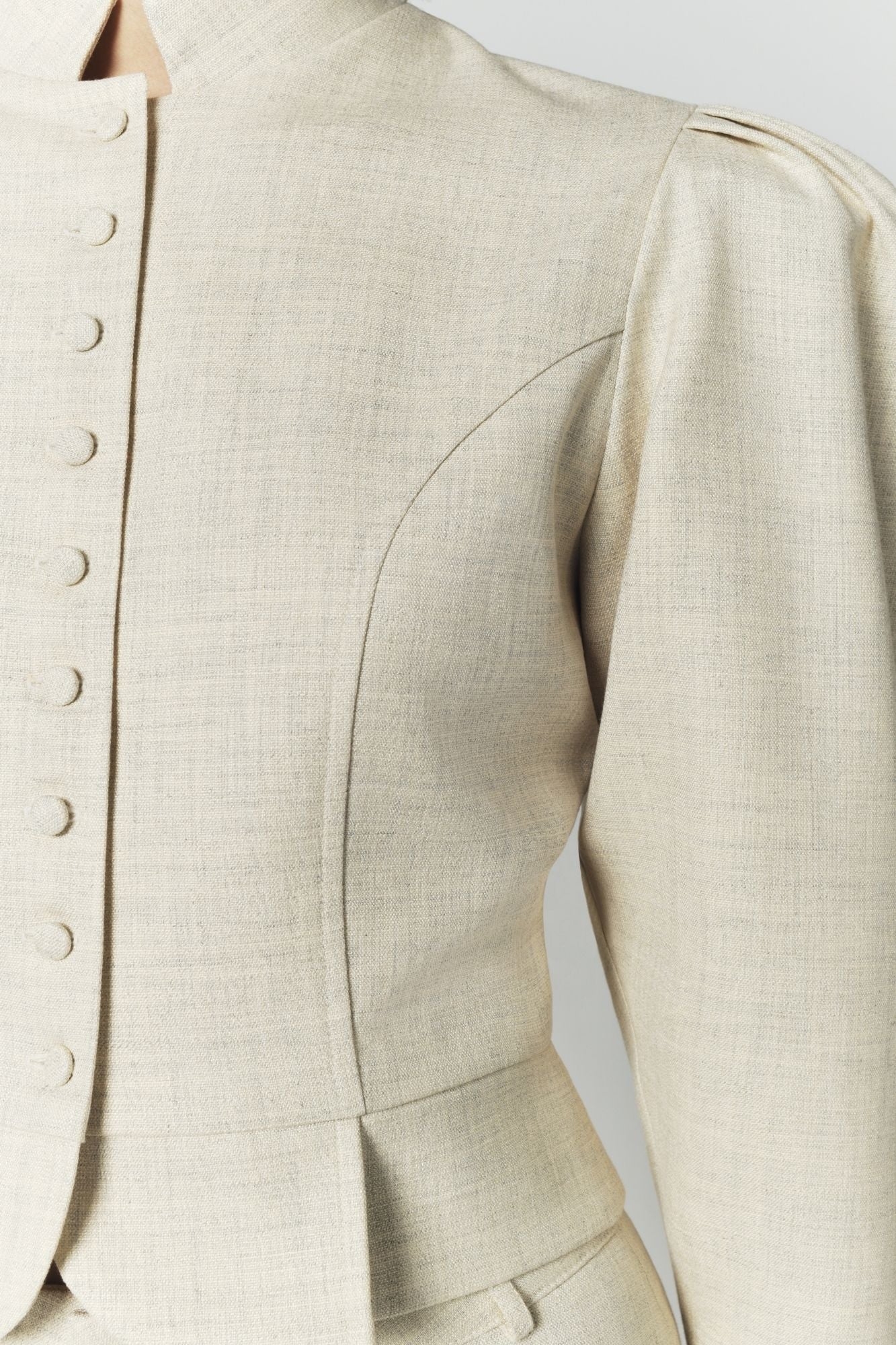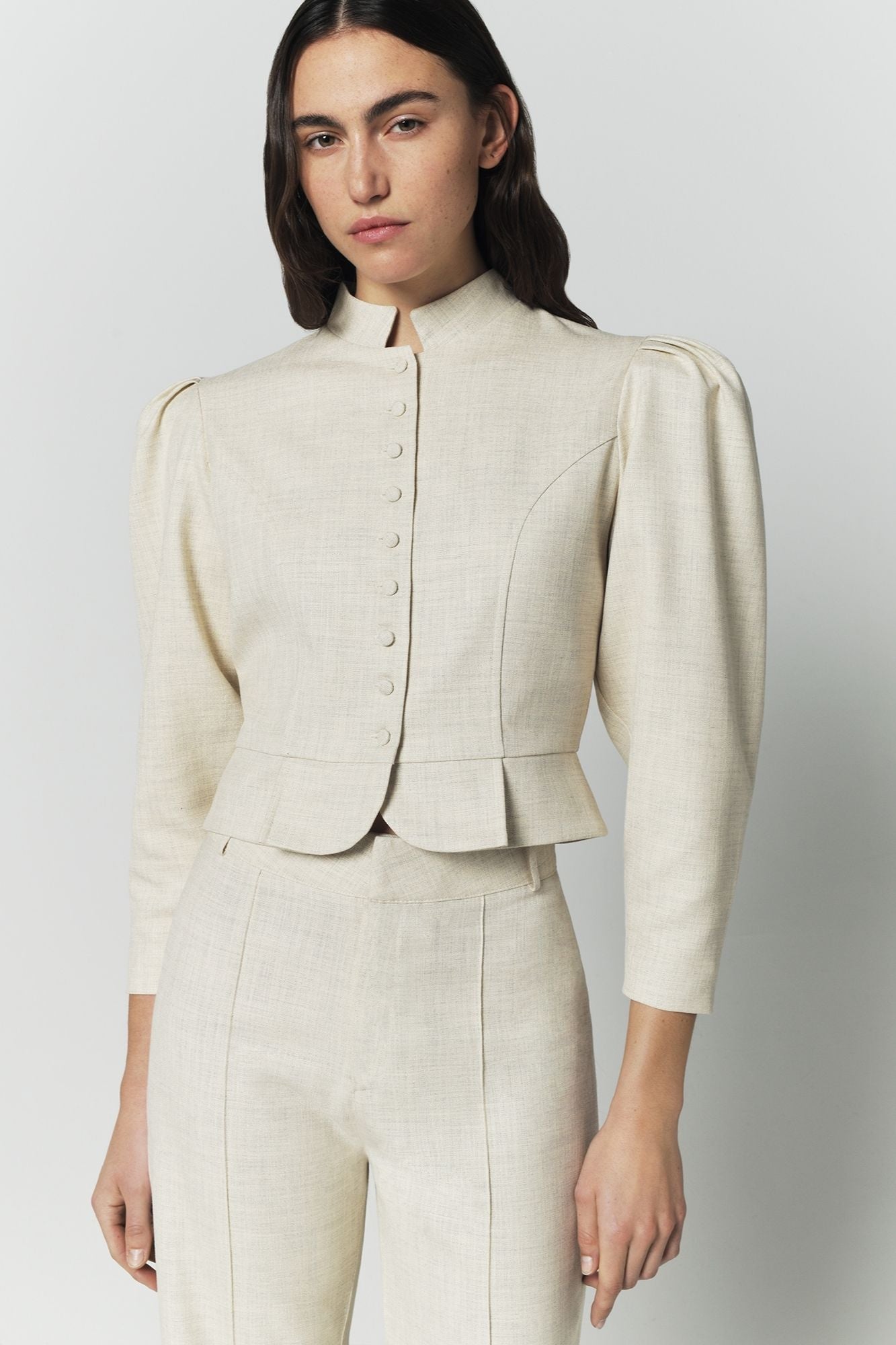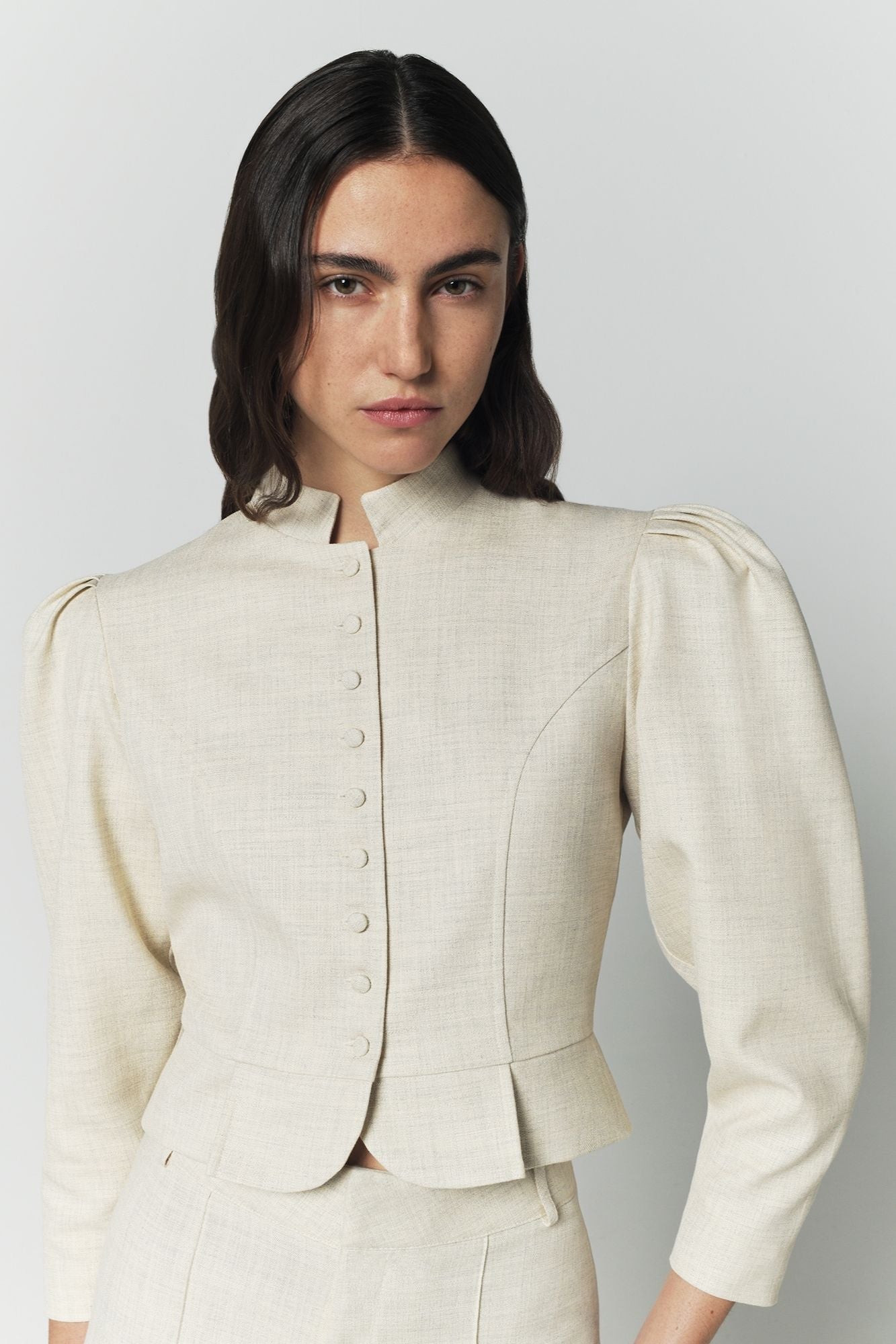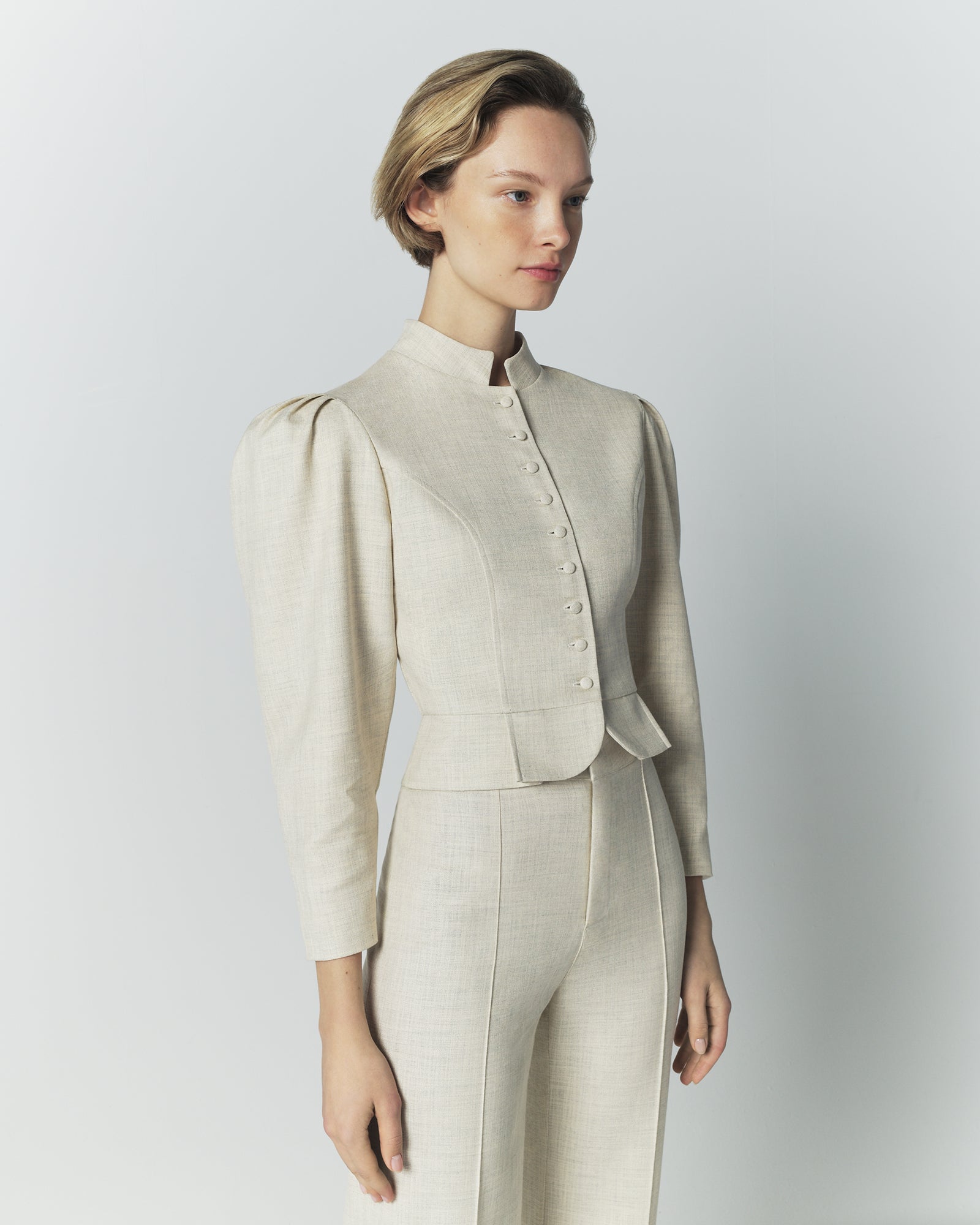 - Cropped structured silhouette with defined waist