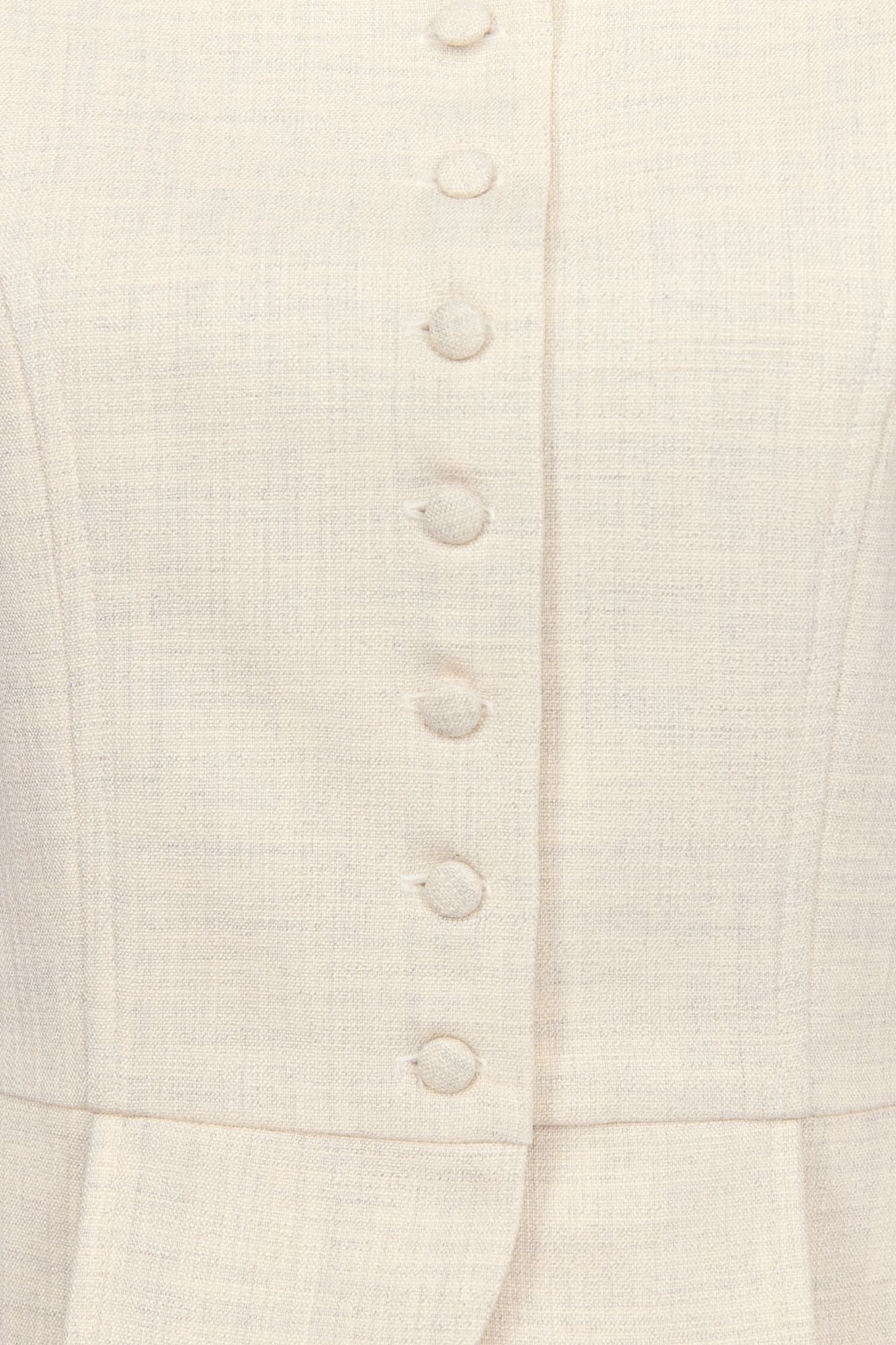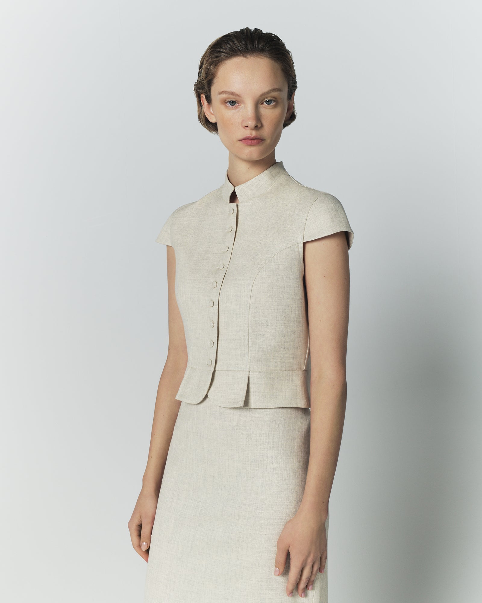 The Amoako Summer Warm Miele top is crafted in a refined fabric blend, offering a light yet structured feel ideal for warm-weather silhouettes. This sleeveless piece features the signature Amoako cropped shape, defined by a fitted waist and subtle pleated detailing that enhance its sculptural line. The mandarin collar and tonal covered buttons add a clean, architectural finish, creating an elegant and modern summer statement.