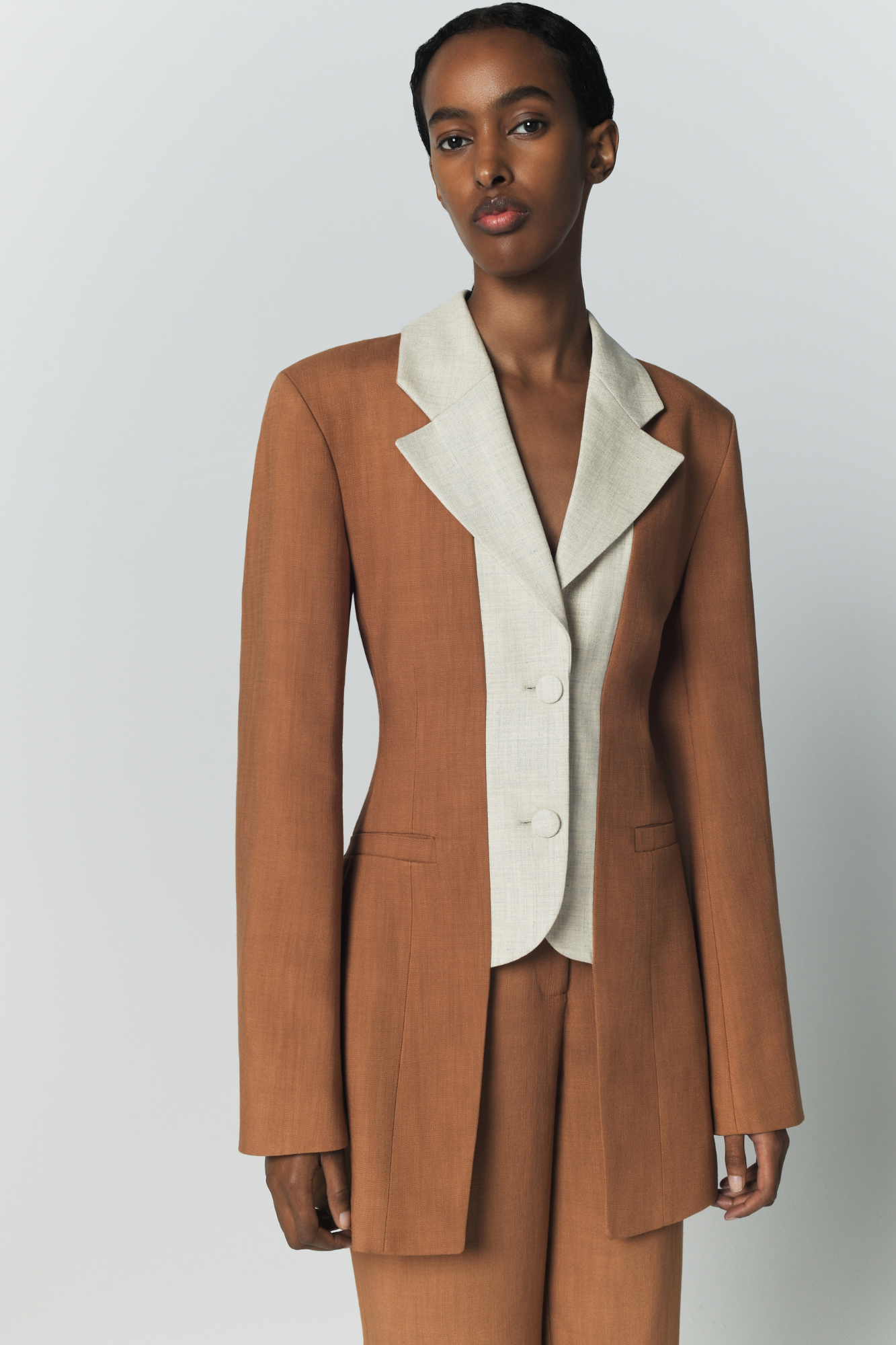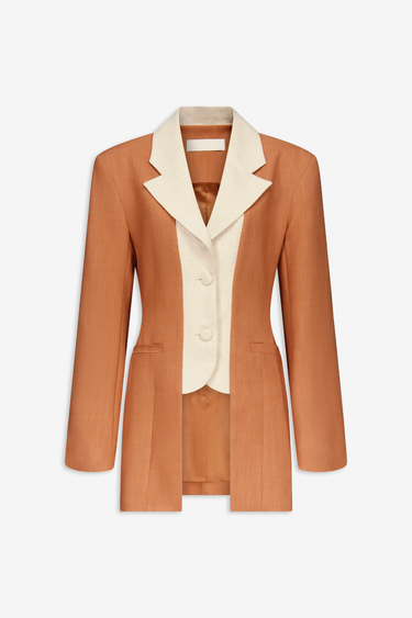 The Two-Tone Summer Jacket is crafted in lightweight fabric featuring a camel base contrasted with a beige lapel and inner panel. Its tailored silhouette is softened by clean lines and subtle detailing, offering an elegant balance between structure and ease.