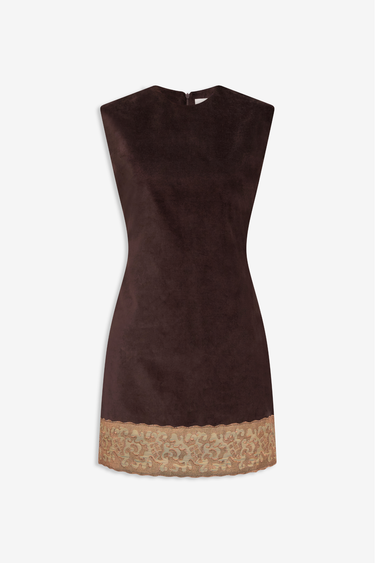 The Carole dress is crafted in rich dark brown velvet, offering a refined balance between softness and structure. Designed with a clean, sleeveless silhouette and a gently fitted shape, it creates an elegant, streamlined line. The contrasting lace trim at the hem adds a delicate decorative finish, enhancing the depth and texture of the velvet.