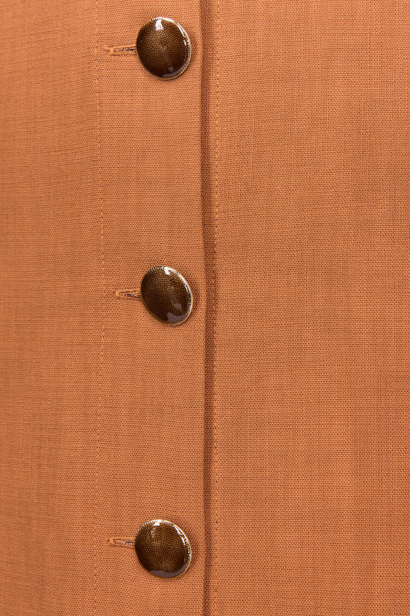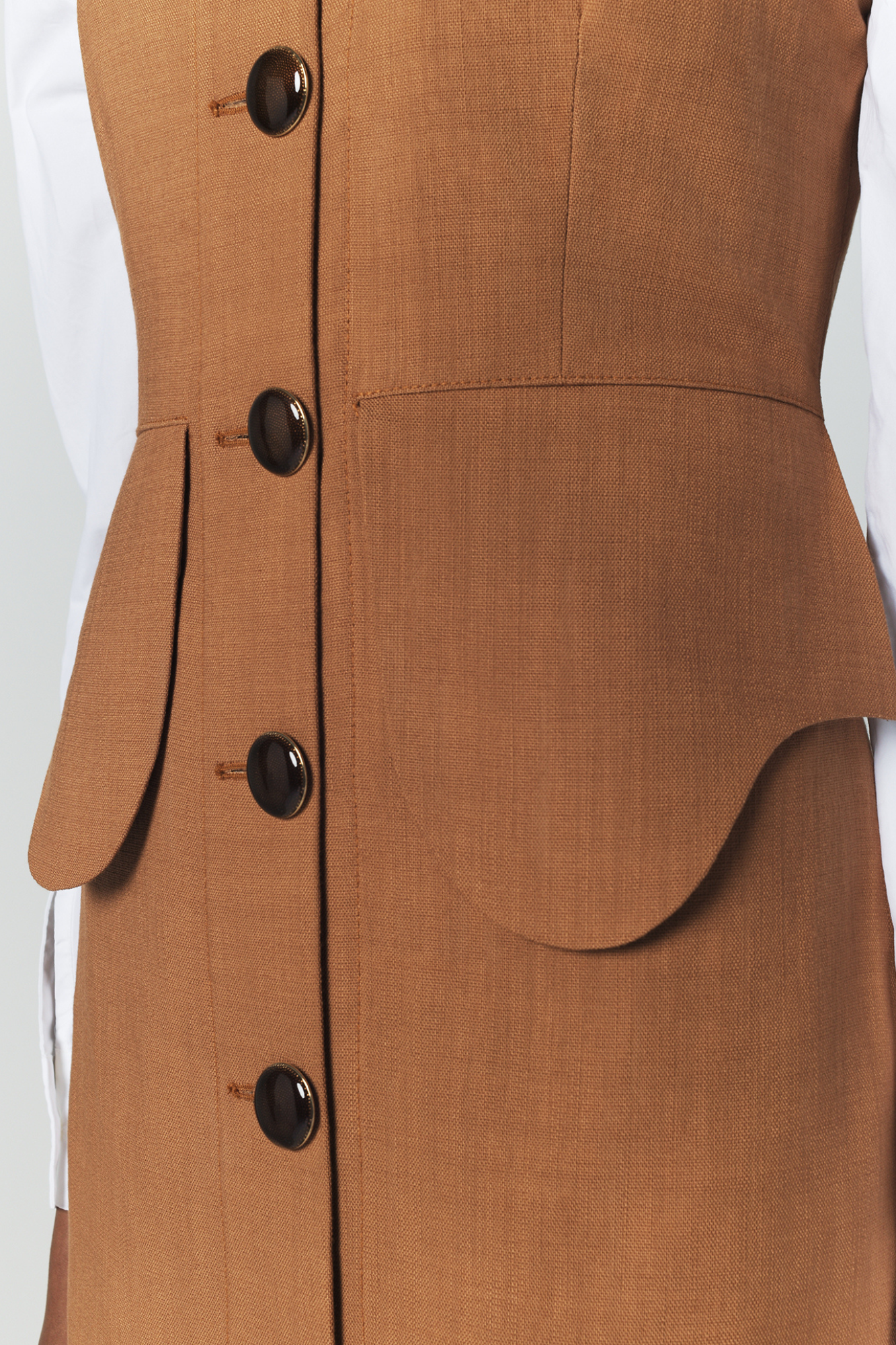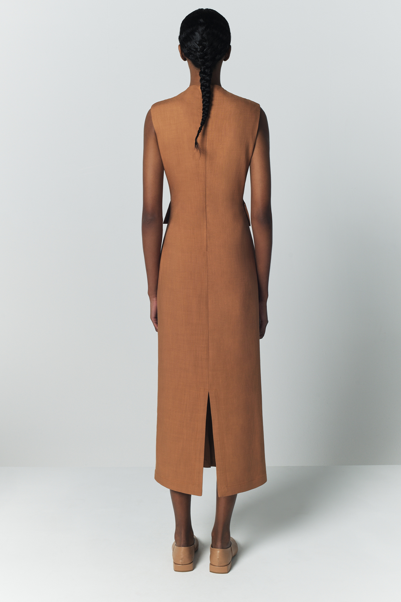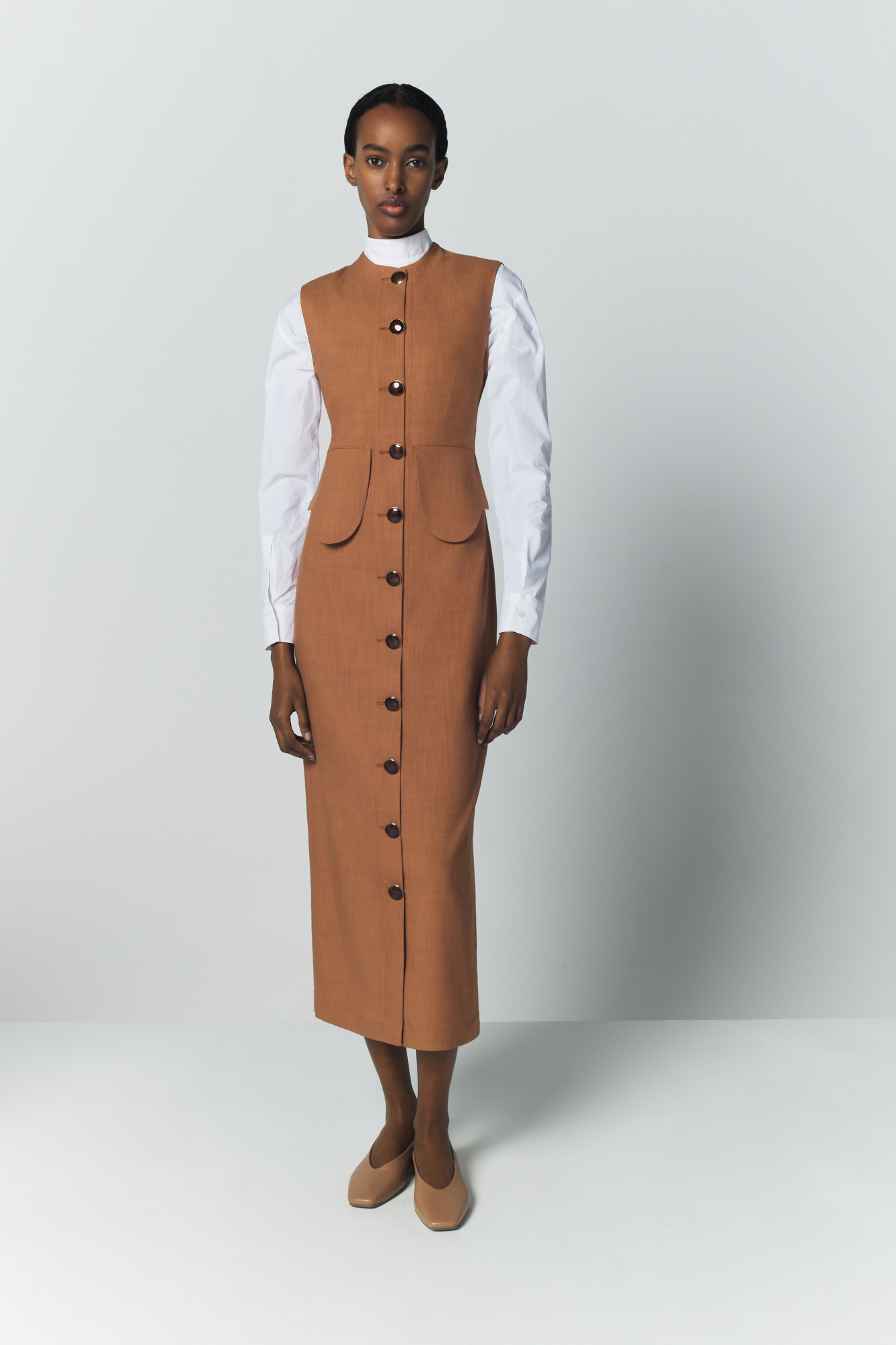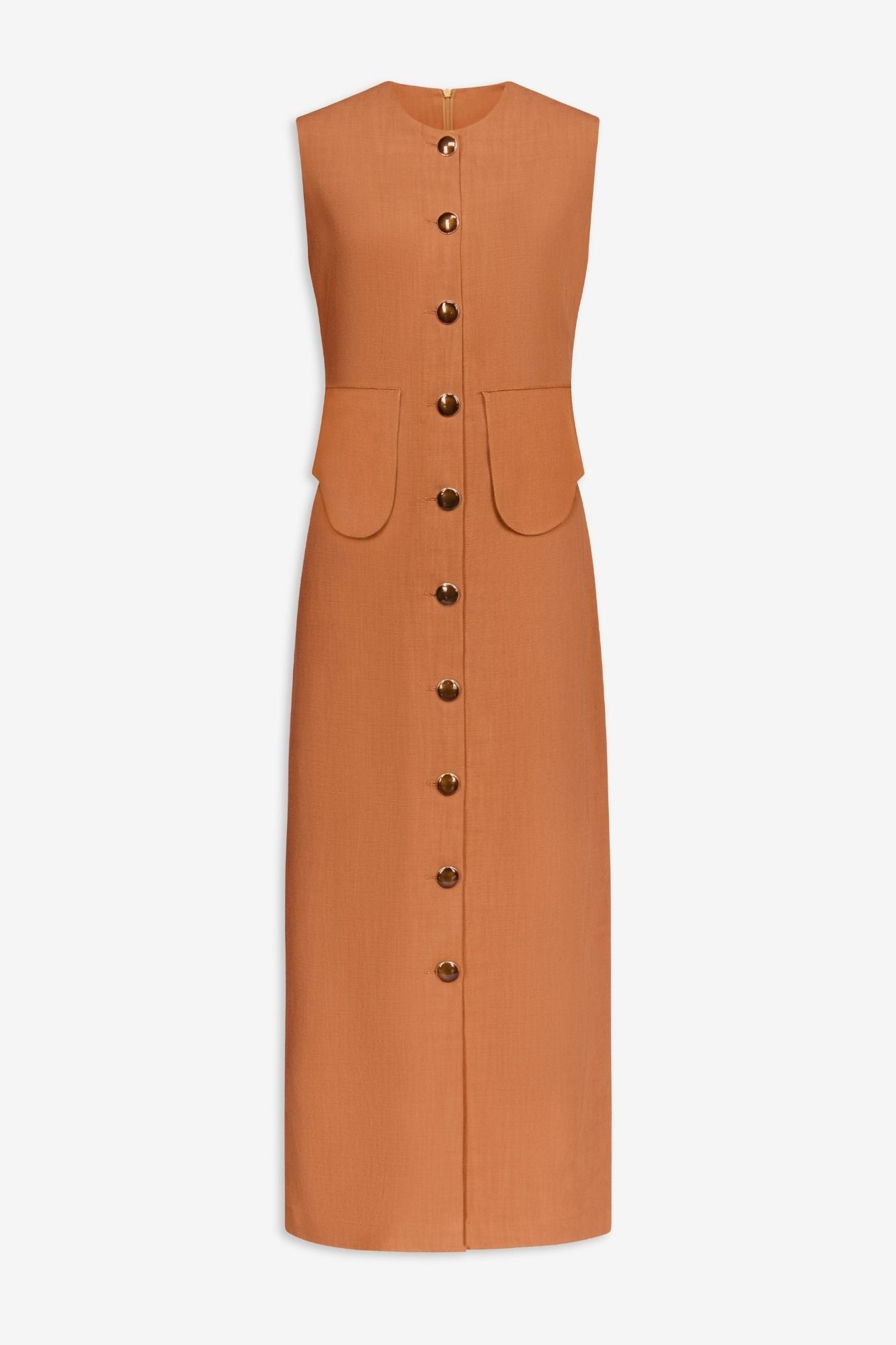The Buttoned Sleeveless Dress is crafted in a warm brown lightweight fabric, defined by a clean, elongated silhouette and refined tailoring. Its minimalist design is enhanced by a row of tonal buttons and softly contoured patch pockets.