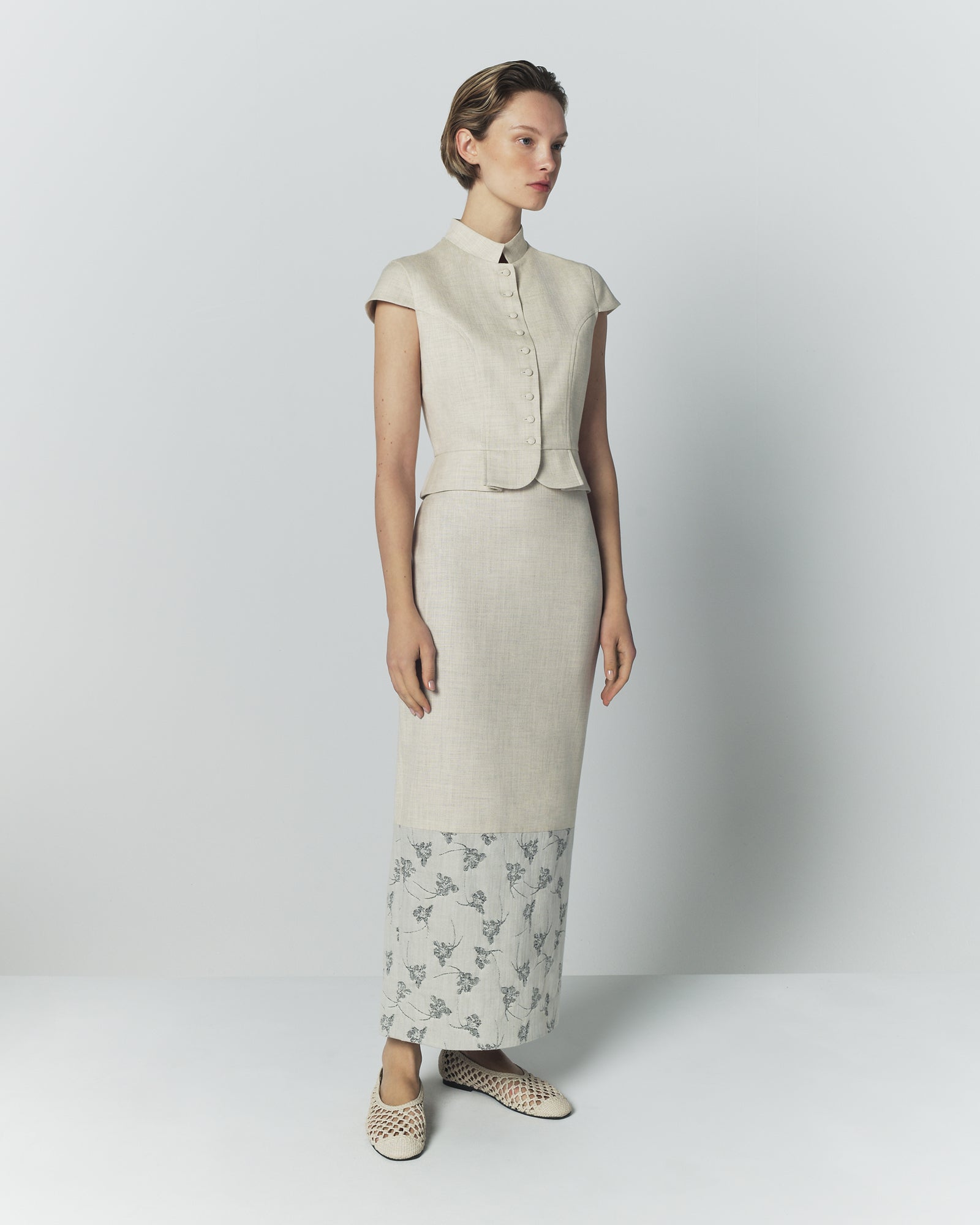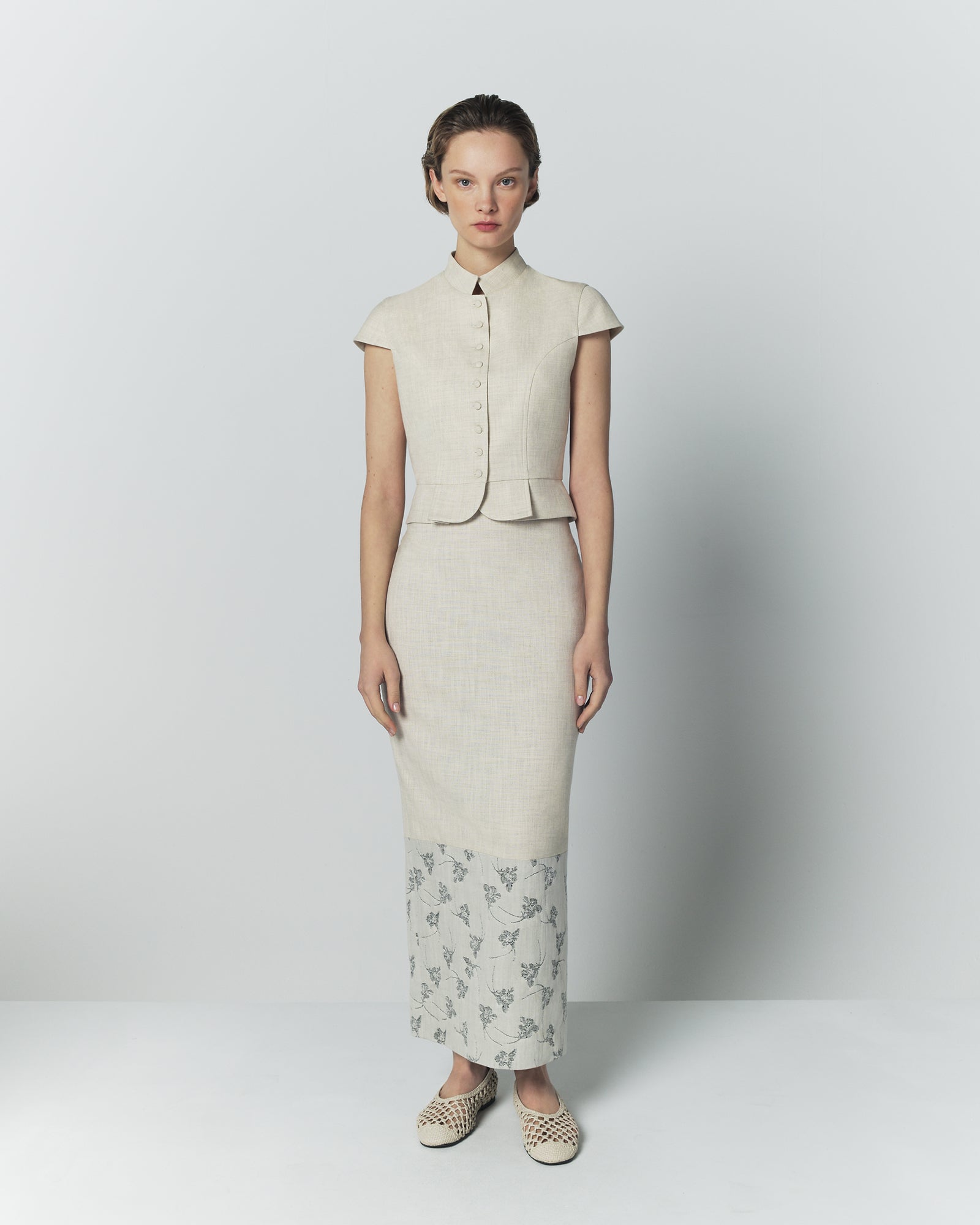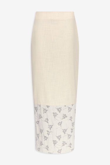 The Mila Duo Miele skirt is crafted in a refined fabric blend, featuring a clean, structured silhouette in warm grey subtly contrasted by a printed hem detail. Its straight, fitted cut creates an elongated and elegant line, while the contrasting panel at the hem introduces a delicate visual accent. Timeless and versatile, the midi length makes it an effortless piece for both day and evening wear.