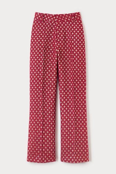 Tailored trousers with a bold red patterned design, enhanced with subtle metallic threads for a refined touch of luminosity.